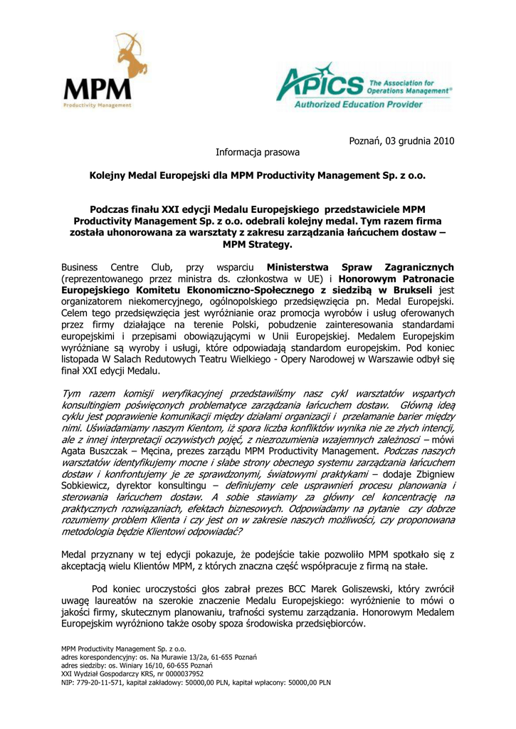 Informacja prasowa Poznań, 03 grudnia 2010 Kolejny Medal Europejski dla MPM Productivity Management Sp. z o.o. Podczas finału XXI edycji Medalu Europejskiego przedstawiciele MPM Productivity Management Sp. z o.o. odebrali kolejny medal. Tym razem firma została uhonorowana za warsztaty z zakresu zarządzania łańcuchem dostaw – MPM Strategy. Business Centre Club, przy wsparciu Ministerstwa Spraw Zagranicznych (reprezentowanego przez ministra ds. członkostwa w UE) i Honorowym Patronacie Europejskiego Komitetu Ekonomiczno-Społecznego z siedzibą w Brukseli jest organizatorem niekomercyjnego, ogólnopolskiego przedsięwzięcia pn. Medal Europejski. Celem tego przedsięwzięcia jest wyróżnianie oraz promocja wyrobów i usług oferowanych przez firmy działające na terenie Polski, pobudzenie zainteresowania standardami europejskimi i przepisami obowiązującymi w Unii Europejskiej. Medalem Europejskim wyróżniane są wyroby i usługi, które odpowiadają standardom europejskim. Pod koniec listopada W Salach Redutowych Teatru Wielkiego - Opery Narodowej w Warszawie odbył się finał XXI edycji Medalu. Tym razem komisji weryfikacyjnej przedstawilśmy nasz cykl warsztatów wspartych konsultingiem poświęconych problematyce zarządzania łańcuchem dostaw. Główną ideą cyklu jest poprawienie komunikacji między działami organizacji i przełamanie barier między nimi. Uświadamiamy naszym Kientom, iż spora liczba konfliktów wynika nie ze złych intencji, ale z innej interpretacji oczywistych pojęć, z niezrozumienia wzajemnych zależnosci – mówi Agata Buszczak – Męcina, prezes zarządu MPM Productivity Management. Podczas naszych warsztatów identyfikujemy mocne i słabe strony obecnego systemu zarządzania łańcuchem dostaw i konfrontujemy je ze sprawdzonymi, światowymi praktykami – dodaje Zbigniew Sobkiewicz, dyrektor konsultingu – definiujemy cele usprawnień procesu planowania i sterowania łańcuchem dostaw. A sobie stawiamy za główny cel koncentrację na praktycznych rozwiązaniach, efektach biznesowych. Odpowiadamy na pytanie czy dobrze rozumiemy problem Klienta i czy jest on w zakresie naszych możliwości, czy proponowana metodologia będzie Klientowi odpowiadać? Medal przyznany w tej edycji pokazuje, że podejście takie pozwoliło MPM spotkało się z akceptacją wielu Klientów MPM, z których znaczna część współpracuje z firmą na stałe. Pod koniec uroczystości głos zabrał prezes BCC Marek Goliszewski, który zwrócił uwagę laureatów na szerokie znaczenie Medalu Europejskiego: wyróżnienie to mówi o jakości firmy, skutecznym planowaniu, trafności systemu zarządzania. Honorowym Medalem Europejskim wyróżniono także osoby spoza środowiska przedsiębiorców. MPM Productivity Management Sp. z o.o. adres korespondencyjny: os. Na Murawie 13/2a, 61-655 Poznań adres siedziby: os. Winiary 16/10, 60-655 Poznań XXI Wydział Gospodarczy KRS, nr 0000037952 NIP: 779-20-11-571, kapitał zakładowy: 50000,00 PLN, kapitał wpłacony: 50000,00 PLN MPM Productivity Management sp. z o.o. to firma szkoleniowo-konsultingowa, specjalizująca się w doradztwie i szkoleniach z zakresu zarządzania łańcuchem dostaw oraz zarządzania produkcją i logistyką w procesie tworzenia wartości dodanej. Firma istnieje od 12 lat i zatrudnia obecnie 7 konsultantów. Oferta MPM Productivity Management obejmuje szeroki zakres usług w ramach kilku głównych obszarów merytorycznych: Certyfikacja w Zarządzaniu Produkcją i Zapasami wg standardów APICS, Profesjonalne Zarządzanie Zakupami (PPM), Prognozowanie i Zarządzanie Popytem (FCST), Koordynator Total Productive Maintenance (TPM), Lean Manufacturing (Gemba Kaizen). Autorskimi rozwiązaniami firmy są programy FCST, , PPM, i oraz MPM Strategy, cykl zamkniętych warsztatów dostosowanych do specyfiki klienta, którego celem jest przełamanie barier w komunikacji między działami organizacji. Firma jest laureatem XX edycji Medalu Europejskiego dla Usług dzięki szkoleniom CPIM według standardów APICS. MPM Productivity Management jest przedstawicielem APICS (The Association for Operations Management) jako AEP (Authorized Educational Provider), jedynym w Polsce i pierwszym w Europie Srodkowo - Wschodniej oraz jest członkiem założycielem Polskiej Izby Firm Szkoleniowych. Więcej informacji: www.mpm24.com Dodatkowych informacji udzielają: Agata Buszczak - Męcina, tel: (61) 82 09 267, kom: 0 501 528 509, e-mail: [email protected] MPM Productivity Management Sp. z o.o. adres korespondencyjny: os. Na Murawie 13/2a, 61-655 Poznań adres siedziby: os. Winiary 16/10, 60-655 Poznań XXI Wydział Gospodarczy KRS, nr 0000037952 NIP: 779-20-11-571, kapitał zakładowy: 50000,00 PLN, kapitał wpłacony: 50000,00 PLN