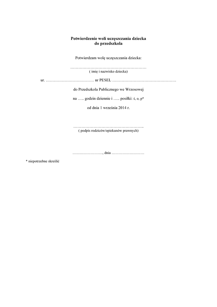 Potwierdzenie woli uczęszczania dziecka do przedszkola Potwierdzam wolę uczęszczania dziecka: ………………………………………………… ( imię i nazwisko dziecka) ur. ……………………………… nr PESEL ………………………………………… do Przedszkola Publicznego we Wrzosowej na ….. godzin dziennie i ….. posiłki: ś, o, p* od dnia 1 września 2014 r. …………………………………………….. ( podpis rodziców/opiekunów prawnych) ……………………., dnia ……………………… * niepotrzebne skreślić