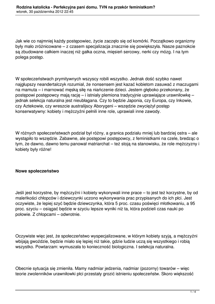 Rodzina katolicka - Perfekcyjna pani domu. TVN na przekór feministkom? wtorek, 30 października 2012 22:45 Jak wie co najmniej każdy postępowiec, życie zaczęło się od komórki. Początkowo organizmy były mało zróżnicowane – z czasem specjalizacja znacznie się powiększyła. Nasze paznokcie są zbudowane całkiem inaczej niż gałka oczna, mięsień sercowy, nerki czy mózg. I na tym polega postęp. W społeczeństwach prymitywnych wszyscy robili wszystko. Jednak dość szybko nawet najgłupszy neandertalczyk rozumiał, że nonsensem jest kazać kobietom zasuwać z maczugami na mamuta – i marnować męską siłę na niańczenie dzieci. Jestem głęboko przekonany, że postępowi postępowcy mają rację – i istniały plemiona tradycyjnie uprawiające urawniłowkę – jednak selekcja naturalna jest nieubłagana. Czy to będzie Japonia, czy Europa, czy Inkowie, czy Aztekowie, czy wreszcie australijscy Aborygeni – wszędzie zwyciężył postęp konserwatywny: kobiety i mężczyźni pełnili inne role, uprawiali inne zawody. W różnych społeczeństwach podział był różny, a granica podziału mniej lub bardziej ostra – ale wystąpiło to wszędzie. Zabawne, ale postępowi postępowcy, z feministkami na czele, bredząc o tym, że dawno, dawno temu panował matriarchat – też stoją na stanowisku, że role mężczyzny i kobiety były różne! Nowe społeczeństwo Jeśli jest korzystne, by mężczyźni i kobiety wykonywali inne prace – to jest też korzystne, by od maleńkości chłopców i dziewczynki uczono wykonywania prac przypisanych do ich płci. Jest oczywiste, że lepiej szyć będzie dziewczynka, która 5 proc. czasu poświęci młotkowaniu, a 95 proc. szyciu – osiągać będzie w szyciu lepsze wyniki niż ta, która podzieli czas nauki po połowie. Z chłopcami – odwrotnie. Oczywiste więc jest, że społeczeństwo wyspecjalizowane, w którym kobiety szyją, a mężczyźni wbijają gwoździe, będzie miało się lepiej niż takie, gdzie ludzie uczą się wszystkiego i robią wszystko. Powtarzam: wymuszała to konieczność biologiczna. I selekcja naturalna. Obecnie sytuacja się zmieniła. Mamy nadmiar jedzenia, nadmiar (pozorny) towarów – więc teorie zwolenników urawniłowki płci przestały grozić istnieniu społeczeństw. Skoro większość 1/4 Rodzina katolicka - Perfekcyjna pani domu. TVN na przekór feministkom? wtorek, 30 października 2012 22:45 towarów projektują komputery, a wykonują roboty – różnica między społeczeństwami dobrze zorganizowanymi a społeczeństwami prymitywnymi przestała być tak istotna. W tym przynajmniej sensie, że nie grozi katastrofa w ciągu 10 lat. Jednak różnica, acz mniej istotna, pozostaje. Tyle że do katastrofy dojdzie nie po 10, a na przykład po 50 latach. Bo nawet mała różnica kumuluje się z pokolenia na pokolenie. Społeczeństwa w Europie osiągnęły takie wyżyny dobrobytu materialnego, że gotowe są poświęcić szanse dalszego bogacenia się w imię „ideału” Równości. Postępowi postępowcy mówią to otwarcie: lepiej nawet zginąć, byle równouprawnienie płci było przestrzegane! Kilka razy na spotkaniach ze studentami – gdzie przecież nie siedzą idioci – zdarzyło mi się zapalczywe feministki pytać: „Przylatują na Ziemie Marsjanie i mówią nam tak: obserwujemy Was 100 lat, mamy znakomite teleskopy. Ziemia nam się podoba, więc uchwaliliśmy, że wytłuczemy wszystkie zwierzęta i zamieszkamy na niej sami. Jednak zauważyliśmy, dzięki rozmaitym turniejom na świeżym powietrzu, że Wy gracie w szachy! Nauczyliśmy się reguł tej gry i przyszło nam do głowy, że może Ziemię zamieszkują nie tylko zwierzęta, ale i istoty inteligentne, równe nam. Mamy więc propozycję, której warunki nie podlegają negocjacji: robimy mecz szachowy na 100 szachownicach – Marsjanie kontra Ziemianie. Możecie wystawić do tego meczu drużynę złożoną (a) z samych kobiet, (b) z samych mężczyzn (c ), z 50 mężczyzn i 50 kobiet. Jeśli wygracie lub zremisujecie – zawieramy z wami przymierze jako z Braćmi w Rozumie. Jeżeli przegracie – mamy bardzo dobry środek, który w pół godziny wytruje wszelkie ssaki, gady i płazy, a i część innych zwierząt takoż. Mecz odbędzie się pojutrze o 12.00 na Strahovským stadionie (Marsjanie – w odróżnieniu od Ziemian – wiedzą, który stadion na Ziemi jest największy!). Którą opcję Pani wybiera?”. Proszę sobie wyobrazić: te feministki nieodmiennie wybierały opcje 50/50. Trzeba dodać, że mniej więcej w połowie przypadków dlatego, iż były przekonane, że w pierwszej setce najlepszych szachistów jest połowa kobiet (na ogół jest jedna, czasem dwie, a czasem nie ma żadnej). Jednak pozostałe uważały, że lepiej zginąć zatrute marsjańskim preparatem niż uchybić zasadzie parytetu! Socjaliści nie są ludźmi Jednakże 99 proc. kobiet (feministki NIE są kobietami – podobnie jak socjaliści NIE są ludźmi!) jest innego zdania… Socjalistom kończą się pieniądze. Np. TVN robi bokami. Po latach wciskania kobietom i nam kitu, że tylko równouprawnienie, w pogoni za pieniędzmi TVN zaczęła znacząco zmieniać ton. Najpierw pojawił się program p. Magdy Gesslerowej, która skierowała uwagę ludzi na gotowanie. No, ale to można było tłumaczyć: kobieta supermenadżerem. Wiadomo, że najlepszymi kucharzami są mężczyźni – ale lepsza od nich jest kobieta! Jednak 2/4 Rodzina katolicka - Perfekcyjna pani domu. TVN na przekór feministkom? wtorek, 30 października 2012 22:45 na tym się nie skończyło. W zeszłym sezonie w TVN Style pojawił się nowy program, zatytułowany „Perfekcyjna Pani Domu”. Zdobył on tak dużą popularność, że jesienią znalazł się w ramówce TVN, a gospodyni programu, p. Małgorzata Rozenkowa, stała się główną celebrytką, królującą we wszystkich portalach plotkarskich. Pani Rozenkowa okazała się idolką młodych kobiet, pragnących per