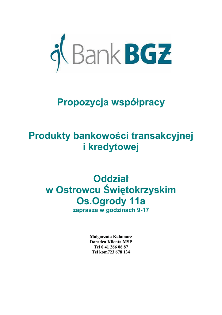 Propozycja współpracy Produkty bankowości transakcyjnej i kredytowej Oddział w Ostrowcu Świętokrzyskim Os.Ogrody 11a zaprasza w godzinach 9-17 Małgorzata Kałamarz Doradca Klienta MSP Tel 0 41 266 06 87 Tel kom723 678 134 Propozycja współpracy Informacje o Banku Bank BGś od lat naleŜy do dziesiątki największych polskich banków komercyjnych. Dzięki ponad 30letniemu doświadczeniu oraz rozbudowanej sieci placówek, Bank BGś z sukcesami świadczy usługi dla swoich Klientów z segmentu duŜych przedsiębiorstw, małych i średnich firm oraz dla ponad miliona Klientów indywidualnych. Europejski Bank Odbudowy i Rozwoju; 12,87% Skarb Państwa; 37,32% Inne osoby prawne i fizyczne; 3,94% Rabobank International Holding B.V.; 45,87% Od 1994 roku Bank BGś jest spółką akcyjną, a od grudnia 2004 roku akcjonariuszami Banku są obok Skarbu Państwa, holenderski Rabobank International Holding B.V. oraz Europejski Bank Odbudowy i Rozwoju. Instytucje zaangaŜowały się w transformację banku poprzez bliską współpracę w zakresie opracowania strategii biznesowej oraz zrestrukturyzowania działalności operacyjnej. Struktura akcjonariatu Banku BGś wg stanu na 14.08.2007 r. Bank BGś posiada sieć 250 placówek na terenie całego kraju oraz prawie 2050 bankomatów, w których Klienci mogą bezprowizyjnie wypłacać gotówkę m.in. dzięki porozumieniom z Bankiem Polskiej Spółdzielczości S.A., Mazowieckim Bankiem Regionalnym, Kredyt Bankiem i Invest Bankiem. Kontakt Klientów z bankiem zapewniają nowoczesne systemy bankowości elektronicznej i telefonicznej. Rabobank International Holding B.V. Rabobank International Holding B.V. wchodzi w skład Grupy Rabobank – największej i najszybciej rozwijającej się instytucji finansowej w Holandii i 16. pod względem wielkości na świecie. Rabobank posiada najwyŜszy rating bezpieczeństwa i wiarygodności (AAA). Rabobank świadczy profesjonalne usługi bankowe, jak operacje na rynkach kapitałowych czy operacje skarbowe. Bank jest liderem rynku kredytów hipotecznych w Holandii, a jednocześnie specjalizuje się w finansowaniu rolnictwa i sektora przetwórstwa rolno-spoŜywczego. Europejski Bank Odbudowy i Rozwoju Europejski Bank Odbudowy i Rozwoju został załoŜony w 1991 roku, aby wspierać przemiany wolnorynkowe i demokratyczne w krajach Europy Środkowej i Wschodniej oraz Środkowej Azji. Bank skupia obecnie 60 państw oraz Wspólnotę Europejską i Europejski Bank Inwestycyjny. _____________________________ Wysoką jakość usług oferowanych przez Bank BGś potwierdzają liczne nagrody i wyróŜnienia. Corocznie wielu oddziałom banku przyznawane są Godła promocyjne Złoty Oddział – Bank Przyjazny dla Przedsiębiorców. System Eurobank On-line został doceniony w konkursie „Gazety Bankowej” na najlepszy projekt informatyczny. Z kolei serwis internetowy Banku BGś zwycięŜył 2 Propozycja współpracy w rankingu miesięcznika „Home&Market” na najlepszą bankową stronę internetową. W październiku 2006 Bank BGś został laureatem Konkursu Mecenas Kultury. Rachunki Rachunki bankowe Bank BGś oferuje prowadzenie rachunków bankowych w PLN, EUR, USD, GBP i CHF. Prowadzone przez Bank BGś rachunki bankowe umoŜliwiają swobodne i wygodne przeprowadzanie rozliczeń, jak równieŜ atrakcyjne lokowanie nadwyŜek finansowych. W zaleŜności od Państwa potrzeb oraz oczekiwań i charakteru prowadzonej działalności, bank oferuje otwarcie i prowadzenie rachunków rozliczeniowych (bieŜących i pomocniczych) w złotych i w walutach wymienialnych. Posiadając rachunek w Banku BGś uzyskują Państwo: wygodny dostęp do szerokiej gamy usług rozliczeniowych banku np.: przelewy krajowe i zagraniczne, w tym przelewy pilne i wysokokwotowe realizowane za pośrednictwem systemu SORBNET, stałe zlecenia płatnicze, polecenie zapłaty, natychmiastowe transakcje wymiany walutowej i operacje gotówkowe, łatwy dostęp do instrumentów wspierających zarządzanie płynnością, takich jak lokaty oraz kredyt w rachunku bieŜącym, dostęp do rachunku poprzez oddziały oraz system bankowości internetowej eBGś Firma, Home Banking i system bankowości telefonicznej TeleBGś, niskie koszty obsługi rachunku. Operacje gotówkowe Dzięki szerokiej sieci dostępu do placówek Bank umoŜliwia swoim Klientom: wypłaty w kasie oddziału Banku BGś lub za pośrednictwem bankomatów, wpłaty otwarte w oddziałach Banku BGś - uznanie rachunku następuje zaraz po dokonaniu przeliczenia środków Klienta przez pracownika Banku, wpłaty w formie zamkniętej, dokonane w kasie oddziału Banku - uznanie rachunku następuje tego samego dnia, w którym została dokonana wpłata i rejestrowana jest na rachunku Klienta kwotą deklarowaną wskazaną na bankowym dowodzie wpłaty, wszelkie róŜnice (nadwyŜki, niedobory, falsyfikaty) rozliczane i księgowane są w ciągu 6 dni roboczych licząc od następnego dnia od dokonania wpłaty zamkniętej, wpłaty w formie zamkniętej, dokonane do wrzutni nocnej – uznanie rachunku następuje tego samego dnia, jeśli wpłata została dokonana do godziny 7 rano w dzień roboczy i rejestrowana jest na rachunku Klienta kwotą deklarowaną wskazaną na bankowym dowodzie wpłaty. Wszelkie róŜnice (nadwyŜki, niedobory, falsyfikaty) rozliczane i księgowane są w ciągu 6 dni roboczych od dnia dokonania wpłaty zamkniętej. Konwojowanie wartości pienięŜnych Usługa umoŜliwia Klientom bezpośredni odbiór, ewentualnie dowóz wpłat gotówkowych w formie zamkniętej (spakowanych w tzw. bezpieczną kopertę). Transport gotówki odbywa się pod ochroną, przez wyspecjalizowaną firmę z/do jednostki handlowej Klienta bezpośrednio do/z oddziału Banku lub oddziału Banku wyposaŜonego we wrzutnie. Warunkiem skorzystania z usługi konwojowania wartości pienięŜnych jest posiadanie rachunku bieŜącego w Banku przez Klienta. 3 Propozycja współpracy Pakiety dla Firm Bank BGś wychodząc naprzeciw zróŜnicowanym pot