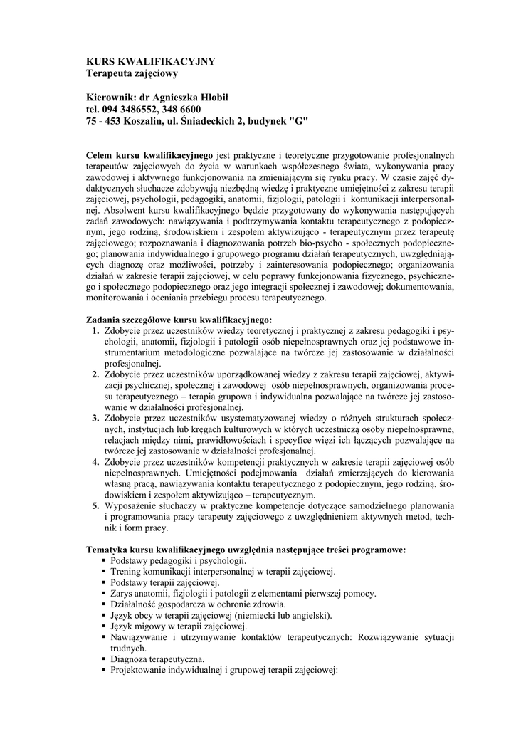 KURS KWALIFIKACYJNY Terapeuta zajęciowy Kierownik: dr Agnieszka Hłobił tel. 094 3486552, 348 6600 75 - 453 Koszalin, ul. Śniadeckich 2, budynek "G" Celem kursu kwalifikacyjnego jest praktyczne i teoretyczne przygotowanie profesjonalnych terapeutów zajęciowych do życia w warunkach współczesnego świata, wykonywania pracy zawodowej i aktywnego funkcjonowania na zmieniającym się rynku pracy. W czasie zajęć dydaktycznych słuchacze zdobywają niezbędną wiedzę i praktyczne umiejętności z zakresu terapii zajęciowej, psychologii, pedagogiki, anatomii, fizjologii, patologii i komunikacji interpersonalnej. Absolwent kursu kwalifikacyjnego będzie przygotowany do wykonywania następujących zadań zawodowych: nawiązywania i podtrzymywania kontaktu terapeutycznego z podopiecznym, jego rodziną, środowiskiem i zespołem aktywizująco - terapeutycznym przez terapeutę zajęciowego; rozpoznawania i diagnozowania potrzeb bio-psycho - społecznych podopiecznego; planowania indywidualnego i grupowego programu działań terapeutycznych, uwzględniających diagnozę oraz możliwości, potrzeby i zainteresowania podopiecznego; organizowania działań w zakresie terapii zajęciowej, w celu poprawy funkcjonowania fizycznego, psychicznego i społecznego podopiecznego oraz jego integracji społecznej i zawodowej; dokumentowania, monitorowania i oceniania przebiegu procesu terapeutycznego. Zadania szczegółowe kursu kwalifikacyjnego: 1. Zdobycie przez uczestników wiedzy teoretycznej i praktycznej z zakresu pedagogiki i psychologii, anatomii, fizjologii i patologii osób niepełnosprawnych oraz jej podstawowe instrumentarium metodologiczne pozwalające na twórcze jej zastosowanie w działalności profesjonalnej. 2. Zdobycie przez uczestników uporządkowanej wiedzy z zakresu terapii zajęciowej, aktywizacji psychicznej, społecznej i zawodowej osób niepełnosprawnych, organizowania procesu terapeutycznego – terapia grupowa i indywidualna pozwalające na twórcze jej zastosowanie w działalności profesjonalnej. 3. Zdobycie przez uczestników usystematyzowanej wiedzy o różnych strukturach społecznych, instytucjach lub kręgach kulturowych w których uczestniczą osoby niepełnosprawne, relacjach między nimi, prawidłowościach i specyfice więzi ich łączących pozwalające na twórcze jej zastosowanie w działalności profesjonalnej. 4. Zdobycie przez uczestników kompetencji praktycznych w zakresie terapii zajęciowej osób niepełnosprawnych. Umiejętności podejmowania działań zmierzających do kierowania własną pracą, nawiązywania kontaktu terapeutycznego z podopiecznym, jego rodziną, środowiskiem i zespołem aktywizująco – terapeutycznym. 5. Wyposażenie słuchaczy w praktyczne kompetencje dotyczące samodzielnego planowania i programowania pracy terapeuty zajęciowego z uwzględnieniem aktywnych metod, technik i form pracy. Tematyka kursu kwalifikacyjnego uwzględnia następujące treści programowe: Podstawy pedagogiki i psychologii. Trening komunikacji interpersonalnej w terapii zajęciowej. Podstawy terapii zajęciowej. Zarys anatomii, fizjologii i patologii z elementami pierwszej pomocy. Działalność gospodarcza w ochronie zdrowia. Język obcy w terapii zajęciowej (niemiecki lub angielski). Język migowy w terapii zajęciowej. Nawiązywanie i utrzymywanie kontaktów terapeutycznych: Rozwiązywanie sytuacji trudnych. Diagnoza terapeutyczna. Projektowanie indywidualnej i grupowej terapii zajęciowej: - Planowanie działań terapeutycznych. - Metodyka terapii zajęciowej. - Organizowanie pracy w pracowni terapii zajęciowej. Prowadzenie terapii zajęciowej: - Wykonywanie prac plastyczno – technicznych – arteterapia. - Organizowanie czasu wolnego podopiecznym – socjoterapia. - Prowadzenie indywidualnej i grupowej terapii zajęciowej – ergoterapia. - Prowadzenie zajęć z zakresu kinezyterapii. Dokumentowanie terapii zajęciowej: Opracowywanie narzędzi diagnostycznych i ewaluacyjnych. Komputerowe wspomaganie działalności terapeuty zajęciowego. Proces terapeutyczny i jego składowe w terapii zajęciowej – studium indywidualnych przypadków. Założenia organizacyjne: 1. Kurs kwalifikacyjny trwa 2 semestry. 2. Program przewiduje 280 godzin wykładów, ćwiczeń, treningów i zajęć warsztatowych). Praktyki zawodowe w wymiarze 160 godzin. 3. Absolwenci kursu kwalifikacyjnego otrzymują: Dyplom ukończenia kursu kwalifikacyjnego. Absolwenci kwalifikacje do wykonywania zawodu terapeuty zajęciowego. 4. Wymagania wstępne: Wykształcenie wyższe magisterskie lub licencjackie. Adresatami są pracownicy WTZ, ŚDS, DPS, pracownicy ośrodków terapeutyczno – rehabilitacyjnych, osoby pracujące w zawodach: instruktora terapii zajęciowej, terapeuty zajęciowego, asystenta osoby niepełnosprawnej, opiekuna osoby starszej i niepełnosprawnej, które nie mają wymaganych kwalifikacji, ani przyuczenia zawodowego. 5. Wymagane dokumenty: odpis dyplomu ukończenia studiów wyższych, podanie, kwestionariusz osobowy, 2 zdjęcia. 6. Opłata za kurs kwalifikacyjny w roku akademickim 2016 / 2017 wynosi 1200 zł za semestr. Dokumenty można przesyłać listem poleconym na adres: Politechnika Koszalińska Wydział Technologii i Edukacji ul. Śniadeckich 2, 75 - 453 Koszalin lub złożyć w Sekretariacie Wydziału na ul. Śniadeckich 2 , budynek "H" pok. 106-2 lub budynek „G” pok. 107-10