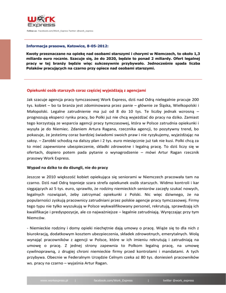 Follow us: Facebook.com/Work_Express Twitter: @work_express Informacja prasowa, Katowice, 8-05-2012: Kwoty przeznaczane na opiekę nad osobami starszymi i chorymi w Niemczech, to około 1,3 miliarda euro rocznie. Szacuje się, że do 2020, będzie to ponad 2 miliardy. Ofert legalnej pracy w tej branży będzie więc sukcesywnie przybywało. Jednocześnie spada liczba Polaków pracujących na czarno przy opiece nad osobami starszymi. Opiekunki osób starszych coraz częściej wyjeżdżają z agencjami Jak szacuje agencja pracy tymczasowej Work Express, dziś nad Odrą nielegalnie pracuje 200 tys. kobiet – bo ta branża jest zdominowana przez panie – głównie ze Śląska, Wielkopolski i Małopolski. Legalne zatrudnienie ma już od 8 do 10 tys. Te liczby jednak wzrosną – prognozują eksperci rynku pracy, bo Polki już nie chcą wyjeżdżać do pracy na dziko. Zamiast tego korzystają ze wsparcia agencji pracy tymczasowej, która w Polsce zatrudnia opiekunki i wysyła je do Niemiec. Zdaniem Artura Ragana, rzecznika agencji, to pozytywny trend, bo pokazuje, że jesteśmy coraz bardziej świadomi swoich praw i nie ryzykujemy, wyjeżdżając na saksy. – Zarobki schodzą na dalszy plan i 2 tys. euro miesięcznie już tak nie kusi. Polki chcą za to mieć zapewnione ubezpieczenie, składki zdrowotne i legalną pracę. To dziś liczy się w ofertach, dopiero potem pada pytanie o wynagrodzenie – mówi Artur Ragan rzecznik prasowy Work Express. Wypad na dziko to do dżungli, nie do pracy Jeszcze w 2010 większość kobiet opiekująca się seniorami w Niemczech pracowała tam na czarno. Dziś nad Odrą topnieje szara strefa opiekunek osób starszych. Widmo kontroli i kar sięgających aż 5 tys. euro, sprawiło, że rodziny niemieckich seniorów zaczęły szukać nowych, legalnych rozwiązań, żeby zatrzymać opiekunki z Polski. Nic więc dziwnego, że na popularności zyskują pracownicy zatrudniani przez polskie agencje pracy tymczasowej. Firmy tego typu nie tylko wyszukują w Polsce wykwalifikowany personel, rekrutują, sprawdzają ich kwalifikacje i predyspozycje, ale co najważniejsze – legalnie zatrudniają. Wyręczając przy tym Niemców. - Niemieckie rodziny i domy opieki niechętnie dają umowy o pracę. Wiąże się to dla nich z biurokracją, dodatkowym kosztem ubezpieczenia, składek zdrowotnych, emerytalnych. Wolą wynająć pracowników z agencji w Polsce, które w ich imieniu rekrutują i zatrudniają na umowę o pracę. Z jednej strony zapewnia to Polkom legalną pracę, na umowę cywilnoprawną, z drugiej chroni niemieckie firmy przed kontrolami i mandatami. A tych przybywa. Obecnie w Federalnym Urzędzie Celnym czeka aż 80 tys. doniesień pracowników ws. pracy na czarno – wyjaśnia Artur Ragan. www.workexpress.pl | facebook.com/Work_Express | twitter @work_express Follow us: Facebook.com/Work_Express Twitter: @work_express APT – płacą ZUS, dają umowę i wsparcie koordynatora Dziś zaledwie około 6 proc. wszystkich wyjazdów do pracy przy opiece nad seniorami odbywa się za pośrednictwem agencji. Jak szacuje Work Express te statystyki mogą wzrosnąć w ciągu najbliższych 2-3 lat, bo zmieniają się oczekiwania Polek. Co więcej, Polki coraz częściej wiążą się z agencjami pracy tymczasowej – długoterminowo. Aż 17 proc. stanowią dziś osoby, które w ten sposób pracują dłużej niż 3 lata. - Wiele osób wyjeżdżających dziś z agencjami, wcześniej pracowało na czarno. W niektórych przypadkach były to wyjazdy 2-3 letnie. Dziś są to osoby, które znają realia, jakie panują w Niemczech i wolą unikać nieuczciwych pracodawców. Nie dziwi, więc fakt, że w ofertach pracy zwracają uwagę, nie na obietnicę wysokiego zatrudnienia, ale na legalność pracy i świadczenia. Bez tego nie podejmują się pracy – mówi Artur Ragan. I faktycznie, odprowadzane regularnie składki ZUS, Europejska Karta Ubezpieczenia Zdrowotnego, składki emerytalne i rentowe ważne są dziś aż dla 64 proc. osób wyjeżdżających do pracy w opiece. Na dalszym planie jest dopiero wynagrodzenie. Legalność pracy poświadczona dokumentem A1 jest dziś najwyżej ceniona przez osoby zatrudnione w agencjach. Pozostałe argumenty za takim rozwiązaniem,, też są niepodważalne: wszyscy chętni omawiają ofertę pracy w kraju, po polsku, mają czas na jej przemyślenie i – jeśli się zdecydują – podpisują umowę o pracę w języku polskim. Dodatkowo w dobrej agencji mają szansę podnieść swoje kwalifikacje dzięki nieodpłatnym szkoleniom językowym oraz kursom pierwszej pomocy w geriatrii. Ponadto na miejscu mają kontakt z koordynatorem z Polski. To istotny czynnik, bo dzięki koordynatorowi, żaden z pracowników na terenie Niemiec nie zostaje sam ze swoimi problemami i zawsze może zwrócić się o pomoc do agencji w sprawach spornych. Lata się liczą do emerytury Ale jest jeszcze jeden powód, dla którego Polki coraz chętniej zaglądają do agencji pracy tymczasowej. Aż 70 proc. opiekunek osób starszych stanowią kobiety powyżej 50 roku życia. Znajdując zatrudnienie w agencji pracy tymczasowej mogą one doliczyć w ten sposób lata pracy do emerytury. A co najważniejsze, w wielu przypadkach to jedyna szansa na wyjście z szarej strefy. - Kobiety podejmujące się takiej pracy, spędzają w Niemczech często nawet 3 lata. Podejmując się pracy na czarno tracą je, nie mogą w żaden sposób udokumentować, nie płacą składek ZUS, nie wypracowują emerytury. W przypadku podjęcia pracy w agencji lata liczą się do emerytury tak samo jak praca w każdej innej firmie – mówi Ragan. www.workexpress.pl | facebook.com/Work_Express | twitter @work_express Follow us: Facebook.com/Work_Express Twitter: @work_express Wynagrodzenie – atrakcyjne Gra warta jest świeczki. Opiekunowie wyjeżdżający z agencją pracy tymczasowej zarabiają dziś od 850 do 1300 euro „na rękę” i mają umowę o pracę. Pracodawca, czyli w tym przypadku agencja o