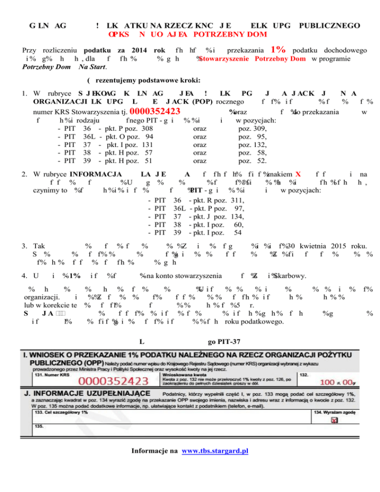 JAK PRZEKAZAĆ 1% PODATKU NA RZECZ ORGANIZACJI POŻYTKU PUBLICZNEGO STOWARZYSZENIE „POTRZEBNY DOM” Przy rozliczeniu podatku za 2014 rok zachęcamy do przekazania 1% podatku dochodowego od osób fizycznych, dla organizacji pożytku publicznego Stowarzyszenie „Potrzebny Dom” w programie Potrzebny Dom – Na Start. Jak to należy zrobić, prezentujemy podstawowe kroki: 1. W rubryce WNIOSEK O PRZEKAZANIE 1% PODATKU NALEŻNEGO NA RZECZ ORGANIZACJI POŻYTKU PUBLICZNEGO (POP) rocznego zeznania podatkowego należy wpisać numer KRS Stowarzyszenia tj. 0000352423 (obowiązkowo) oraz wnioskowaną do przekazania kwotę w zależności od rodzaju wypełnianego PIT - będzie to odpowiednio w pozycjach: - PIT – 36 - pkt. P poz. 308 oraz poz. 309, - PIT – 36L - pkt. O poz. 94 oraz poz. 95, - PIT – 37 - pkt. I poz. 131 oraz poz. 132, - PIT – 38 - pkt. H poz. 57 oraz poz. 58, - PIT – 39 - pkt. H poz. 51 oraz poz. 52. 2. W rubryce INFORMACJE UZUPEŁNIAJĄCE – zaznaczając kwadrat znakiem X wyrażamy zgodę na przekazanie Stowarzyszeniu „Potrzebny Dom” swojego nazwiska i adresu w celu identyfikacji darczyńcy, czynimy to w zależności od rodzaju wypełnianego PIT - będzie to odpowiednio w pozycjach: - PIT – 36 - pkt. R poz. 311, - PIT – 36L - pkt. P poz. 97, - PIT – 37 - pkt. J poz. 134, - PIT – 38 - pkt. I poz. 60, - PIT – 39 - pkt. I poz. 54 3. Tak wypełnione zeznanie należy złożyć w Urzędzie Skarbowym do dnia 30 kwietnia 2015 roku. Nie złożenie zeznania w terminie skutkować będzie nie przekazaniem przez US zadeklarowanej kwoty 1% na rzecz wskazanej organizacji pożytku publicznego. 4. Pieniądze - 1% podatku należnego - na konto stowarzyszenia przekaże Urząd Skarbowy. Z wyliczonej kwoty potrącone zostaną koszty przelewu. Podatnik nie może podzielić swojego 1% między kilka organizacji. Zgodnie z Ustawą 1% można przekazać tylko w zeznaniach podatkowych złożonych w terminie lub w korekcie tego zeznania, złożonej najpóźniej w miesiącu maju 2015 r. WAŻNE !!! możliwość przekazania 1% podatku mają również podatnicy objęci ograniczonym obowiązkiem podatkowym, którzy składać będą zeznania podatkowe w trakcie roku podatkowego. Przykład wypełnionego PIT-37 Informacje na www.tbs.stargard.pl
