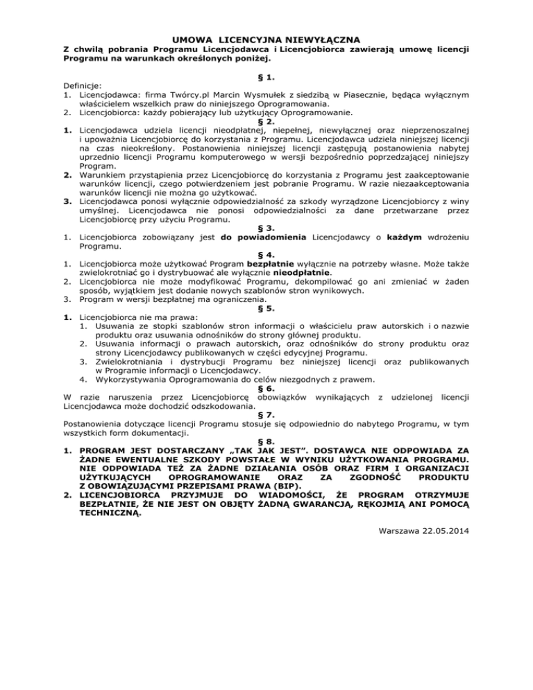 UMOWA LICENCYJNA NIEWYŁĄCZNA Z chwilą pobrania Programu Licencjodawca i Licencjobiorca zawierają umowę licencji Programu na warunkach określonych poniżej. § 1. Definicje: 1. Licencjodawca: firma Twórcy.pl Marcin Wysmułek z siedzibą w Piasecznie, będąca wyłącznym właścicielem wszelkich praw do niniejszego Oprogramowania. 2. Licencjobiorca: każdy pobierający lub użytkujący Oprogramowanie. § 2. 1. Licencjodawca udziela licencji nieodpłatnej, niepełnej, niewyłącznej oraz nieprzenoszalnej i upoważnia Licencjobiorcę do korzystania z Programu. Licencjodawca udziela niniejszej licencji na czas nieokreślony. Postanowienia niniejszej licencji zastępują postanowienia nabytej uprzednio licencji Programu komputerowego w wersji bezpośrednio poprzedzającej niniejszy Program. 2. Warunkiem przystąpienia przez Licencjobiorcę do korzystania z Programu jest zaakceptowanie warunków licencji, czego potwierdzeniem jest pobranie Programu. W razie niezaakceptowania warunków licencji nie można go użytkować. 3. Licencjodawca ponosi wyłącznie odpowiedzialność za szkody wyrządzone Licencjobiorcy z winy umyślnej. Licencjodawca nie ponosi odpowiedzialności za dane przetwarzane przez Licencjobiorcę przy użyciu Programu. § 3. 1. Licencjobiorca zobowiązany jest do powiadomienia Licencjodawcy o każdym wdrożeniu Programu. § 4. 1. Licencjobiorca może użytkować Program bezpłatnie wyłącznie na potrzeby własne. Może także zwielokrotniać go i dystrybuować ale wyłącznie nieodpłatnie. 2. Licencjobiorca nie może modyfikować Programu, dekompilować go ani zmieniać w żaden sposób, wyjątkiem jest dodanie nowych szablonów stron wynikowych. 3. Program w wersji bezpłatnej ma ograniczenia. § 5. 1. Licencjobiorca nie ma prawa: 1. Usuwania ze stopki szablonów stron informacji o właścicielu praw autorskich i o nazwie produktu oraz usuwania odnośników do strony głównej produktu. 2. Usuwania informacji o prawach autorskich, oraz odnośników do strony produktu oraz strony Licencjodawcy publikowanych w części edycyjnej Programu. 3. Zwielokrotniania i dystrybucji Programu bez niniejszej licencji oraz publikowanych w Programie informacji o Licencjodawcy. 4. Wykorzystywania Oprogramowania do celów niezgodnych z prawem. § 6. W razie naruszenia przez Licencjobiorcę obowiązków wynikających z udzielonej licencji Licencjodawca może dochodzić odszkodowania. § 7. Postanowienia dotyczące licencji Programu stosuje się odpowiednio do nabytego Programu, w tym wszystkich form dokumentacji. § 8. 1. PROGRAM JEST DOSTARCZANY „TAK JAK JEST”. DOSTAWCA NIE ODPOWIADA ZA ŻADNE EWENTUALNE SZKODY POWSTAŁE W WYNIKU UŻYTKOWANIA PROGRAMU. NIE ODPOWIADA TEŻ ZA ŻADNE DZIAŁANIA OSÓB ORAZ FIRM I ORGANIZACJI UŻYTKUJĄCYCH OPROGRAMOWANIE ORAZ ZA ZGODNOŚĆ PRODUKTU Z OBOWIĄZUJĄCYMI PRZEPISAMI PRAWA (BIP). 2. LICENCJOBIORCA PRZYJMUJE DO WIADOMOŚCI, ŻE PROGRAM OTRZYMUJE BEZPŁATNIE, ŻE NIE JEST ON OBJĘTY ŻADNĄ GWARANCJĄ, RĘKOJMIĄ ANI POMOCĄ TECHNICZNĄ. Warszawa 22.05.2014