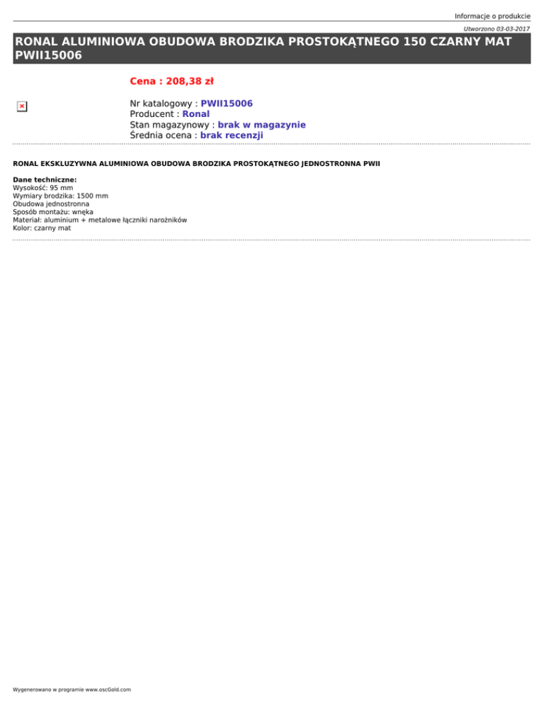 Informacje o produkcie Utworzono 03-03-2017 RONAL ALUMINIOWA OBUDOWA BRODZIKA PROSTOKĄTNEGO 150 CZARNY MAT PWII15006 Cena : 208,38 zł Nr katalogowy : PWII15006 Producent : Ronal Stan magazynowy : brak w magazynie Średnia ocena : brak recenzji RONAL EKSKLUZYWNA ALUMINIOWA OBUDOWA BRODZIKA PROSTOKĄTNEGO JEDNOSTRONNA PWII Dane techniczne: Wysokość: 95 mm Wymiary brodzika: 1500 mm Obudowa jednostronna Sposób montażu: wnęka Materiał: aluminium + metalowe łączniki narożników Kolor: czarny mat Wygenerowano w programie www.oscGold.com