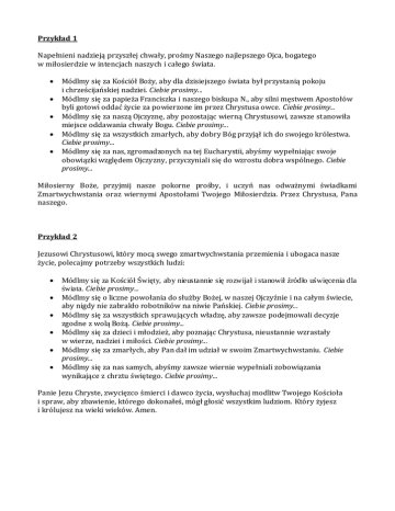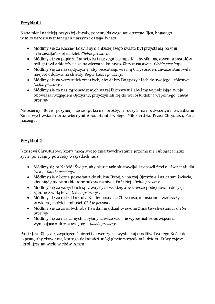 Przykład 1 Napełnieni nadzieją przyszłej chwały, prośmy Naszego najlepszego Ojca, bogatego w miłosierdzie w intencjach naszych i całego świata. Módlmy się za Kościół Boży, aby dla dzisiejszego świata był przystanią pokoju i chrześcijańskiej nadziei. Ciebie prosimy... Módlmy się za papieża Franciszka i naszego biskupa N., aby silni męstwem Apostołów byli gotowi oddać życie za powierzone im przez Chrystusa owce. Ciebie prosimy... Módlmy się za naszą Ojczyznę, aby pozostając wierną Chrystusowi, zawsze stanowiła miejsce oddawania chwały Bogu. Ciebie prosimy... Módlmy się za wszystkich zmarłych, aby dobry Bóg przyjął ich do swojego królestwa. Ciebie prosimy... Módlmy się za nas, zgromadzonych na tej Eucharystii, abyśmy wypełniając swoje obowiązki względem Ojczyzny, przyczyniali się do wzrostu dobra wspólnego. Ciebie prosimy... Miłosierny Boże, przyjmij nasze pokorne prośby, i uczyń nas odważnymi świadkami Zmartwychwstania oraz wiernymi Apostołami Twojego Miłosierdzia. Przez Chrystusa, Pana naszego. Przykład 2 Jezusowi Chrystusowi, który mocą swego zmartwychwstania przemienia i ubogaca nasze życie, polecajmy potrzeby wszystkich ludzi: Módlmy się za Kościół Święty, aby nieustannie się rozwijał i stanowił źródło uświęcenia dla świata. Ciebie prosimy... Módlmy się o liczne powołania do służby Bożej, w naszej Ojczyźnie i na całym świecie, aby nigdy nie zabrakło robotników na niwie Pańskiej. Ciebie prosimy... Módlmy się za wszystkich sprawujących władzę, aby zawsze podejmowali decyzje zgodne z wolą Bożą. Ciebie prosimy... Módlmy się za dzieci i młodzież, aby poznając Chrystusa, nieustannie wzrastały w wierze, nadziei i miłości. Ciebie prosimy... Módlmy się za zmarłych, aby Pan dał im udział w swoim Zmartwychwstaniu. Ciebie prosimy... Módlmy się za nas samych, abyśmy zawsze wiernie wypełniali zobowiązania wynikające z chrztu świętego. Ciebie prosimy... Panie Jezu Chryste, zwycięzco śmierci i dawco życia, wysłuchaj modlitw Twojego Kościoła i spraw, aby zbawienie, którego dokonałeś, mógł głosić wszystkim ludziom. Który żyjesz i królujesz na wieki wieków. Amen.