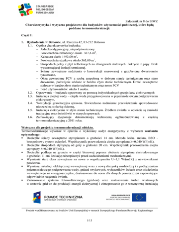 Załącznik nr 8 do SIWZ Charakterystyka i wytyczne projektowe dla budynków użyteczności publicznej, które będą poddane termomodernizacji: Część I: 1. Hydrofornia w Bobowie, ul. Rzeczna 42, 83-212 Bobowo 1.1. Ogólna charakterystyka budynku: − Jednokondygnacyjny, niepodpiwniczony − Powierzchnia zabudowy: około 367,6 m2, − Kubatura około 1493,00 m3, − Powierzchnia użytkowa około 363,00 m2, − Stropodach pełny z płyt żelbetowych na dźwigarach stalowych. Pokrycie z papy. Brak wystarczającej izolacji termicznej. − Ściany zewnętrzne nadziemia o konstrukcji murowanej z gazobetonu dwustronnie tynkowane, − Okna zewnętrzne PCV z szybą zespoloną w dobrym stanie technicznym oraz stare drewniane, podwójnie szklone w bardzo złym stanie technicznym. Drzwi zewnętrzne stalowe w bardzo złym stanie technicznym oraz nowe PCV − Ilość użytkowników: około 1 osoba. 1.2. Ogrzewanie – budynek ogrzewany za pomocą indywidualnych grzejników elektrycznych 1.3. Instalacja ciepłej wody – ciepła woda przygotowywana w pojemnościowym podgrzewaczu elektrycznym, 1.4. Wentylacja grawitacyjna sprawna. Stwierdzono nadmierne przewietrzanie spowodowane nieszczelną stolarką okienną, 1.5. Instalacja elektryczna w złym stanie technicznym. Źródłem światła w obiekcie są żarówki tradycyjne oraz świetlówki w starych oprawach. 1.6. Zamawiający dysponuje dokumentacją techniczną ogólnobudowlaną z częścią termomodernizacyjną z 2011 roku. Wytyczne dla projektu termomodernizacji obiektu. Termomodernizację wykonać w oparciu o wykonany audyt energetyczny z wyborem wariantu optymalnego: Docieplić ściany zewnętrzne styropianem o grubości 14 cm. Metoda lekka, mokra, BSO bezspoinowy system ociepleń. Współczynnik przewodzenia ciepła styropianu λ=0,040 W/(mK). Docieplić stropodach styropapą od góry o grubości 20 cm. Współczynnik przewodzenia ciepła styropapy λ=0,040 W/(mK). Docieplić podłogę na gruncie w części biurowej poprzez ułożenie styropianu ekstrudowanego o grubości 11 cm. Izolację zabezpieczyć przed uszkodzeniami mechanicznymi. Wymienić stare okna zewnętrzne na nowe o współczynniku U=1,1 W/(m2K) z nawiewnikami powietrza. Wymianę instalacji elektrycznej wewnętrznej wraz z nową skrzynką rozdzielczą i z podłączeniem pojemnościowego podgrzewacza wody, gniazd wtykowych, wyłączników światła oraz oświetlenia wewnętrznego na energooszczędne, dostosowane do norm dla danych pomieszczeń zapewniające odpowiednie natężenie światła. Zastosowanie systemu fotowoltaicznego (grid-on) oraz zastosowanie turbin wiatrowych w zestawie grid-on do produkcji energii elektrycznej i zintegrowanie go z wewnętrzną instalacją Projekt współfinansowany ze środków Unii Europejskiej w ramach Europejskiego Funduszu Rozwoju Regionalnego 1/13 elektryczną (moc instalacji fotowoltaicznej i wiatrowej dostosować do warunków technicznych i potrzeb energetycznych obiektu budowlanego). 2. Przedszkole Publiczne w Bobowie (Agronomówka), ul. Gdańska 19, 83-212 Bobowo 2.1. Ogólna charakterystyka budynku: − Konstrukcja tradycyjna murowana, dwukondygnacyjny, częściowo podpiwniczony − Powierzchnia zabudowy: około 197,8 m2, − Kubatura około 547,00 m3, − Powierzchnia użytkowa około 195,30 m2, − Stropodach wentylowany dwuspadowy, dach z płyt korytkowych oparty na stropie żelbetowym, nad przybudówkami stropodach pełny kryty papą asfaltową, stropodachy o niewystarczającej izolacji termicznej, − Ściany zewnętrzne, murowane z gazobetonu obustronnie tynkowane, ocieplone styropianem o grubości 5 cm (izolacja termiczna w złym stanie technicznym), ściany piwnic murowane z cegły ceramicznej pełnej, brak wystarczającej izolacji termicznej, − Okna zewnętrzne PCV z szybą zespoloną w dobrym stanie technicznym oraz stare drewniane, podwójnie szklone w złym stanie technicznym. Drzwi zewnętrzne PCV w dobrym stanie technicznym oraz stare drewniane w złym stanie technicznym, − Ilość użytkowników: około 55 osób. 2.2. Ogrzewanie – budynek zasilany w ciepło z własnej kotłowni opalanej paliwem stałym, instalacja c.o. stara, stalowa z stalowymi grzejnikami panelowymi z 2006 roku, brak zaworów termostatycznych, 2.3. Instalacja ciepłej wody – ciepła woda przygotowywana w pojemnościowych podgrzewaczach elektrycznych, 2.4. Wentylacja grawitacyjna sprawna. Stwierdzono nadmierne przewietrzanie w strefach z nieszczelną stolarką okienną i drzwiową, 2.5. Instalacja elektryczna aluminiowe w złym stanie technicznym. Źródłem światła w obiekcie są żarówki tradycyjne, świetlówki w starych oprawach. 2.6. Brak dokumentacji technicznej budynku. Wytyczne dla projektu termomodernizacji obiektu. Termomodernizację wykonać w oparciu o wykonany audyt energetyczny z wyborem wariantu optymalnego: Docieplić ściany zewnętrzne styropianem o grubości 15 cm po wcześniejszym usunięciu istniejącej warstwy izolacji, metoda lekka, mokra, BSO - bezspoinowy system ociepleń. Współczynnik przewodzenia ciepła styropianu λ=0,040 W/(mK). Docieplić stropodach wentylowany poprzez nadmuch granulatu wełny mineralnej o grubości 24 cm, współczynnik przewodzenia ciepła granulatu wełny mineralnej λ=0,050 W/(mK). Docieplić stropodach pełny styropapą o grubości 20 cm. Współczynnik przewodzenia ciepła styropapy λ=0,040 W/(mK). Wymienić stare okna zewnętrzne na nowe o współczynniku U=1,1 W/(m2K) z nawiewnikami powietrza, wymienić stare drzwi zewnętrzne na nowe o współczynniku U=1,5 W/(m2K) Wymienić źródło ciepła na nowoczesną kotłownię opalaną biomasą z automatycznym podajnikiem i regulatorem pogodowym, wymienić instalację rozprowadzającą, zastosować przygrzejnikowe zawory termostatyczne i automatyczne odpowietrzniki. Wymianę istniejącego oświetlenia wewnętrznego na nowoczesny energooszczędny system oświetleniowy, wymiana wewnętrznej instalacji elektrycznej, Zastosowanie systemu fotowoltaic
