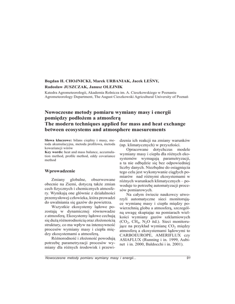 Bogdan H. CHOJNICKI, Marek URBANIAK, Jacek LEŚNY, Radosław JUSZCZAK, Janusz OLEJNIK Katedra Agrometeorologii, Akademia Rolnicza im. A. Cieszkowskiego w Poznaniu Agrometeorology Department, The August Cieszkowski Agricultural University of Poznań Nowoczesne metody pomiaru wymiany masy i energii pomiędzy podłożem a atmosferą The modern techniques applied for mass and heat exchange between ecosystems and atmosphere maesurements Słowa kluczowe: bilans cieplny i masy, metoda akumulacyjna, metoda profilowa, metoda kowariancji wirów Key words: heat and mass balance, accumulation method, profile method, eddy covariance method Wprowadzenie Zmiany globalne, obserwowane obecnie na Ziemi, dotyczą także zmian cech fizycznych i chemicznych atmosfery. Wynikają one głównie z działalności przemysłowej człowieka, która prowadzi do uwalniania się gazów do powietrza. Wszystkie ekosystemy lądowe pozostają w dynamicznej równowadze z atmosferą. Ekosystemy lądowe cechują się dużą różnorodnością oraz złożonością struktury, co ma wpływ na intensywność procesów wymiany masy i ciepła między ekosystemami a atmosferą. Różnorodność i złożoność powodują potrzebę parametryzacji procesów wymiany dla różnych środowisk i przewi- dzenia ich reakcji na zmiany warunków (np. klimatycznych) w przyszłości. Opracowane dotychczas modele wymiany masy i ciepła dla różnych ekosystemów wymagają parametryzacji, a ta nie odbędzie się bez odpowiedniej liczby danych. Niezbędne do osiągnięcia tego celu jest wykonywanie ciągłych pomiarów nad różnymi ekosystemami w różnych warunkach klimatycznych – powoduje to potrzebę automatyzacji procesów pomiarowych. Na całym świecie naukowcy utworzyli automatyczne sieci monitorujące wymianę masy i ciepła między powierzchnią globu a atmosferą, szczególną uwagę skupiając na pomiarach wielkości wymiany gazów szklarniowych (CO2, CH4, N2O itd.). Sieci monitorujące na przykład wymianę CO2 między atmosferą a ekosystemami lądowymi to CARBOEUROPE, AMERIFLUX czy ASIAFLUX (Running i in. 1999, Aubinet i in. 2000, Baldocchi i in. 2001). Nowoczesne metody pomiaru wymiany masy i energii... 91 W ramach tych sieci wykorzystywane są różne techniki pomiarowe do oceny wielkości wymiany gazowej i cieplnej, takie jak metoda kowariancji wirów czy metody komorowe. Celem tej pracy jest przegląd oraz omówienie technik pomiarowych stosowanych w Katedrze Agrometeorologii w odniesieniu do tych, które stosowane są na świecie. Metody pomiarowe Metody profilowe Podstawy metody stanowi teoria podobieństwa Monina-Obukhova. Dokonywane są tu pomiary wybranych wielkości skalarnych oraz poziomych składowych prędkości wiatru na co najmniej dwóch wysokościach nad badaną powierzchnią czynną. Równanie wykorzystywane podczas stosowania metod profilowych ma następującą postać (Kędziora 1999): Fx = Kx Δx/Δz (1) gdzie: Fx – gęstość strumienia substancji x [mg·m–2·s–1], Kx – współczynnik turbulencyjnego przewodnictwa substancji x, którego wartość jest zależna od wartości ilorazu różnicowego poziomej prędkości wiatru (u) po wysokości (z) – Δu/Δz [1·m–1·s–1], Δx/Δz – różniczka stężenia substancji x po wysokości (z) [mg·m–1]. Podobne gradientowe pomiary wykonuje się, stosując metody oparte na pomiarach wybranych składowych bilansu cieplnego. Najbardziej popularną jest stosowana do dziś metoda Bowena, w której nie wykonuje się pomiarów 92 prędkości wiatru, a jedynie pomiary ciśnienia pary wodnej i temperatury powietrza. Dodatkowo wykonywane są pomiary salda promieniowania oraz strumienia ciepła glebowego. Niewątpliwą zaletą metod gradientowych jest ich prostota. Pomiary wykonywane na dwóch wysokościach nad powierzchnią czynną nie wymagają zastosowania skomplikowanych, na dzisiejsze czasy, czujników pomiarowych. Budowa oraz użytkowanie takiego sprzętu pomiarowego nie należy do kłopotliwych. Nad szorstkimi powierzchniami roślin gradienty mierzonych wielkości skalarnych są bardzo małe. Wymaga to prowadzenia pomiarów z dużą dokładnością lub zachowania dużej odległości między poziomami pomiarowymi. Duża odległość między czujnikami powoduje wymóg pomiarów nad bardzo dużymi homogenicznymi powierzchniami, które nie występują często w krajobrazie. Stanowi to poważne ograniczenie tej grupy metod. Pojawienie się nowych technik pomiarowych (np. metoda kowariancji wirów) znacznie ograniczyło zakres stosowania metod profilowych, jednak są one wciąż stosowane ze względu na swoją prostotę i stosunkowo niskie koszty utrzymania systemu (Kędziora i in. 1998, Burba i in. 1999, Rinne i in. 2000, Olejnik i in. 2001). Metody komorowe Podczas stosowania tych metod zamyka się porcję powietrza, znajdującą się nad powierzchnią czynną, i mierzy się zmiany stężenia skalara, wynikające z aktywności badanej powierzchni. B.H. Chojnicki i in. Ogólny wzór stosowany w tej metodzie ma następującą postać (Drewitt i in. 2002): Fx = aPV δ x RTA (2) gdzie: Fx – gęstość strumienia substancji x [mol·m–2·s–1]; a – stała empiryczna [–], P – ciśnienie powietrza w komorze [Pa], V – objętość komory [m3], R – stała gazowa powietrza; R = 8,314 J· ·mol−1·K−1, T – temperatura powietrza w komorze [K], A – powierzchnia podstawy komory [m2], δx – zmiana stężenia substancji x w powietrzu znajdującym się w komorze [molx·mol−1 suchego powietrza ·s−1]. Wydzielono trzy podstawowe grupy systemów komorowych (Livingston i Hutchinson 1995): 1. Komory zamknięte bez przepływu powietrza – powietrze znajdujące się nad powierzchnią czynną jest zamykane na czas badania w komorze i dokonywany jest pomiar zmian stężenia badanej substancji w powietrzu w komorze (analizator znajduje się wewnątrz komory). 2. Komory zamknięte z przepływem powietrza – powietrze zamykane jest w komorze na czas pomiaru, ale