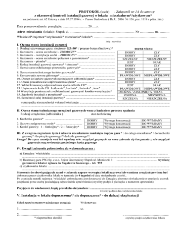 PROTOKÓŁ (wzór) - Załącznik nr 1A do umowy z okresowej kontroli instalacji gazowej w lokalu mieszkalnym*/uŜytkowym* na podstawie art. 62 Ustawy z dnia 07.07.1994 r. - Prawo Budowlane ( Dz.U. 2006 Nr 156, poz. 1118 z późn. zm.) Data przeprowadzenia przeglądu: .............................. 20…..r. Adres mieszkania (lokalu): Słupsk ul. …………………............……..........…………… Nr ……....…. m. ……… Właściciel*/najemca*/uŜytkownik* mieszkania*/lokalu*: …………….....………...............………………………. Imię i nazwisko I. Ocena stanu instalacji gazowej 1. Rodzaj uŜywanego gazu: sieciowy GZ-50* / propan-butan (butlowy)* ocena stanu 2. Gazomierz – ocena szczelności - ZBIORCZY* .................................................. 3. Gazomierz – wentylacja szafki - ZBIORCZY* ................................................. 4. Gazomierz – ocena szczelności połączeń z gazomierzem* ................................. 5. Gazomierz – plomba* .......................................................................................... 6. Rodzaj instalacji gazowej: spawana* / skręcana* ............................................... 7. Ocena stanu technicznego przewodów gazowych* ............................................. DOBRY ZŁY DOBRY ZŁY SZCZELNY NIESZCZELNY JEST BRAK DOBRY ZŁY DOBRY ZŁY DOBRY ZŁY 8. Ocena stanu technicznego kurków gazowych*..................................................... PRAWIDŁOWE NIEPRAWIDŁOWE 9. Usytuowanie zaworu głównego* ......................................................................... 10. Dostęp do kurków gazowych odcinających odbiorniki gazu* .......................... DOBRY ZŁY 11. Ocena prawidłowości odprowadzenia spalin* ................................................... DOBRY ZŁY 12. Wkład kominowy odprowadzenia spalin od kotła CO* ..................................... JEST BRAK 13. Usytuowanie kotła CO : kotłownia*; kuchnia* ; łazienka* ; inne* ................... PRAWIDŁOWE NIEPRAWIDŁOWE 14 Wentylacja pomieszczeń z odbiornikami. gazowymi kratka wentylacyjna* DROśNA / ZASŁONIĘTA / BRAK 15. Zgodność instalacji z przepisami* ..................................................................... ZGODNA NIEZGODNA 16. Szczelność całej instalacji gazowej* ................................................................. SZCZELNA NIESZCZELNA w przypadku nieszczelności wskazać lokalizację: ....................................................................................................................... ....................................................................................................................................................................................................... II. Ocena stanu technicznego urządzeń gazowych wraz z badaniem procesu spalania Rodzaj urządzenia (odbiornika ) stan techniczny 1. Kuchenka gazowa* ................................................ 2. Gazowy podgrzewacz wody* ................................... 3. Kocioł gazowy: 1 – funkcyjny* / 2 – funkcyjny* DOBRY DOBRY DOBRY Wymaga konserwacji Wymaga konserwacji Wymaga konserwacji DO WYMIANY DO WYMIANY DO WYMIANY III. Z uwagi na zagroŜenie Ŝycia i zdrowia mieszkańców zamknięto dopływ gazu * : do całego mieszkania* / do kuchenki gazowej* /do piecyka gazowego*/ do kotła gazowego*/. Uwaga! Do czasu usunięcia wad lub wymiany w/w. urządzeń gazowych na nowe zabrania się korzystania z w/w urządzeń gazowych oraz otwierania zamkniętego kurka gazowego IV. Uwagi i zalecenia pokontrolne do wykonania przez : a) Zarządcę / właściciela: ............................................................................................................................................. ............. .................................................................................................................................................................................................... b) Dostawcę gazu PSG Sp. z o.o. Rejon Gazowniczy Słupsk ul. Moniuszki 1: ...................................................... wymianę gazomierza lokator zgłasza do Pogotowia Gazowego - tel. 992 c) uŜytkownika lokalu: ................................................................................................................................. ............................... .................................................................................................................................................................................................... Stosownie do obowiązujących zasad w zakresie napraw wewnątrz lokali naprawa lub wymiana urządzeń powinna być dokonana przez uŜytkownika lokalu w terminie do 4 tygodni od daty stwierdzenia usterki.. Po usunięciu usterki najemca / właściciel zobowiązany jest dostarczyć do Zarządcy pisemne oświadczenie o usunięciu usterek podpisane przez osobę posiadającą odpowiednie uprawnienia (czytelny podpis i pieczątka z numerem uprawnień) Przyjąłem do wiadomości, kopię protokołu otrzymałem : ..................................................................................................... Czytelny podpis i data : uŜytkownika lokalu V. Instalacja w lokalu dopuszczona*/ nie dopuszczona* - do dalszej eksploatacji Skład zespołu przeprowadzającego przegląd: Wykonawca: 1. ......................................................... tel. 2. ......................................................... * niepotrzebne skreślić . ................................................. czytelny podpis uŜytkownika lokalu