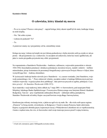 Kazimierz Robak O człowieku, który kłaniał się morzu – Po co to czytasz? Piszesz o nim pracę? – zapytał kolega, który akurat wpadł był do mnie, kartkując leżącą na stole książkę. – Nie. Tak sobie czytam. – Lektura do poduszki? To? – To. A ponieważ znamy się i przyjaźnimy od lat, zmieniliśmy temat. Kolega ma rację. Lektura tej książki nie jest lekturą poduszkową i chyba niewiele osób ją czytało ot, tak po prostu – dla przyjemności czy z ciekawości. Ja zacząłem od ciekawości, która być może zgubiła kota, ale jakoś w moim przypadku przyniosła inny efekt: przyjemność. Na wspomnienia o Stanisławie Wachowiaku – bankierze, milionerze, wojewodzie pomorskim w okresie 1924-1926, brazylijskim potentacie i działaczu polonijnym, kawalerze krzyży, medali i orderów – trafiłem mimochodem, pisząc komentarze do prezentacji fotograficznej o pierwszym Święcie Morza w Gdyni, które wymyślił jego brat – Andrzej, dziennikarz. W życiorysach Andrzeja bardzo niewiele jest o Stanisławie – ot, czasem wzmianka „brat Stanisława, wojewody pomorskiego z lat...”. Przez ciekawość właśnie, zacząłem szukać w katalogu bibliotecznym pod nazwiskiem wojewody i wypożyczyłem dwie publikacje1. Jako pierwsza przyszła ta ogólna, pełniejsza: Czasy które przeżył – Dr Stanisław Wachowiak (1890-1972). Są to materiały z sesji naukowej, która odbyła się 7 maja 2001 r w Inowrocławiu, pod auspicjami Rady Miejskiej, lokalnego Banku Spółdzielczego i Towarzystwa Historycznego oraz Instytutu Historii Akademii Bydgoskiej. Tam też – przy współudziale ambasadora Brazylii – odsłonięto tablicę pamiątkową. Stanisław Wachowiak od stolicy Kujaw zaczynał bowiem swoją długą i barwną karierę. Konferencyjne referaty otwierają świat, o jakim na ogół wie się mało. Ba – dla wielu osób spoza regionu „Pomorze” to brzeg morski, stwierdzenie, że Bydgoszcz i Toruń to miasta Pomorza, budzi zdziwienie, Kujawy są pojęciem abstrakcyjnym, kojarzonym raczej z Władysławem Łokietkiem niż ze współczesnością i konia z rzędem temu, kto wie, że Inowrocław miał swoje tramwaje jeszcze przed I wojną światową. 1 A było ich czternaście; patrz: bibliografia na końcu tekstu. Kazimierz Robak www.zeglujmyrazem.com O człowieku, który kłaniał się morzu 2 Stanisław Wachowiak urodził się w wielkopolskich Smolicach, gdzie jego rodzice pracowali na folwarku. W 1898 rodzina przeniosła się do Westfalii i tam ojciec, Ignacy, został górnikiem. Stanisław jeszcze w szkole średniej zaangażował się w działalność narodową środowisk polskich, przez co później dwa razy musiał zmieniać uniwersytet, gdyż władze pruskie ten rodzaj aktywności uważały za zdradę. Obronił (1915-02-22) z wyróżnieniem doktorat z ekonomii na monachijskim Ludwig-MaximiliansUniversität; dysertację wydał najpierw po niemiecku, a później w tłumaczeniu na polski, pod tytułem „Polacy w Nadrenii i Westfalii”. Pracę zawodową zaczął w 1916, w Inowrocławiu, jako członek zarządu Banku Ludowego, aby po kilku miesiącach zostać naczelnym dyrektorem tej 49-letniej wówczas instytucji. Bank był motorem i promotorem polskości na Kujawach, będących wówczas częścią Prus. „Spółka nasza – napisał jeden z prezesów banku na jego 50-lecie – była oparciem i ostoją: zdrowym i tanim kredytem zbudowała trwałe podstawy pod przyszły rozwój gospodarczy Kujaw.”2 Po Inowrocławiu przyszła kolej na Poznań – w 1920 r. Stanisław Wachowiak, już wtedy poseł na Sejm II RP, został podsekretarzem stanu (a więc wiceministrem) w Ministerstwie byłej Dzielnicy Pruskiej: instytucji, do której – i tu paradoks – zlikwidowania dążył bardzo konsekwentnie, gdyż twierdził (i miał rację), że utrzymuje ona sztuczny podział i przeszkadza scaleniu państwa w jeden organizm. W tym momencie – po raz pierwszy i ostatni – w referatach wspomniany jest brat wiceministra, ów Andrzej od Święta Morza, w dość charakterystycznym zresztą kontekście. Prasa endecka atakując kandydaturę Stanisława Wachowiaka pisała: Pan dr Wachowiak wprawdzie poza talentem robienia majątku (jest notorycznym milionerem) żadnych kwalifikacji nie posiada, ale ma protekcję „Prawdy” – a to dużo znaczy.3 „Prawdę” zaś redagował właśnie Andrzej Wachowiak.4 W latach 1924-26 Stanisław Wachowiak był wojewodą pomorskim. Nie ma co wdawać się w szczegóły jego dokonań na tym stanowisku. Ponieważ jednak moja z wojewodą pomorskim przygoda zaczęła się od Gdyni i Święta Morza w niej urządzanego, więc na kwestii gdyńskiej poprzestanę. Stanisław Wachowiak od początku popierał i wspomagał budowę pierwszego polskiego portu morskiego; to również jego starania przyniosły wiosce Gdynia prawa miejskie (1926-02-10). Na sesji rady miejskiej Gdyni (1926-05-10) powiedział: Rząd polski zgodził się na przyjęcie przez Gdynię charakteru miasta. [...] Chcąc ten dzień upamiętnić, ofiaruję miastu ozdobnie wykonany dekret erekcyjny i wręczam go Magistratowi do przechowania, jako symbol kamienia węgielnego przyszłej wielkości i sławy Gdyni. [...] Wielkość i rozwój Gdyni ma być przewodem oddechowym na świat daleki. [...] Gdynia, miasto portowe Państwa 2 ks. Antoni Laubitz w: 50 lat Banku Ludowego w Inowrocławiu 1867-1917, opr. Marcel Scheffs i Stanisław Wachowiak, Poznań, 1917, s. 45-46. 3 „Kurier Poznański” nr 195 z 1920-08-26. 4 za: Gulczyński, Andrzej. „Stanisław Wachowiak – podsekretarz stanu w Ministerstwie byłej Dzielnicy Pruskiej”. W: Czasy, które przeżył, str. 43. Kazimierz Robak www.zeglujmyrazem.com O człowieku, który kłaniał się morzu 3 Polskiego, niech żyje, niech się rozwija i niech błyszczy jak najcenniejsza perła w koronie Orła Białego!”5 Rok 1926 był w Polsce międzywojennej cezurą szczególną, bowiem po Przewrocie Majowym do władzy i urzędów doszli zwolennic