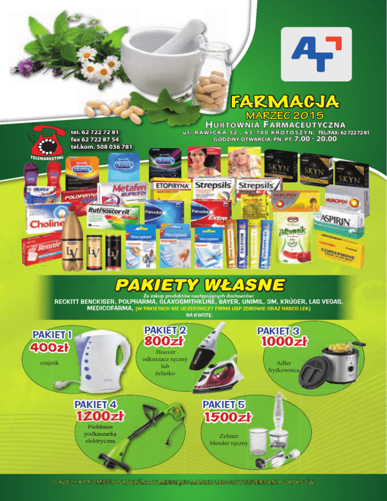 FARMACJA MARZEC 2015 tel. 62 722 72 81 fax 62 722 87 54 tel.kom. 508 036 781 URTOWNIA F ARMACEUTYCZNA u l . R A W I C K A 5 2 , 6 3 - 7 0 0 K R O T O S Z Y N , TEL/FAX: 62 722 72 81 GODZINY OTWARCIA: PN.-PT. 7.00 - 20.00 PAKIETY WŁASNE Za zakup produktów nastêpuj¹cych dostawców: RECKITT BENCKISER, POLPHARMA, GLAXOSMITHKLINE, BAYER, UNIMIL, 3M, KRÜGER, LAS VEGAS, MEDICOFARMA, (W PAKIETACH NIE UCZESTNICZY FIRMA USP ZDROWIE ORAZ HASCO LEK) NA KWOTÊ: PAKIET 2 PAKIET 1 PAKIET 3 800zł 400zł 400 zł 1000 Hoover odkurzacz ręczny lub żelazko czajnik PAKIET 4 podkaszarka elektryczna Adler frytkownica PAKIET 5 1500zł zł Zelmer blender ręczny CZERWCU LUB WYCZERPANIA ZAPASÓW. GAZETKA PROMOCYJNA WAŻNA W MIESIĄCU MARCU LUB DODO WYCZERPANIA ZAPASÓW. 1 U7533 F01010300066 U5606 F01010100019 U2456 F01010100012 U0072 F01010100009 U2441 F01010300041 U0003 F01010300001 ZA ZAKUP 2 DOWOLNYCH DISP. PRODUKTU FIRMY BAYER – PŁYN DO PODŁÓG AJAX GRATIS! ZA ZAKUP 3 DOWOLNYCH DISP. PRODUKTU FIRMY BAYER – PERWOLL 1L GRATIS! TABLETKI U3345 F01010100016 6 7 34 0001 3 U 01 01 1 F0 U7125 F01010100021 U7126 F01010100022 UA777 F02040000114 2 U7438 F02040000059 tel: 62 722 73 06 / 62 722 71 96 U3158 F01010100014 U0040 F01010100007 U7796 F01010200024 UA577 F01010100039 UA052 F02010000057 1dis. zowy zakup Za jednora is. Panadol lub +1d Cholinex ’8 isp. Panadol Ex tra 1d Promocja Parasol GRATIS! zdjęcie poglądowe etley Herbata 0T sasz. 0 1 ic Class GRATIS! TABLETKI 1disp. zowy zakup Za jednora nex dzika róża + oli Ziołowy Ch Ziołowy Cholinex 1disp. kaliptus menthol i eu Promocja UA053 F02010000058 Kup 1 display POLOPIRYNA MAX lub SCORBOLAMID UA152 UA603 F01010100040 F01010200035 UA127 F02010000059 + 1 dowolny display z : Ibufen Junior x6szt. U0010 F01010100002 U3210 U8330 F01010100015 F01010200026 UA151 F01010100038 UA603 F01010100040 A otrzymasz: ZA JEDNORAZOWY ZAKUP 2 DISP. KOPIRYNA – ZESTAW STARTOWY HEYAH Kopiryna tabletki od bólu głowy x6tabl. U4824 F01010100018 2x proszek „E” 400g lub Prince Polo 7 szt. GRATIS! tel: 62 722 73 06 / 62 722 71 96 3 Za zakup produktów EFFERTA za 50z³ Proszek Waschkonig Universal i Color GRATIS ! Calcium U2633 F02020000086 brutto NOWOŚĆ! Magnez U5025 F02020000204 Witamina C U5027 F02020000206 TABLETKI U8606 F01010100025 P Za z AKI Nuro akup p ET fen/ rodu k 3 szt kwotę Strepsil tów . Cill 250 s za z i t ł kam Bang ień 7 GRA i brud 50ml TIS U7134 F01010200018 2,54 2,54 Multiwitamina U5026 F02020000205 Multiwitamina U2636 F02020000089 Wit.C U2634 F02020000087 Calcium U5028 F02020000207 Za z PA Nuro akup p KIE fen/ rodu T kt S 6szt kwotę trepsils ów .Van 120z za is ł GRA h sasze tka TIS U7135 U7247 F01010100023 U8308 F01010200025 3.500zł olnych p dow psils u k a z wy fen i Stre o n o r a zo Za jed uktów Nur a kwotę pr od i D ur ex z 1.600zł Odkurzacz lubEkspres ciśnieniowy Krups lub Boombox Czajnik lub Żelazko Tefal lub depilator UWAGA !!! Promocje nie łączą się z promocjami na w/w produkty umieszczonymi w dalszej części oferty. Promocja do wyczerpania zapasów tel: 62 722 73 06 / 62 722 71 96 PAK IET 1d + 1 isplay N disp URO la F 1 y ST EN E do p szt. Va REPSILS XPRESS rani nish INT 10 a 50 Spr ENS IV 0 ml ay GRA TIS F01010200019 Z a je d n produ orazowy za któw N kup do i Dure urofen i Strwolnych x za k w e otę psils 4 Vita Puls Grip Vit UA718 F02010000063 U8159 F01010100024 U0063 F01010100008 (zdjęcia poglądowe) brutto 2,35 Magnez U2635 F02020000088 ZA ZAKUP 10 op. – 2 op. GRATIS 2,35 SUPER CENA! 5,33 brutto 5,76 UA148 F02010000060 Węgiel 30 kaps. U9170 F02020000530 15,42 brutto 22 brutto 16,65 26,42 24,3,238 25,9,097 brutto 28,53 21,16 brutto 26 brutto 22,85 brutto 28 Granat 60kaps. U8316 F02020000468 Pokrzywa sok 500ml U8873 F02040000103 Kudzu root 60kaps. U7654 F02020000408 brutto 29,71 brutto 14,3 brutto 9,71 Nerwobon 60kaps. łagodzi Hepatobon 60kaps. chroni stres, ułatwia zasypianie wątrobę, wspomaga trzustkę U3541 U3539 F02020000106 F02020000104Glukobonisan fix wspomaga utrzymanie prawidłowego poziomu glukozy U7376 F05010000132 Liść oliwnego gaju 60kaps. U7744 F02020000419 PROMOCJA 35,9,897 brutto 38 Chlorella 200mg 500tabl. U1369 F02020000035 8,99 Balsam kręgowy 100g U5023 S08090000004 Venobon 60kaps. wspomaga krążenie żylne i włośniczkowe U3542 F02020000107 TABLETKI 20,6,238 27,51 11,641 MINIMALIZUJE SKUTKI CHOROBY LOKOMOCYJNEJ ZWIĘKSZA SPRAWNOŚĆ SEKSUALNĄ U MĘŻCZYZN SUPER CENA 6,40 brutto 6,91 13,520 Za zakup 16 szt. Aviomin lub 16szt. Long Play „coś mocniejszego 0,5l” GRATIS! brutto 14,6 Słodzik ziołowy stevia extra 500tabl. U3318 S10030000010 U0390 F02020000008 U8675 F02020000511 tel: 62 722 73 06 / 62 722 71 96 5 8,32 6,40 brutto 6,91 brutto 13,4 brutto 9,71 brutto 14,51 7 Witamina C z dziką różą 30kaps. U1607 S10010000001 brutto 15,6 HUMAVIT® Morwa Biała 180 tabl. Zmniejsza przyswajanie cukrów co ogranicza przyrost poziomu glukozy we krwi po posiłku. U3819 F02020000125 SUPLEMENTY 8,49 brutto Capitavit balsam pielęgnacyjny do włosów 100g U0298 F06010200011 24 6,08 brutto brutto 6,57 Deprescaps *30kaps. U4767 F02020000179 PROMOCJA 2,35 Na odporność UA730 F02020000545 2,54 HUMAVIT® Z Skrzyp i Pokrzywa 250 tabl. Wzmacnia skórę, włosy i paznokcie. U1330 F02020000032 brutto 10,0 4,12 Syrop czosnkowy 100ml U7452 S10030000043 WITAMINY KRÜGER PROMOCJA 3,81 brutto 6 11,16 Zatoki *30kaps. U8149 F02020000451 WITAMINY PLUM brutto brutto 4,12 Syrop z kwiatu bzu z wit. C 100ml U3107 S10030000008 2,88 3,82 3,82 9,17 Aloes 99,92% BIO 500ml U8680 F02040000097 Kruger błonnik jabłkowy 80g UA729 S10030000061 brutto 9,32 6 6,36 30 22,99 ,83 3,11 HUMAVIT® Morwa Forte 180 kaps. Ograniczenie wzrostu poziomu glukozy we krwi po posiłku. Stymulacja wydzilania insuliny. U9347 F02020000533 5,17 Oregar olejek z oregano 30ml U8679 F02040000096 brutto 20,19 10,33 25 SUPER CENA! brutto 28,60 ,03 brutto brutto Bratek plus 30kaps. (bratek, mniszek, pokrzywa, cynk) U8258 S10010000027 Acaivit 30kaps. (j