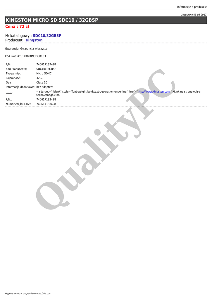 Informacje o produkcie Utworzono 03-03-2017 KINGSTON MICRO SD SDC10 / 32GBSP Cena : 72 zł Nr katalogowy : SDC10/32GBSP Producent : Kingston Gwarancja: Gwarancja wieczysta P/N: 740617183498 Kod Producenta: SDC10/32GBSP Typ pamięci: Micro SDHC Pojemność: 32GB Opis: Class 10 Informacje dodatkowe: bez adaptera C Kod Produktu: PAMKINSDG0103 <a target="_blank" style="font-weight:bold;text-decoration:underline;" href="http://www.kingston.com ">Link na stronę opisu technicznego</a> P/N:: 740617183498 Numer części EAN:: 740617183498 Q ua lit yP www: Wygenerowano w programie www.oscGold.com