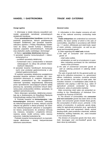 HANDEL I GASTRONOMIA TRADE AND CATERING Uwagi ogólne General notes 1. Informacje w dziale dotyczą wszystkich jednostek gospodarki narodowej prowadzących działalność handlową. Przez przedsiębiorstwa handlowe rozumie się podmioty gospodarcze, których podstawowym rodzajem działalności jest sprzedaż towarów, zaliczana zgodnie z Polską Klasyfikacją Działalności do sekcji „Handel hurtowy i detaliczny; naprawa pojazdów samochodowych, motocykli oraz artykułów użytku osobistego i domowego”. 2. Dane o sprzedaży detalicznej obejmują: 1) sprzedaż towarów konsumpcyjnych i niekonsumpcyjnych w: − punktach sprzedaży detalicznej, − hurtowniach oraz u producentów w ilościach wskazujących na zakup dla potrzeb indywidualnych nabywców; 2) sprzedaż towarów handlowych (konsumpcyjnych) oraz produkcji gastronomicznej w placówkach gastronomicznych. W wartości sprzedaży detalicznej uwzględniono sprzedaż towarów zarówno ludności, jak i konsumentom zbiorowym, tj.: urzędom, instytucjom, żłobkom, przedszkolom itp., nie uwzględniono natomiast sprzedaży targowiskowej dokonanej przez sprzedawców uiszczających jedynie opłatę placową (np. sprzedaży produktów rolnych dokonanej przez producentów-rolników, sprzedaży na giełdach samochodowych). Dane dotyczące sprzedaży detalicznej prezentuje się w dostosowaniu do Klasyfikacji Spożycia Indywidualnego według Celu (COICOP). 3. Podziału towarów na konsumpcyjne i niekonsumpcyjne dokonano umownie, zaliczając do niekonsumpcyjnych te towary, których zużycie odbywa się głównie w sferze produkcji. Do towarów niekonsumpcyjnych zaliczono w szczególności towary przeznaczone do produkcji rolniczej (np. maszyny, narzędzia i urządzenia rolnicze, nasiona, pasze, środki ochrony roślin, nawozy sztuczne), materiały budowlane itp. Podziału towarów konsumpcyjnych na żywność, napoje alkoholowe i towary nieżywnościowe dokonano szacunkowo. 1. Information in this chapter concerns all entities of the national economy conducting trade activity. Trade enterprises are understood as economic entities, the basic activity of which is the sale of commodities, classified in accordance with NACE rev. 1.1 section „Wholesale and retail trade; repair of motor vehicles, motorcycles as well as personal and household goods” . 2. Data regarding the retail sale include: 1) the sale of consumer and non-consumer goods at: − retail sales outlets, − wholesalers as well as at producers in quantities indicating purchases for the individual needs of the purchaser; 2) the sale of commercial consumer goods as well as catering products in catering establishments. The sale of goods both for the general public as well as for collective consumers, i.e., government offices, institutions, nurseries, nurseries schools etc. are included in the value of retail sales. Not included, however, is marketplace sales made by salesmen only paying a stall fee (e.g., sales of agricultural products conducted by farmerproducers, sales at automobile markets). Data concerning retail sales are presented according to the Classification of Individual Consumption by Purpose (COICOP). 3. The division of commodities into consumer and non-consumer goods has been done on the basis: non-consumer goods include those goods, the consumption of which occurs primarily in the sphere of production. In particular, goods designated for agricultural production (e.g., agricultural machinery, tools and equipment, seeds, animal feeding-stuffs, plant protection chemicals, artificial fertilizers), building materials, etc., were included in non-consumer goods. The division of consumer goods into food, alcoholic beverages and non-foodstuff goods has been done by estimation. 4. Dane o sprzedaży hurtowej towarów obejmują sprzedaż z magazynów handlowych własnych i obcych, w których składowane towary stanowią własność przedsiębiorstwa handlowego. Do wartości sprzedaży hurtowej zalicza się również wartość sprzedaży zrealizowanej na zasadzie bezpośredniej płatności lub kontraktu (agenci, aukcjonerzy), jak również wartość sprzedaży zrealizowanej przez tranzyt rozliczany, polegający na przekazywaniu towarów bezpośrednio od dostawcy do odbiorcy z pominięciem magazynów, które tę dostawę realizują. 5. Podziału sklepów według form organizacyjnych dokonano na podstawie wielkości powierzchni sprzedażowej sklepów i rodzaju sprzedawanych w nich towarów. Domy towarowe i handlowe są to sklepy wielodziałowe, prowadzące sprzedaż szerokiego i uniwersalnego asortymentu, głównie towarów nieżywnościowych, o powierzchni sal sprzedażo2 wych: domy towarowe – 2000 m i więcej, domy 2 handlowe – od 600 do 1999 m . Supermarkety są to sklepy o powierzchni 2 2 sprzedażowej od 400 m do 2499 m prowadzące sprzedaż głównie w systemie samoobsługowym, oferujące szeroki asortyment artykułów żywnościowych oraz artykuły nieżywnościowe częstego zakupu. Hipermarkety są to sklepy o powierzchni sprze2 dażowej od 2500 m prowadzące sprzedaż głównie w systemie samoobsługowym, oferujące szeroki asortyment artykułów żywnościowych i nieżywnościowych częstego zakupu, zwykle z parkingiem samochodowym. Sklepy powszechne są to sklepy prowadzące sprzedaż głównie towarów żywnościowych codziennego użytku, o powierzchni sal sprzedażowych od 120 do 399 m2. Sklepy wyspecjalizowane są to sklepy prowadzące sprzedaż szerokiego asortymentu artykułów do kompleksowego zaspokojenia określonych potrzeb, np. ubioru, wyposażenia mieszkań, sklepy motoryzacyjne, meblowe, sportowe itp. Apteki są to stałe punkty sprzedaży detalicznej spełniające warunki sklepu, w których prowadzi się sprzedaż wyrobów farmaceutycznych lub zielarskich. Stacje paliw są to punkty sprzedaży detalicznej paliw, benzyny, oleju napędowego, płynów chłodzących, środków czyszczących itp. Do pozostałych sklepów zaliczono sklepy o powierzchni sal sprzeda