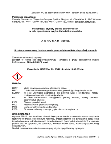 Załącznik nr 2 do zezwolenia MRiRW nr R - 35/2014 z dnia 13.03.2014 r. Posiadacz zezwolenia: Zakłady Chemiczne "Organika-Sarzyna Spółka Akcyjna; ul. Chemików 1, 37-310 Nowa Sarzyna, tel.: +48 17 24 07 111, fax: +48 17 24 07 122, e-mail: [email protected]. Przestrzegaj etykiety środka ochrony roślin w celu ograniczenia ryzyka dla ludzi i środowiska A G R O S A R 360 SL Środek przeznaczony do stosowania przez użytkowników nieprofesjonalnych Zawartość substancji czynnej: glifosat w formie soli izoproyloaminowej - związek z grupy pochodnych kwasu fosfonowego - 360 g/l (36,0 % w/w). Zezwolenie MRiRW nr R - 35/2014 z dnia 13.03.2014 r. UWAGA H317 H412 EUH401 P101 P102 P103 P273 P280 Może powodować reakcję alergiczną skóry. Działa szkodliwie na organizmy wodne; powodując długotrwałe skutki. W celu uniknięcia zagrożenia dla zdrowia ludzi i środowiska, należy postępować zgodnie z instrukcją użycia. W razie konieczności zasięgnięcia porady lekarza, należy pokazać pojemnik lub etykietę. Chronić przed dziećmi. Przed użyciem przeczytać etykietę. Unikać uwolnienia do środowiska. Stosować ochronę oczu np. gogle i/lub ochronę twarzy. OPIS DZIAŁANIA Agrosar 360 SL jest środkiem chwastobójczym w formie koncentratu do sporządzania roztworu wodnego, stosowanym nalistnie, przeznaczonym do zwalczania perzu oraz innych chwastów jednoliściennych i dwuliściennych (rocznych i wieloletnich) w uprawie jabłoni, oraz w ogrodach, na działkach, terenach wokół domu, wzdłuż ogrodzeń, dróg dojazdowych. Środek przeznaczony do stosowania przy użyciu opryskiwaczy ręcznych. Etykieta środka Agrosar 360 SL, załącznik nr 2 do zezwolenia MRiRW 1 DZIAŁANIE NA CHWASTY Agrosar 360 SL jest dolistnym herbicydem o działaniu układowym. Pobierany jest poprzez zielone części roślin (liście, zielone pędy i nie zdrewniałą korę), a następnie przemieszcza się po całej roślinie i dociera do jej części podziemnych (korzenie, rozłogi itp.) powodując ich zamieranie. Pierwsze objawy działania środka (żółknięcie i więdnięcie) są widoczne po upływie 7-10 dni od zabiegu. Całkowite zamieranie roślin następuje po upływie 2-3 tygodni. Wysoka temperatura i wilgotność powietrza oraz silne nasłonecznienie przyspieszają działanie środka. Chwasty wrażliwe: w dawce 30,0 ml/100 m2: chwastnica jednostronna, gwiazdnica pospolita, komosa biała, mak polny, maruna bezwonna, przymiotno kanadyjskie, rdest powojowaty, starzec zwyczajny, tasznik pospolity, wiechlina roczna. w dawce 40,0 ml/100 m2: fiołek polny, komosa biała, mak polny, maruna bezwonna, perz właściwy, przytulia czepna, rdest powojowaty, tasznik pospolity. w dawce 50,0 ml/100 m2: babka lancetowata, babka zwyczajna, bylica pospolita, chaber bławatek, chwastnica jednostronna, gorczyca polna, gwiazdnica pospolita, iglica pospolita, jasnota purpurowa, komosa biała, koniczyna biała, kupkówka pospolita, maruna bezwonna, nawłoć kanadyjska, owies głuchy, palusznik krwawy, perz właściwy, pępawa zielona, przymiotno kanadyjskie, przytulia czepna, rogownica pospolita, rumianek pospolity, starzec zwyczajny, stulisz lekarski, szarłat szorstki, szczaw tępolistny, szczaw zwyczajny, szczawik żółty, tasznik pospolity, tobołki polne, wiechlina roczna, włośnica zielona, wyka ptasia, wyka wąskolistna. w dawce 75,0 ml/100 m2: babka lancetowata, babka zwyczajna, bylica pospolita, chaber bławatek, chwastnica jednostronna, gorczyca polna, gwiazdnica pospolita, iglica pospolita, jasnota purpurowa, komosa biała, koniczyna biała, kupkówka pospolita, maruna bezwonna, mlecz polny, mniszek lekarski, nawłoć kanadyjska, owies głuchy, palusznik pospolity, perz właściwy, pępawa zielona, przetacznik trójlistny, przymiotno kanadyjskie, przytulia czepna, rdest ptasi, rogownica pospolita, rumianek pospolity, stulisz lekarski, szarłat szorstki, szczawik żółty, szczaw polny, szczaw tępolistny, szczaw zwyczajny, tasznik pospolity, tobołki polne, wiechlina roczna, włośnica zielona, wyka ptasia, wyka wąskolistna. w dawce 75,0 ml/100 m2 stosowanej dwukrotnie: babka lancetowata, babka zwyczajna, bodziszek drobny, bodziszek czerwony, bylica pospolita, chaber bławatek, chwastnica jednostronna, glistnik jaskółcze ziele, gorczyca polna, gwiazdnica pospolita, iglica pospolita, jaskier rozłogowy, jasnota purpurowa, komosa biała, koniczyna polna, krwawnik pospolity, kupkówka pospolita, maruna bezwonna, mlecz polny, mniszek lekarski, Etykieta środka Agrosar 360 SL, załącznik nr 2 do zezwolenia MRiRW 2 nawłoć kanadyjska, ostrożeń polny, owies głuchy, palusznik pospolity, perz właściwy, pępawa zielona, podagrycznik pospolity, pokrzywa zwyczajna, powój polny, przetacznik perski, przetacznik trójlistny, przymiotno kanadyjskie, przytulia czepna, rdest ptasi, rogownica pospolita, rumianek pospolity, stulisz lekarski, szarłat szorstki, szczaw polny, szczaw tępolistny, szczaw zwyczajny, szczawik żółty, tasznik pospolity, tobołki polne, wiechlina roczna, włośnica zielona, wyka ptasia, wyka wąskolistna. UWAGA Środek Agrosar 360 SL zastosowany dwukrotnie w dawce 75,0 ml/100 m2 zapobiega występowaniu na początku kolejnego sezonu wegetacyjnego następujących gatunków chwastów: babki lancetowatej, babki zwyczajnej, bylicy pospolitej, jaskra rozłogowego, koniczyny białej, krwawnika pospolitego, nawłoci kanadyjskiej, owsa głuchego, podagrycznika pospolitego, pokrzywy zwyczajnej, szczawiu zwyczajnego, wiechliny rocznej, włośnicy zielonej, wyki ptasiej, wyki wąskolistnej. w dawce 80,0 ml/100 m2: bodziszek drobny, gwiazdnica pospolita, jasnota purpurowa, komosa biała, mniszek lekarski, perz właściwy, przymiotno kanadyjskie, rdest ptasi, starzec zwyczajny, tasznik pospolity, wiechlina roczna, wierzbownica gruczołowata. Chwasty średnio wrażliwe: w dawce 30,0 ml/100 m2: bodziszek drobny, jasnota purpurowa. w dawce 50,0 ml/100 m2: mlecz polny, pokrzywa zwyczajna, przetacznik perski, 