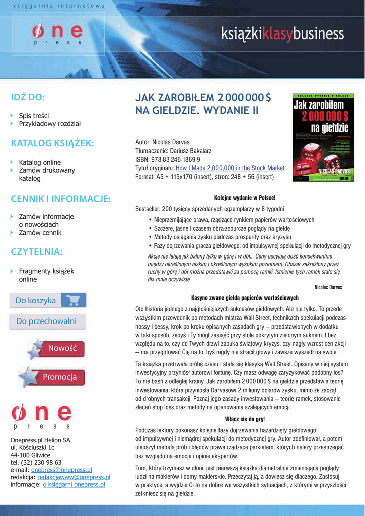 IDŹ DO: Spis treści Przykładowy rozdział KATALOG KSIĄŻEK: Katalog online Zamów drukowany katalog CENNIK I INFORMACJE: Zamów informacje o nowościach Zamów cennik CZYTELNIA: Fragmenty książek online Do koszyka Do przechowalni Nowość Promocja JAK ZAROBIŁEM 2 000 000 $ NA GIEŁDZIE. WYDANIE II Autor: Nicolas Darvas Tłumaczenie: Dariusz Bakalarz ISBN: 978-83-246-1869-9 Tytuł oryginału: How I Made 2,000,000 in the Stock Market Format: A5 + 115x170 (insert), stron: 248 + 56 (insert) Kolejne wydanie w Polsce! Bestseller: 200 tysięcy sprzedanych egzemplarzy w 8 tygodni • Nieprzemijające prawa, rządzące rynkiem papierów wartoœciowych • Szczere, jasne i czasem obra-zoburcze poglądy na giełdę • Metody osiągania zysku podczas prosperity oraz kryzysu • Fazy dojrzewania gracza giełdowego: od impulsywnej spekulacji do metodycznej gry Akcje nie latają jak balony tylko w górę i w dół… Ceny oscylują doœć konsekwentnie między okreœlonym niskim i okreœlonym wysokim poziomem. Obszar zakreœlony przez ruchy w górę i dół można przedstawić za pomocą ramki. Istnienie tych ramek stało się dla mnie oczywiste Nicolas Darvas Kasyno zwane giełdą papierów wartoœciowych Oto historia jednego z najgłoœniejszych sukcesów giełdowych. Ale nie tylko. To przede wszystkim przewodnik po metodach mistrza Wall Street, technikach spekulacji podczas hossy i bessy, krok po kroku opisanych zasadach gry — przedstawionych w dodatku w taki sposób, żebyœ i Ty mógł zasiąœć przy stole pokrytym zielonym suknem. I bez względu na to, czy do Twych drzwi zapuka œwiatowy kryzys, czy nagły wzrost cen akcji — ma przygotować Cię na to, byœ nigdy nie stracił głowy i zawsze wyszedł na swoje. Ta książka przetrwała próbę czasu i stała się klasyką Wall Street. Opisany w niej system inwestycyjny przyniósł autorowi fortunę. Czy masz odwagę zaryzykować podobny los? To nie baœń z odległej krainy. Jak zarobiłem 2 000 000 $ na giełdzie przedstawia teorię inwestowania, która przyniosła Darvasowi 2 miliony dolarów zysku, mimo że zaczął od drobnych transakcji. Poznaj jego zasady inwestowania — teorię ramek, stosowanie zleceń stop loss oraz metody na opanowanie szalejących emocji. Włącz się do gry! Onepress.pl Helion SA ul. Kościuszki 1c 44-100 Gliwice tel. (32) 230 98 63 e-mail: [email protected] redakcja: [email protected] informacje: o księgarni onepress.pl Podczas lektury pokonasz kolejne fazy dojrzewania hazardzisty giełdowego: od impulsywnej i niemądrej spekulacji do metodycznej gry. Autor zdefiniował, a potem ulepszył metodą prób i błędów prawa rządzące parkietem, których należy przestrzegać bez względu na emocje i opinie ekspertów. Tom, który trzymasz w dłoni, jest pierwszą książką diametralnie zmieniającą poglądy ludzi na maklerów i domy maklerskie. Przeczytaj ją, a dowiesz się dlaczego. Zastosuj w praktyce, a wyjdzie Ci to na dobre we wszystkich sytuacjach, z którymi w przyszłoœci zetkniesz się na giełdzie. Spis treści Wstęp wydawcy ..............................................................5 Wstęp autora ..................................................................9 CZĘŚĆ I GRACZ ........................................... 19 Rozdział 1. Okres kanadyjski ....................................21 CZĘŚĆ II FUNDAMENTALISTA .................. 35 Rozdział 2. Wejście na Wall Street ............................37 Rozdział 3. Pierwszy kryzys .....................................57 CZĘŚĆ III TECHNIK .................................... 65 Rozdział 4. Rozwój teorii ramkowej ........................67 Rozdział 5. Telegramy na cały świat .........................83 CZĘŚĆ IV TECHNOFUNDAMENTALISTA . 101 Rozdział 6. Rynek niedźwiedzia .............................103 Rozdział 7. Teoria zaczyna działać .........................113 Rozdział 8. Moje pierwsze pół miliona ...................129 Rozdział 9. Drugi kryzys .........................................141 Rozdział 10. Dwa miliony dolarów ..........................153 Wywiad udzielony magazynowi Time .......................167 -3- JAK ZAROBIŁEM 2 000 000 $ NA GIEŁDZIE DODATKI ................................................... 171 Telegramy ...................................................................173 Wykresy ......................................................................193 Pytania i odpowiedzi ..................................................211 Skorowidz spółek .......................................................235 -4-