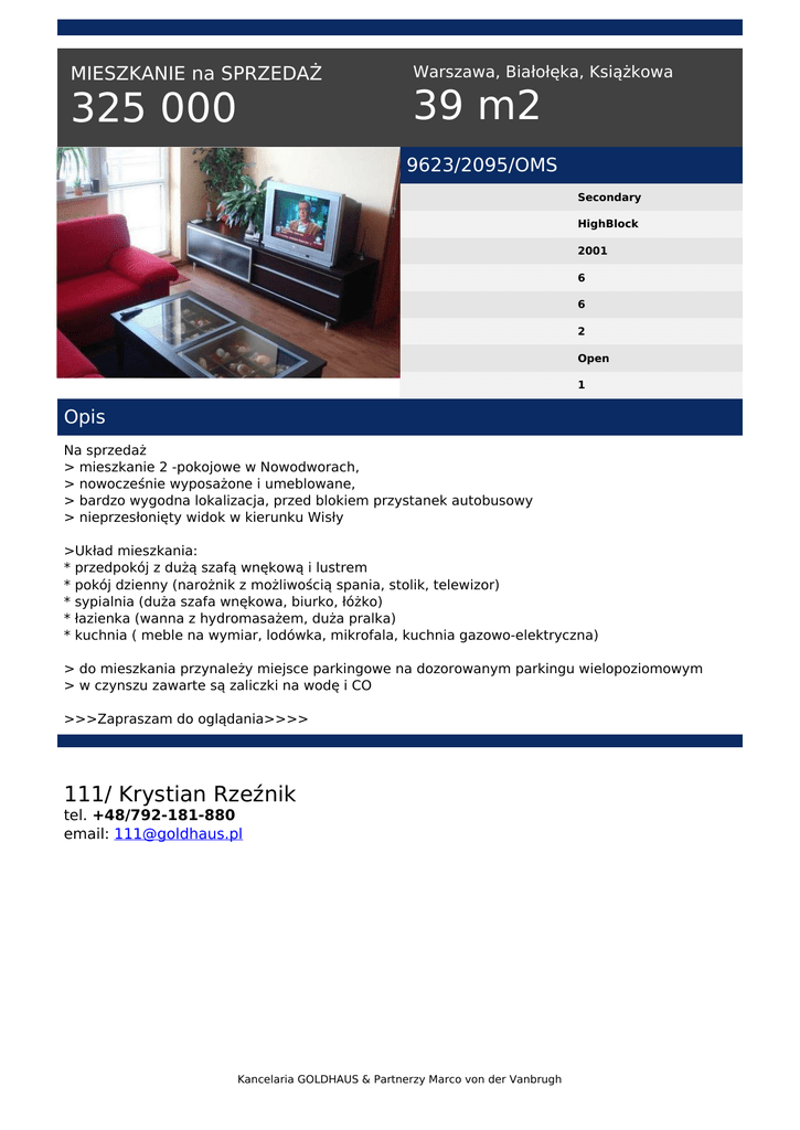 MIESZKANIE na SPRZEDAŻ 325 000 Warszawa, Białołęka, Książkowa 39 m2 9623/2095/OMS Secondary HighBlock 2001 6 6 2 Open 1 Opis Na sprzedaż > mieszkanie 2 -pokojowe w Nowodworach, > nowocześnie wyposażone i umeblowane, > bardzo wygodna lokalizacja, przed blokiem przystanek autobusowy > nieprzesłonięty widok w kierunku Wisły >Układ mieszkania: * przedpokój z dużą szafą wnękową i lustrem * pokój dzienny (narożnik z możliwością spania, stolik, telewizor) * sypialnia (duża szafa wnękowa, biurko, łóżko) * łazienka (wanna z hydromasażem, duża pralka) * kuchnia ( meble na wymiar, lodówka, mikrofala, kuchnia gazowo-elektryczna) > do mieszkania przynależy miejsce parkingowe na dozorowanym parkingu wielopoziomowym > w czynszu zawarte są zaliczki na wodę i CO >>>Zapraszam do oglądania>>>> 111/ Krystian Rzeźnik tel. +48/792-181-880 email: [email protected] Kancelaria GOLDHAUS & Partnerzy Marco von der Vanbrugh Powered by TCPDF (www.tcpdf.org)