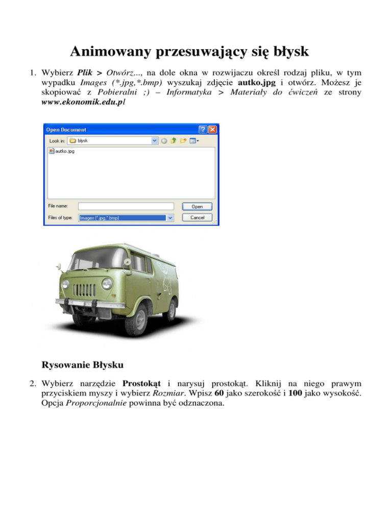 Animowany przesuwający się błysk 1. Wybierz Plik > Otwórz..., na dole okna w rozwijaczu określ rodzaj pliku, w tym wypadku Images (*.jpg,*.bmp) wyszukaj zdjęcie autko.jpg i otwórz. Możesz je skopiować z Pobieralni ;) – Informatyka > Materiały do ćwiczeń ze strony www.ekonomik.edu.pl Rysowanie Błysku 2. Wybierz narzędzie Prostokąt i narysuj prostokąt. Kliknij na niego prawym przyciskiem myszy i wybierz Rozmiar. Wpisz 60 jako szerokość i 100 jako wysokość. Opcja Proporcjonalnie powinna być odznaczona. Flash Designer – ANIMACJE – ćw.7 Animowany przesuwający się błysk 3. Naciśnij prawym przyciskiem myszy na prostokąt i wybierz Gradient... Z górnego rozwijacza wybierz Zwykły, z dolnego-lewego: Poziomy a z Dopasuj: W obie strony. W Kolor podstawowy, Lewy i Prawy ustawiamy Intens na 0% 4. Naciśnij Dodaj kolory. Zaznacz wszystkie punkty i ustaw na kolor biały #FFFFFF. © Multimedialne Centrum Informacyjne ZSZ Nr 3 – Skierniewice - 2007 2 Flash Designer – ANIMACJE – ćw.7 Animowany przesuwający się błysk 5. W Punkcie 3 i 8 ustaw Intens na 0%. W Punkcie 4 i 7 ustaw Intens na 20%. W Punkcie 5 i 6 ustaw Intens na 75%. 6. Naciśnij Zaawansowane i ustaw Obrót (-90 90) na 20. Naciśnij przycisk OK, w oknie Gradient naciśnij przycisk OK. © Multimedialne Centrum Informacyjne ZSZ Nr 3 – Skierniewice - 2007 3 Flash Designer – ANIMACJE – ćw.7 Animowany przesuwający się błysk 7. Wybierz Edycja > Zamień na krzywą. 8. Wybierz narzędzie Edycja Węzłów i za pomocą 4 kwadracików w rogach „błysku” staraj się uzyskać taki kształt jak na załączonym obrazku. © Multimedialne Centrum Informacyjne ZSZ Nr 3 – Skierniewice - 2007 4 Flash Designer – ANIMACJE – ćw.7 Animowany przesuwający się błysk Rysowanie maski 9. Wybierz narzędzie Kształty i linie i obrysuj przednią szybę. 10.Dwukrotnie kliknij lewym przyciskiem myszy na narysowaną maskę i zaznacz na dole Krzywa maskująca. WAŻNE: „błysk” musi być nad szybą, w tym celu zaznacz „błysk”, Wybierz Edycja > Na wierzch. 11.Ustaw „błysk” na wysokości maski po jej lewej stronie. © Multimedialne Centrum Informacyjne ZSZ Nr 3 – Skierniewice - 2007 5 Flash Designer – ANIMACJE – ćw.7 Animowany przesuwający się błysk 12.Naciśnij lewym przyciskiem myszy na „błysk”. Wybierz Ruch, ustaw Prędkość: 10 (ultra szybki), Kierunek ruchu -90 (prawo). Resztę pozostaw bez zmian. Gotowe!! Naciśnij F9 © Multimedialne Centrum Informacyjne ZSZ Nr 3 – Skierniewice - 2007 6