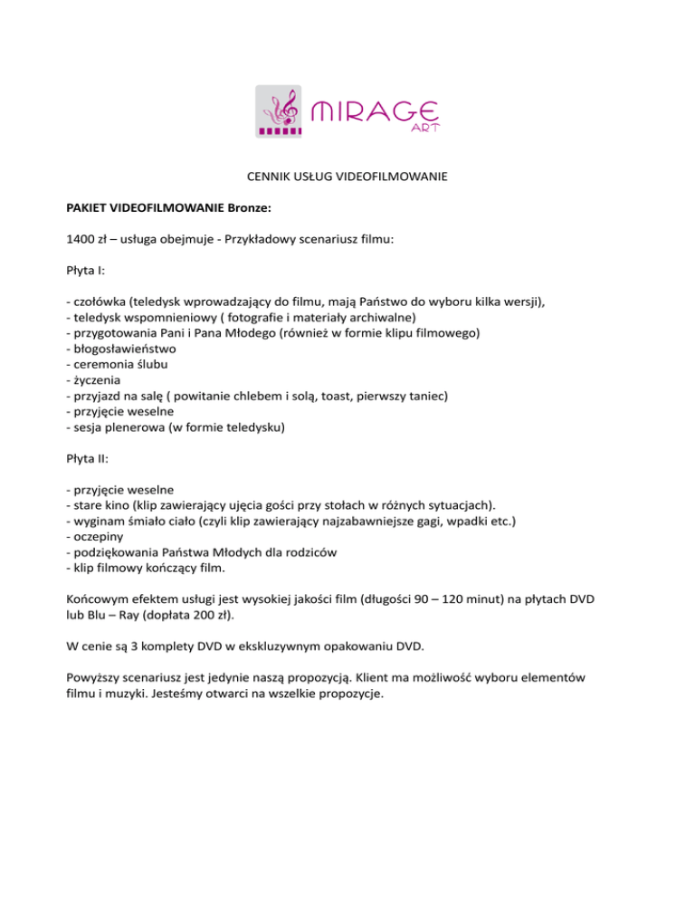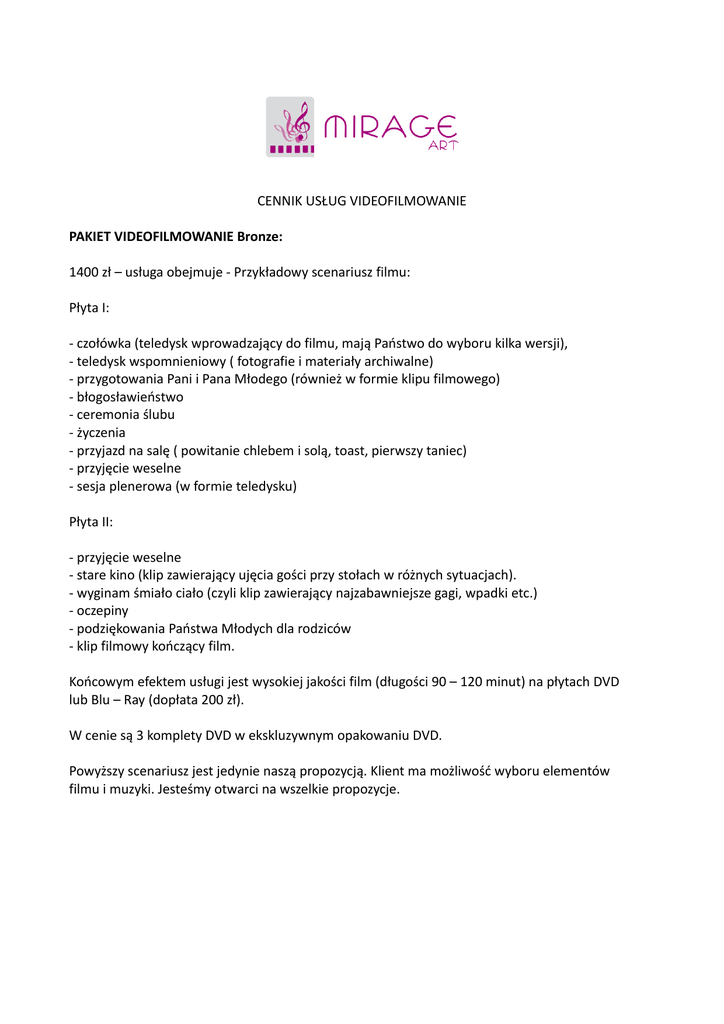 CENNIK USŁUG VIDEOFILMOWANIE PAKIET VIDEOFILMOWANIE Bronze: 1400 zł – usługa obejmuje - Przykładowy scenariusz filmu: Płyta I: - czołówka (teledysk wprowadzający do filmu, mają Państwo do wyboru kilka wersji), - teledysk wspomnieniowy ( fotografie i materiały archiwalne) - przygotowania Pani i Pana Młodego (również w formie klipu filmowego) - błogosławieństwo - ceremonia ślubu - życzenia - przyjazd na salę ( powitanie chlebem i solą, toast, pierwszy taniec) - przyjęcie weselne - sesja plenerowa (w formie teledysku) Płyta II: - przyjęcie weselne - stare kino (klip zawierający ujęcia gości przy stołach w różnych sytuacjach). - wyginam śmiało ciało (czyli klip zawierający najzabawniejsze gagi, wpadki etc.) - oczepiny - podziękowania Państwa Młodych dla rodziców - klip filmowy kończący film. Końcowym efektem usługi jest wysokiej jakości film (długości 90 – 120 minut) na płytach DVD lub Blu – Ray (dopłata 200 zł). W cenie są 3 komplety DVD w ekskluzywnym opakowaniu DVD. Powyższy scenariusz jest jedynie naszą propozycją. Klient ma możliwość wyboru elementów filmu i muzyki. Jesteśmy otwarci na wszelkie propozycje. PAKIET VIDEOFILMOWANIE Silver: 2400 zł –– usługa zawiera wszystkie elementy PAKIETU VIDEOFILMOWANIE Bronze. Dodatkowo: - drugi operator obsługujący stabilizator STEADICAM, tzw. „Flycam”, ujęcia tzw. Latającej kamery. Czołówka i wszystkie pozostałe klipy są bardziej dynamiczne i na znacznie wyższym poziomie. Końcowym efektem usługi jest wysokiej jakości film (długości 90 – 120 minut) na płytach DVD lub Blu - Ray. W cenie są 3 komplety DVD w ekskluzywnym opakowaniu DVD. Materiał surowy (na płytach DVD lub kasetkach MiniDV) – GRATIS DODATKOWO + 700 zł – poprawiny Usługa obejmuje wideofilmowanie od godz 14:00 do godz.22:00 Dodatkowo 3 komplety DVD w ekskluzywnym opakowaniu. ----------------------------------------------------------------------------------------------------------------------------------+ 150 zł – randka narzeczonych Przed ślubem w wybranym przez Parę Młodą dniu tygodnia filmowana jest wyreżyserowana randka. Z nakręconego materiału tworzony jest teledysk-klip i umieszczony na płycie ślubnej. ----------------------------------------------------------------------------------------------------------------------------------+ 500 zł – drugi operator kamery Materiał jest kręcony na dwie kamery, dzięki czemu film zawiera więcej szczegółów, jest bardziej przejrzysty. ----------------------------------------------------------------------------------------------------------------------------------Dojazd do 40 km Gratis.
