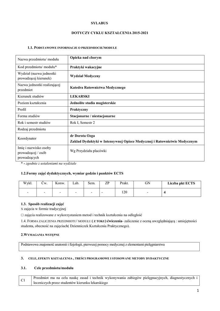 SYLABUS DOTYCZY CYKLU KSZTAŁCENIA 2015-2021 1.1. PODSTAWOWE INFORMACJE O PRZEDMIOCIE/MODULE Nazwa przedmiotu/ modułu Opieka nad chorym Kod przedmiotu/ modułu* Praktyki wakacyjne Wydział (nazwa jednostki prowadzącej kierunek) Wydział Medyczny Nazwa jednostki realizującej przedmiot Katedra Ratownictwa Medycznego Kierunek studiów LEKARSKI Poziom kształcenia Jednolite studia magisterskie Profil Praktyczny Forma studiów Stacjonarne / niestacjonarne Rok i semestr studiów Rok I, Semestr 2 Rodzaj przedmiotu dr Dorota Ozga Koordynator Zakład Dydaktyki w Intensywnej Opiece Medycznej i Ratownictwie Medycznym Imię i nazwisko osoby prowadzącej / osób prowadzących Wg Przydziału placówki * - zgodnie z ustaleniami na wydziale 1.2.Formy zajęć dydaktycznych, wymiar godzin i punktów ECTS Wykł. Ćw. Konw. Lab. Sem. - - - - - ZP - Prakt. GN 120 - Liczba pkt ECTS 4 1.3. Sposób realizacji zajęć X zajęcia w formie tradycyjnej ☐ zajęcia realizowane z wykorzystaniem metod i technik kształcenia na odległość 1.4. FORMA ZALICZENIA PRZEDMIOTU/ MODUŁU ( Z TOKU) ćwiczenia- zaliczenie z oceną uwzględniającą : umiejętności studenta, obecność na zajęciach( Dzienniczek Kształcenia Praktycznego). 2.WYMAGANIA WSTĘPNE Podstawowa znajomość anatomii i fizjologii, pierwszej pomocy medycznej z elementami pielęgniarstwa 3. CELE, EFEKTY KSZTAŁCENIA , TREŚCI PROGRAMOWE I STOSOWANE METODY DYDAKTYCZNE 3.1. Cele przedmiotu/modułu C1 Przedmiot ma na celu naukę zasad i technik wykonywania zabiegów pielęgnacyjnych, diagnostycznych i leczniczych przez studentów kierunku lekarskiego 1 C2 C3 Ćwiczenia poświęcone są nabyciu umiejętności praktycznych z zakresu praktyki szpitalnej oraz przygotowaniu do podejmowania specjalistycznej opieki nad pacjentem Ćwiczenia mają również za zadanie przygotowanie do współpracy z pacjentem, jego rodziną, zespołem terapeutycznym oraz kształtowanie poczucia odpowiedzialności za decyzję o wykonaniu zadania, przebieg i wynik zabiegu 3.2 EFEKTY KSZTAŁCENIA DLA PRZEDMIOTU/ MODUŁU TREŚĆ EFEKTU KSZTAŁCENIA ZDEFINIOWANEGO DLA PRZEDMIOTU (MODUŁU) EK ( efekt kształcenia) D.W13 zna i rozumie główne pojęcia, teorie, zasady i reguły etyczne służące jako ogólne ramy właściwego interpretowania i analizowania zagadnień moralno-medycznych EK_01 D.W 14 zna zasady altruizmu i odpowiedzialności klinicznej i ma świadomość zasad funkcjonowania zespołu terapeutycznego; EK_03 E.U35 ocenia odleżyny i stosuje odpowiednie opatrunki; EK_04 E.U25 stosuje leczenie żywieniowe (z uwzględnieniem żywienia dojelitowego i pozajelitowego); EK_05 F.U3 stosuje się do zasad aseptyki i antyseptyki; EK_06 E.U29 wykonuje podstawowe procedury i zabiegi lekarskie, w tym: a) pomiar temperatury ciała, pomiar tętna, nieinwazyjny pomiar ciśnienia tętniczego, b) monitorowanie parametrów życiowych przy pomocy kardiomonitora, pulsoksymetrię, c) badanie spirometryczne, leczenie tlenem, wentylację wspomaganą i zastępczą, d) wprowadzenie rurki ustno-gardłowej, e) wstrzyknięcia dożylne, domięśniowe i podskórne, kaniulację żył obwodowych, pobieranie obwodowej krwi żylnej, pobieranie posiewów krwi, pobieranie krwi tętniczej, pobieranie arterializowanej krwi włośniczkowej, f) pobieranie wymazów z nosa, gardła i skóry, nakłucie jamy opłucnowej, g) cewnikowanie pęcherza moczowego u kobiet i mężczyzn, zgłębnikowanie żołądka, płukanie żołądka, enemę, h) standardowy elektrokardiogram spoczynkowy wraz z interpretacją, kardiowersję elektryczną i defibrylację serca, i) proste testy paskowe i pomiar stężenia glukozy we krwi; EK_07 D.U1 uwzględnia w procesie postępowania terapeutycznego subiektywne potrzeby i oczekiwania pacjenta wynikające z uwarunkowań społeczno-kulturowych EK_8 D.U16 rozpoznaje własne ograniczenia, dokonuje samooceny deficytów i potrzeb edukacyjnych, planuje własną aktywność edukacyjną EK_9 F.U5 zakłada wkłucie obwodowe EK_10 ODNIESIENIE DO EFEKTÓW KIERUNKOWY CH (KEK) 3.3 TREŚCI PROGRAMOWE 2 Metody i techniki postępowania aseptycznego i antyseptycznego. Zasady postępowania z materiałem zakaźnym. Przygotowanie narzędzi do sterylizacji. Dezynfekcja, sterylizacja. 1. 2. Zasady dekontaminacji rąk. Techniki mycia rąk (higieniczne mycie rąk, chirurgiczne mycie rąk). Technika zakładania rękawiczek ochronnych oraz odzieży ochronnej. 3. Ocena stanu ogólnego. Pomiary podstawowych czynności życiowych (oddech, temperatura, tętno, ciśnienie tętnicze krwi). Dokumentowanie wyników pomiarów. Bandażowanie. 4. Przygotowanie stolika opatrunkowego. Wykonywanie opatrunków, zaopatrywanie ran (rana czysta, rana skażona). 5. Wstrzyknięcia domięśniowe. Wstrzyknięcia dożylne. Zakładanie wkłucia dożylnego. Pompy infuzyjne. Pobieranie krwi do badań laboratoryjnych. Interpretacja wyników badań. 6. Wstrzyknięcia podskórne. Oznaczanie poziomu glukozy i pobieranie RKZ włośniczkowego. 7. Stosowanie leków przez układ pokarmowy, wziewnie i na skórę. Kroplowy wlew dożylny. 8. Wstrzyknięcia śródskórne. 3.4 METODY DYDAKTYCZNE WYKŁAD, DYSKUSJA, BURZA MÓZGÓW, POKAZ, SYMULACJA, ZAJĘCIA PRAKTYCZNE, E-LEARNING 4. METODY I KRYTERIA OCENY 4.1 Sposoby weryfikacji efektów kształcenia Symbol efektu EK_01-10 Metody oceny efektów kształcenia ( np.: kolokwium, egzamin ustny, egzamin pisemny, projekt, sprawozdanie, obserwacja w trakcie zajęć) Ocena podczas praktyk zawodowych w szpitalu Forma zajęć dydaktycznych ( w, ćw, …) Ćw. 4.2 Warunki zaliczenia przedmiotu (kryteria oceniania) KRYTERIA OCENY UMIEJĘTNOŚCI PRAKTYCZNYCH NORMY KRYTERIA OGÓLNE PUNKTY Zasady Sprawność Skuteczność Samodzielność Komunikowanie się z pacjentem Postawa 3 Sposób wykonania czynności 2 przestrzega zasad, właściwa technika i kolejność wykonania czynności przestrzega zasad po 1 ukierunkowa niu 0 nie przestrzega zasad, chaotycznie wykonuje działania czynności wykonuje pewnie, energiczni e czynno