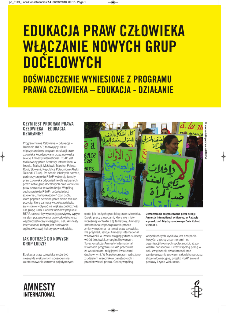po_3149_LocalConstituencies:A4 06/08/2010 09:16 Page 1 EDUKACJA PRAW CZŁOWIEKA WŁĄCZANIE NOWYCH GRUP DOCELOWYCH DOŚWIADCZENIE WYNIESIONE Z PROGRAMU PRAWA CZŁOWIEKA – EDUKACJA - DZIAŁANIE Program Prawa Człowieka – Edukacja – Działanie (REAP) to trwający 10 lat międzynarodowy program edukacji praw człowieka koordynowany przez norweską sekcję Amnesty International. REAP jest realizowany przez Amnesty International w Izraelu, Malezji, Mołdawii, Maroko, Polsce, Rosji, Słowenii, Republice Południowe Afryki, Tajlandii i Turcji. Po ocenie lokalnych potrzeb, partnerzy projektu REAP wybierają tematy praw człowieka odpowiednie dla wybranych przez siebie grup docelowych oraz kontekstu praw człowieka w swoim kraju. Wspólną cechą projektu REAP na świecie jest szkolenie „multiplikatorów” czyli osób, które poprzez pełnione przez siebie role lub pozycję, którą zajmują w społeczeństwie, są w stanie wpływać na większą publiczność lub grupę ludzi. Poprzez udział w projekcie REAP, uczestnicy wywierają pozytywny wpływ na stan poszanowania praw człowieka oraz współuczestniczą w osiąganiu celu Amnesty International, którym jest budowanie ogólnoświatowej kultury praw człowieka. JAK DOTRZEĆ DO NOWYCH GRUP LUDZI? Edukacja praw człowieka może być niezwykle efektywnym sposobem na zainteresowanie zarówno pojedynczych © www.resistingwomen.net/Ali Fkir CZYM JEST PROGRAM PRAWA CZŁOWIEKA – EDUKACJA – DZIAŁANIE? osób, jak i całych grup ideą praw człowieka. Dzięki pracy z osobami, które nie miały wcześniej kontaktu z tą tematyką, Amnesty International zapoczątkowała proces zmiany myślenia na temat praw człowieka. Na przykład, sekcje Amnesty International w Słowenii i w Izraelu osiągnęły duże sukcesy wśród środowisk zmarginalizowanych. Turecka sekcja Amnesty International, w ramach programu REAP, pracowała ze wspólnotami religijnymi i władzami duchownymi. W Maroko program wdrażano z udziałem urzędników państwowych i przedstawicieli prawa. Cechą wspólną Demonstracja zorganizowana przez sekcję Amnesty International w Maroko, w Rabacie w przeddzień Międzynarodowego Dnia Kobiet w 2008 r. wszystkich tych wysiłków jest czerpanie korzyści z pracy z partnerami - od organizacji lokalnych społeczności, aż po władze państwowe. Przez wspólną pracę w celu zwiększania świadomości oraz zainteresowania prawami człowieka poprzez akcje informacyjne, projekt REAP zmienił postawy i życie wielu osób. po_3149_LocalConstituencies:A4 06/08/2010 09:16 Page 2 © Amnesty International „To bardzo ważne, gdy podczas PRACA ZE ŚRODOWISKAMI ZMARGINALIZOWANYMI naszych warsztatów mówimy o tym, że wszyscy mamy Program REAP odpowiada na lokalne prawa, a z drugiej strony potrzeby i problemy praw człowieka. W Słowenii program REAP dotarł do mamy także obowiązki… To co społeczności zmarginalizowanych poprzez jest szczególnie istotne, to to, edukację młodzieży w takich kwestiach jak dyskryminacja Romów, lesbijek, gejów, osób że młodzi ludzie przejmują biseksualnych i transwestytów. Każdego roku inicjatywę w kwestiach praw w Słowenii prowadzonych jest ponad 100 człowieka. Pokazują, że zależy im warsztatów, podczas których ponad 2,000 osób zaznajamia się z prawami człowieka na sobie, zaczynają się szanować. i podnosi swoją świadomość. Warsztaty Zaczęli nawet rozumieć sytuację mają formę weekendowych seminariów lub jednodniowych szkoleń, podczas których Romów w Słowenii”. przedstawiane są sposoby zaangażowania Simona Kemperle, Amnesty International Słowenia „Stałem się bardziej świadomy tego, jak ważne jest, aby pomagać ludziom w potrzebie, tego, że jesteśmy równi, oraz że prawa innych nie są mniej ważne od moich”. młodzieży w działalność kampanijną. Aby wspomóc pracę tych młodych aktywistów , wydano publikacje dotyczące praw człowieka dla dzieci, takie jak Jagoda. Kolorowa książka przedstawia kulturę i codzienne życie Romów. Projekt został opracowany w ścisłej współpracy z dziećmi romskimi oraz romską organizacją pozarządową Drustvo Zaveznikov Mehkega Pristanka. Uczestnik programu REAP, Słowenia W Izraelu, program REAP skupia się na prawach kobiet, dzieci i uchodźców, a także na problemie handlu ludźmi. Izraelska sekcja Amnesty International zaangażowała Amnesty International Maj 2010 Index: POL 32/004/2010 Uczestnicy letniego obozu Amnesty International dla młodzieży w Ljubljanie w Słowenii protestują przeciwko torturom w Tunezji. się w problemy lokalne, w tym dyskryminację Beduinów. W rezultacie partner projektu, the New Israel Fund’s Empowerment and Training Centre, prowadzi nowy kurs „Prawa człowieka dla beduińskich aktywistów społecznych”. Program REAP w Izraelu zapoczątkował zmiany w zachowaniach, postawach i przekonaniach, redukując dyskryminację, wpajając szacunek i promując pokojowe współistnienie. po_3149_LocalConstituencies:A4 06/08/2010 09:16 Page 3 © Amnesty International „To był niezwykle ważny moment, kiedy Prezydium ds. Religii ogłosiło, że islam sprzeciwia się przemocy wobec kobiet. To było dla nas bardzo ważne, ponieważ od dwóch lat pracowaliśmy z muzułmańskimi duchownymi. Podczas naszych spotkań mieliśmy okazję rozmawiać o tych kwestiach… Byli otwarci i zmotywowani i bardzo chcieli być częścią globalnego ruchu na rzecz praw człowieka”. Murat Cekic, turecka sekcja Amnesty International Stoisko informacyjne będące częścią akcji objazdowej promującej kampanię “Stop Przemocy Wobec Kobiet” zorganizowanej przez turecką sekcję Amnesty International. PRACA ZE WSPÓLNOTAMI RELIGIJNYMI I WŁADZAMI DUCHOWNYMI Dzięki inicjatywom programu REAP, ponad 215 liderów grup religijnych zostało wyszkolonych na multiplikatorów praw człowieka. Na przykład, długoterminowy projekt szkolenia imamów miał ogromne znaczenie dla wspólnot religijnych w Turcji. Tren