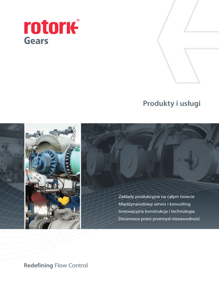 Produkty i usługi Zakłady produkcyjne na całym świecie Międzynarodowy serwis i konsulting Innowacyjna konstrukcja i technologia Doceniana przez przemysł niezawodność Redefining Flow Control Spis treści Wprowadzenie2 Możliwości techniczne 3 Laboratoria badawcze 4 Zapewnienie Jakości 5 Zakłady produkcyjne i sieć obsługi Klienta w skali globalnej 6 Produkty ćwierćobrotowe 8 Produkty wieloobrotowe 13 Zestawy montażowe zaworu 16 Wyposażenie dodatkowe zaworów 17 Rotork jest liderem na globalnym rynku automatyzacji armatury przemysłowej i regulacji przepływu. Nasze produkty i usługi wspomagają organizacje na całym świecie w poprawie efektywności, bezpieczeństwa i ochrony środowiska. We wszystkich naszych działaniach zawsze dążymy do technicznej doskonałości poprzez innowacyjność i najwyższe standardy jakości. W efekcie nasi pracownicy i nasze produkty przewodzą w dziedzinie technologii sterowania przepływem mediów. Perfekcyjna niezawodność to cecha całego asortymentu produkowanych przez nas wyrobów od flagowej serii napędów elektrycznych do pneumatycznych, hydraulicznych i elektro-hydraulicznych, a także aparatury pomiarowo-sterującej, przekładni i wyposażenia zaworów. Rotork jest nastawiony na wspomaganie każdego klienta w całym okresie eksploatacji instalacji użytkownika, począwszy od inwentaryzacji aż do montażu, konserwacji, audytów i napraw. W naszej sieci biur krajowych i międzynarodowych nasi specjaliści pracują 24 godziny na dobę, aby utrzymać naszą pozycję zaufanego dostawcy. Rotork. Redefining flow control. 2 Wprowadzenie i możliwości techniczne Od momentu pierwszego kontaktu z Gears Rotork można skorzystać z bogatego doświadczenia zdobytego w branży na przestrzeni kilku dekad. Nasz światowej klasy zespół inżynierów jest zaangażowany w tworzenie najwyższych technologii dla potrzeb rynku, które jest w stanie osiągnąć stosując najnowocześniejsze metody projektowania. Wizualizacja koncepcji i wykonanie: • Nasz własny system 3D rapid prototyping umożliwia tworzenie modeli koncepcyjnych 3D z dokładnością 100 mikronów w przeciągu jednego dnia. Projektowanie metodą osadzania topionego materiału pozwala na tworzenie części z silną strukturą ABS (akrylonitryl-butadien-styren). • Testy wykonywane na prototypach pozwalają na usuwanie niepewności związanych z fazą przedprodukcyjną, pozwala to na zwiększenie elastyczności w czasie prac projektowych. W pełni wirtualna walidacja: • Wykorzystanie najnowszej metody Finite Element Analysis pozwala na testowanie struktury, wpływu materiału na wibracje i uderzenia przed wykonaniem prototypu, co znacznie skraca czas rozwoju i optymalizuje integralność produktu. • Dokładna analiza projektów pod kątem kluczowych warunków pracy ma na celu zwiększenie bezawaryjności produktu. • Pełna analiza montażu pozwala na symulacje oddziaływania między poszczególnymi częściami w warunkach pracy pod kątem tarcia i kompatybilności części. Wiodące metody projektowania: • Zastosowanie parametrycznego i bezpośredniego modelowania i projektowania w 3D, pozwala na bardzo dokładne wykonanie projektu. • Informacje dotyczące produkcji prezentowane w 3D z modeli CAD pozwalają na produkcję z dokładnym odzwierciedleniem projektu, co umożliwia tworzenie bardziej skomplikowanych struktur z lepszą optymalizacją geometrii. • Narzędzia FMEA (Failure Modes and Effects Analysis) i DFSS (Design for Six Sigma Tools) usprawniają tworzenie projektów przy jednoczesnym zwiększonym nacisku na uwzględnianie potrzeb klienta. Elastyczna technika aplikacji: • Aby móc zapewnić wysoki standard usług oczekiwany przez technicznie wymagających klientów posiadamy wiedze o produkcie, doświadczenie w projektowaniu i ludzi z silnym zaangażowaniem, w jakość i zapewnienie dedykowanych rozwiązań dla naszych klientów. Wysoko wykwalifikowany i doświadczony zespół: • Posiadamy dedykowany zespół do badań i rozwoju, aby zapewnić prawidłowy przebieg prac nad każdym nowym projektem od samego pomysłu do klienta. • Wysoko wykwalifikowani inżynierowie z bogatym doświadczeniem w przemyśle wraz z liczną grupą specjalistów tworzą zespół, który gwarantuje, że gotowy produkt będzie spełniał wszystkie wymagania. Redefining Flow Control 3 Laboratoria Badawcze - Jakość i Bezpieczeństwo Rotork Gears posiada doskonale wyposażone laboratorium badawcze w swoim zakładzie produkcyjnym w Leeds. Mamy szeroki asortyment urządzeń testowych do badania ćwierćobrotowych i wieloobrotowych przekładni w szerokim zakresie momentów obrotowych. Wykonujemy u siebie testy trwałości użytkowej, testy przeciążeniowe i niektóre badania środowiskowe. W przypadku testów, których nie możemy wykonać w naszym laboratorium w Leeds, np. ekstremalne momenty obrotowe lub testy w komorze solnej, możemy zawsze skorzystać z większych możliwości Rotork Group. Możemy także korzystać z usług stron trzecich dla procedur obejmujących badania na instalacjach jądrowych, hiperbarycznych, głębinowych i sejsmicznych/ wibracyjnych. Komora klimatyczna pozwala na symulowanie środowiska o różnych temperaturach (od -70 do 180°C) i wilgotności (od 10% do 98% wilgotności względnej). Komora ta jest w pełni samowystarczalna, sterowana elektronicznie i jest na tyle duża, że umożliwia testowanie większości dostępnych przekładni. Komora ma panele sterowania po obu stronach, co pozwala na przemieszczanie przekładni z zewnątrz, by poprawić niezawodność i elastyczność testowania. Komora klimatyczna Discovery. Testowanie trwałości prototypowej przekładni do zastosowań morskich/ głębinowych. 4 Sejsmiczna kwalifikacja napędu i przekładni do zastosowań jądrowych. Hydrostatyczna kwalifikacja przekładni do zastosowań głębinowych. Zapewnienie Jakości Rotork Gears jest nastawiony nie tylko na pełne zrozumienie potrzeb i oczekiwań 