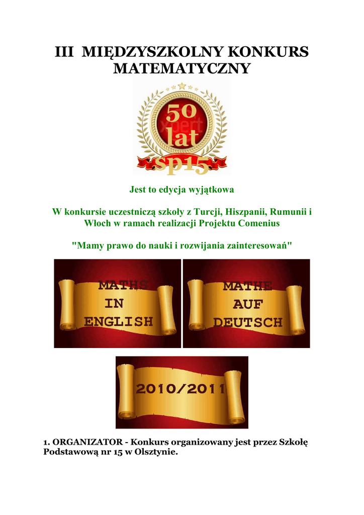 III MIĘDZYSZKOLNY KONKURS MATEMATYCZNY Jest to edycja wyjątkowa W konkursie uczestniczą szkoły z Turcji, Hiszpanii, Rumunii i Włoch w ramach realizacji Projektu Comenius "Mamy prawo do nauki i rozwijania zainteresowań" 1. ORGANIZATOR - Konkurs organizowany jest przez Szkołę Podstawową nr 15 w Olsztynie. 2. CELE KONKURSU - Konkurs ma na celu popularyzację matematyki, języka angielskiego oraz języka niemieckiego, rozwijanie zainteresowań matematycznych i językowych, a także promowanie uczniów zdolnych. 3. TEMATYKA KONKURSU Uczestników konkursu obowiązuje znajomość treści zawartych w programach nauczania matematyki w klasie V szkoły podstawowej, a także znajomość słownictwa matematycznego w języku angielskim, bądź w języku niemieckim. MATHS IN ENGLISH liczba / number cyfra / digit liczba naturalna / natural number liczba pierwsza / prime number liczba odwrotna / inverse of a number liczba parzysta / even number liczba nieparzysta / odd number suma / sum różnica / difference iloraz / quotient iloczyn / product równość / equality działanie / operation ułamek / fraction ułamek zwykły / vulgar fraction ułamek dziesiętny / decimal fraction licznik / numerator mianownik / denominator dodawanie / addition odejmowanie / substraction mnożenie / multiplication dzielenie / division reszta (z dzielenia) / remainder dodać / add odjąć / substract obliczyć / calculate uzupełnić / complete równa się / equals system rzymski / Roman numerals wspólna wielokrotność / common multiple największy wspólny dzielnik/ greatest common divisor wyrażenie/ expression równe / equal nierówność / inequality liczba mieszana / mixed number liczba przeciwna/ opposite number liczba podzielna przez/ number divisible by figura / figure odcinek / segment prosta / straight line okrąg / koło - circle cięciwa / chord średnica / diameter promień / radius trójkąt / triangle czworokąt / quadrangle kwadrat / square prostokąt / rectangle trapez / trapezium romb / diamond, rhombus równoległobok / parallelogram wielokąt / polygon pole / area obwód / perimeter bok / side sześcian / cube prostopadłościan / cuboid ściana / wall krawędź / side kąt / angle kąt wewnętrzny / inside angle kąt zewnętrzny / outside angle miara kąta / angle measure stopień / grade równoległy / parallel prostopadły / perpendicular pionowy / vertical poziomy / horizontal wymiar / dimension długość / length szerokość / width przekątna/ diagonal rysunek/ drawing kilometry kwadratowe/ square kilometers trójkąt prostokątny/ right triangle trapez równoramienny/ isosceles trapezium wysokość/ height Gramatyka (szczególną uwagę zwrócić na): – liczba mnoga rzeczowników (+ nieregularne) – czas present simple – stopniowanie przymiotników (+ nieregularne: much, many, little) – liczebniki – wyrazy pytające: what, how much, how many – I tryb warunkowy – tryb rozkazujący – there is / there are – relative: which MATHE AUF DEUTSCH liczba – die Zahl cyfra – die Ziffer liczba naturalna – natürliche Zahl liczba pierwsza – Primzahl liczba odwrotna – umgeherte Zahl, gegensätzlich Zahl liczba parzysta – gerade Zahl liczba nieparzysta – ungerade Zahl suma – die Summe różnica – der Unterschied iloraz – der Quotient iloczyn – das Produkt równość – die Gleichheit działanie – die Aktion, die Operation ułamek – der Bruch, die Bruchzahl ułamek zwykły – einfacher Bruch ułamek dziesiętny – Dezimalbruch, Zehnebruch licznik – der Zähler mianownik – der Nenner dodawanie – das Zusammenzählen figura – die Figur, die Gestalt odcinek – der Abschnitt prosta – die Gerade okrąg – der Kreis cięciwa – die Sehne średnica – der Durchmesser promień – der Radius trójkąt – das Dreieck czworokąt – das Viereck kwadrat – das Quadrat prostokąt – das Rechteck trapez – das Trapez romb – der Rhombus równoległobok – das Parallelogramm wielokąt – das Vieleck, das Polygon pole – das Feld obwód – der Umfang bok – die Seite sześcian – der Kubus prostopadłościan – der Quader odejmowanie – das Abziehen mnożenie – das Multiplizieren dzielenie – das Dividieren reszta (z dzielenia) – der Rest bez reszty dzielenie – dividieren ohne Rest dodać – zugeben, addieren odjąć – abziehen obliczyć – berechnen uzupełnić – ergänzen równać się – gleich sein (ist gleich) system rzymski – römisches Zahlensystem wspólna wielokrotność – gemeinsames Vielfaches ściana – die Wand krawędź – die Kante, der Rand, die Seite kąt – der Winkel, die Ecke kąt wewnętrzny – Innenwinkel kąt zewnętrzny – Außenwinkel miara kąta – Winkelmaß stopień – der Grad równoległy – parallel prostopadły – senkrecht pionowy – vertikal poziomy – horizontal wymiar – die Dimension długość – die Länge szerokość – die Breite GRAMATYKA (na co zwrócić uwagę) 1. Rzeczownik – liczba pojedyncza i mnoga, odmiana rzeczownika 2. Czasowniki regularne i nieregularne 3. Czas teraźniejszy (Präsens); czas przeszły – Perfect i Präteritum; czas 4. 5. 6. 7. 8. przyszły – Futur I Przymiotniki – odmiana oraz stopniowanie Liczebniki Tryb rozkazujący Tryb przypuszczający Zaimki względne i pytajne: - der, die, das - welcher, welche, welches - wer, was - was für ein 4. PRZEBIEG KONKURSU W konkursie uczestniczą uczniowie klas V. I etap – wewnątrzszkolny – ma na celu wyłonienie 1 – 4 osób reprezentujących szkołę (o formie wyłaniania reprezentantów decydują nauczyciele uczący) II etap – MIĘDZYSZKOLNY Konkurs będzie się składał z dwóch części: - część pierwsza, to praca indywidualna uczniów. Każdy z uczestników konkursu będzie rozwiązywał test, w którym znajdują się zadania otwarte, krzyżówki, uzupełnianki liczbowe itp. Czas trwania tej części to 60 minut. Po jej zakończeniu prace uczniów zostaną zebrane i sprawdzone przez komis