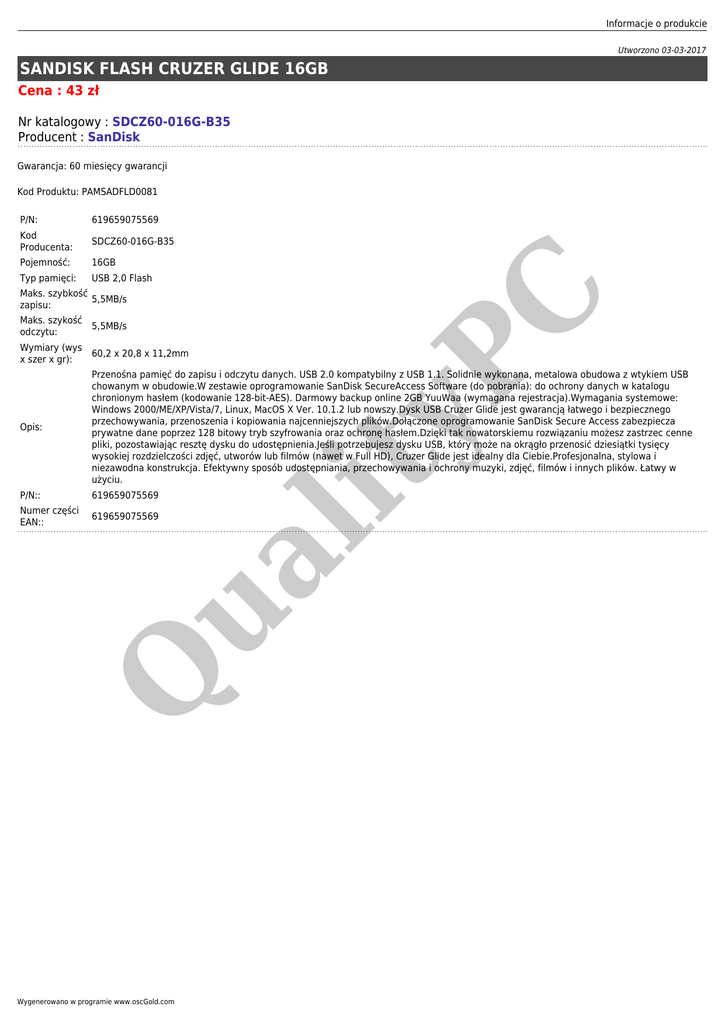 Informacje o produkcie Utworzono 03-03-2017 SANDISK FLASH CRUZER GLIDE 16GB Cena : 43 zł Nr katalogowy : SDCZ60-016G-B35 Producent : SanDisk Gwarancja: 60 miesięcy gwarancji 619659075569 Kod Producenta: SDCZ60-016G-B35 Pojemność: 16GB Typ pamięci: USB 2,0 Flash Maks. szybkość 5,5MB/s zapisu: Maks. szykość 5,5MB/s odczytu: Wymiary (wys 60,2 x 20,8 x 11,2mm x szer x gr): yP P/N: C Kod Produktu: PAMSADFLD0081 P/N:: 619659075569 Numer części EAN:: 619659075569 Q ua lit Opis: Przenośna pamięć do zapisu i odczytu danych. USB 2.0 kompatybilny z USB 1.1. Solidnie wykonana, metalowa obudowa z wtykiem USB chowanym w obudowie.W zestawie oprogramowanie SanDisk SecureAccess Software (do pobrania): do ochrony danych w katalogu chronionym hasłem (kodowanie 128-bit-AES). Darmowy backup online 2GB YuuWaa (wymagana rejestracja).Wymagania systemowe: Windows 2000/ME/XP/Vista/7, Linux, MacOS X Ver. 10.1.2 lub nowszy.Dysk USB Cruzer Glide jest gwarancją łatwego i bezpiecznego przechowywania, przenoszenia i kopiowania najcenniejszych plików.Dołączone oprogramowanie SanDisk Secure Access zabezpiecza prywatne dane poprzez 128 bitowy tryb szyfrowania oraz ochronę hasłem.Dzięki tak nowatorskiemu rozwiązaniu możesz zastrzec cenne pliki, pozostawiając resztę dysku do udostępnienia.Jeśli potrzebujesz dysku USB, który może na okrągło przenosić dziesiątki tysięcy wysokiej rozdzielczości zdjęć, utworów lub filmów (nawet w Full HD), Cruzer Glide jest idealny dla Ciebie.Profesjonalna, stylowa i niezawodna konstrukcja. Efektywny sposób udostępniania, przechowywania i ochrony muzyki, zdjęć, filmów i innych plików. Łatwy w użyciu. Wygenerowano w programie www.oscGold.com