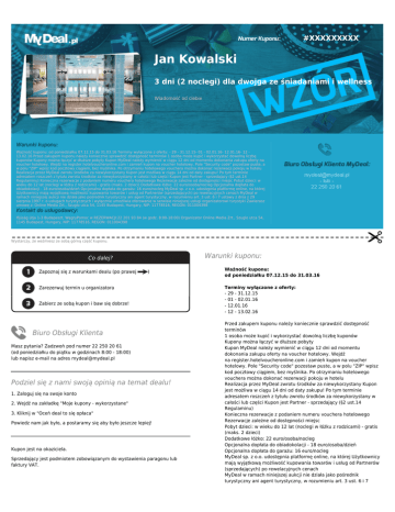 #XXXXXXXXX Jan Kowalski 3 dni (2 noclegi) dla dwojga ze śniadaniami i wellness Wiadomość od ciebie Warunki kuponu: Ważność kuponu: od poniedziałku 07.12.15 do 31.03.16 Terminy wyłączone z oferty: - 29 - 31.12.15- 01 - 02.01.16- 12.01.16- 12 13.02.16 Przed zakupem kuponu należy koniecznie sprawdzić dostępność terminów 1 osoba może kupić i wykorzystać dowolną liczbę kuponów Kupony można łączyć w dłuższe pobyty Kupon MyDeal należy wymienić w ciągu 12 dni od momentu dokonania zakupu oferty na voucher hotelowy. Wejdź na register.hotelvoucheronline.com i zamień kupon na voucher hotelowy. Pole "Security code" pozostaw puste, a w polu "ZIP" wpisz kod pocztowy ciągiem, bez myślnika. Po otrzymaniu hotelowego vouchera można dokonać rezerwacji pokoju w hotelu Realizacja przez MyDeal zwrotu środków za niewykorzystany Kupon jest możliwa w ciągu 14 dni od daty zakupu! Po tym terminie adresatem roszczeń z tytułu zwrotu środków za niewykorzystany w całości lub części Kupon jest Partner - sprzedający (§2 ust.14 Regulaminu) Konieczna rezerwacje z podaniem numeru vouchera hotelowego Rezerwacje zależne od dostępności miejsc Pobyt dzieci: w wieku do 12 lat (noclegi w łóżku z rodzicami) - gratis (maks. 2 dzieci) Dodatkowe łóżko: 22 euro/osoba/nocleg Opcjonalna dopłata do obiadokolacji - 18 euro/osoba/dzień Opcjonalna dopłata do garażu: 16 euro/nocleg MyDeal sp. z o.o. udostępnia platformę online, na której Użytkownicy mają wyjątkową możliwość kupowania towarów i usług od Partnerów (sprzedających) po rewelacyjnych cenach MyDeal w ramach niniejszej aukcji nie działa jako pośrednik turystyczny ani agent turystyczny, w rozumieniu art. 3 ust. 6 i 7 ustawy z dnia z 29 sierpnia 1997 r. o usługach turystycznych i wyłącznie umożliwia oferowanie w serwisie niniejszej usługi organizatorowi turystyki Zawierasz umowę z: Online Media Zrt., Szuglo utca 54, 1145 Budapest, Hungary, NIP: 11778516, REGON: 011004398 Kontakt do usługodawcy: Ifjúság útja 1-3 Budapeszt, WęgryPomoc w REZERWACJI:22 201 93 84 (w godz. 8:00-18:00) Organizator Online Media Zrt., Szuglo utca 54, 1145 Budapest, Hungary, NIP: 11778516, REGON: 011004398 Wystarczy, że weźmiesz ze sobą górną część kuponu. Warunki kuponu: Co dalej? Zapoznaj się z warunkami dealu (po prawej ) Zarezerwuj termin u organizatora Zabierz ze sobą kupon i baw się dobrze! Biuro Obsługi Klienta Masz pytania? Zadzwoń pod numer 22 250 20 61 (od poniedziałku do piątku w godzinach 8:00 - 18:00) lub napisz e-mail na adres [email protected] Podziel się z nami swoją opinią na temat dealu! 1. Zaloguj się na swoje konto 2. Wejdź na zakładkę "Moje kupony - wykorzystane" 3. Kliknij w "Oceń deal to się opłaca" Powiedz nam jak było, a postaramy się aby było jeszcze lepiej! Kupon jest na okaziciela. Sprzedający jest podmiotem zobowiązanym do wystawienia paragonu lub faktury VAT. Ważność kuponu: od poniedziałku 07.12.15 do 31.03.16 Terminy wyłączone z oferty: - 29 - 31.12.15 - 01 - 02.01.16 - 12.01.16 - 12 - 13.02.16 Przed zakupem kuponu należy koniecznie sprawdzić dostępność terminów 1 osoba może kupić i wykorzystać dowolną liczbę kuponów Kupony można łączyć w dłuższe pobyty Kupon MyDeal należy wymienić w ciągu 12 dni od momentu dokonania zakupu oferty na voucher hotelowy. Wejdź na register.hotelvoucheronline.com i zamień kupon na voucher hotelowy. Pole "Security code" pozostaw puste, a w polu "ZIP" wpisz kod pocztowy ciągiem, bez myślnika. Po otrzymaniu hotelowego vouchera można dokonać rezerwacji pokoju w hotelu Realizacja przez MyDeal zwrotu środków za niewykorzystany Kupon jest możliwa w ciągu 14 dni od daty zakupu! Po tym terminie adresatem roszczeń z tytułu zwrotu środków za niewykorzystany w całości lub części Kupon jest Partner - sprzedający (§2 ust.14 Regulaminu) Konieczna rezerwacje z podaniem numeru vouchera hotelowego Rezerwacje zależne od dostępności miejsc Pobyt dzieci: w wieku do 12 lat (noclegi w łóżku z rodzicami) - gratis (maks. 2 dzieci) Dodatkowe łóżko: 22 euro/osoba/nocleg Opcjonalna dopłata do obiadokolacji - 18 euro/osoba/dzień Opcjonalna dopłata do garażu: 16 euro/nocleg MyDeal sp. z o.o. udostępnia platformę online, na której Użytkownicy mają wyjątkową możliwość kupowania towarów i usług od Partnerów (sprzedających) po rewelacyjnych cenach MyDeal w ramach niniejszej aukcji nie działa jako pośrednik turystyczny ani agent turystyczny, w rozumieniu art. 3 ust. 6 i 7 ustawy z dnia z 29 sierpnia 1997 r. o usługach turystycznych i wyłącznie umożliwia oferowanie w serwisie niniejszej usługi organizatorowi turystyki Zawierasz umowę z: Online Media Zrt., Szuglo utca 54, 1145 Budapest, Hungary, NIP: 11778516, REGON: 011004398