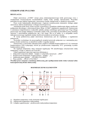 STEROWANIE PS LUMO REGULACJA Pulpit sterowniczy „LUMO” steruje pracą niskotemperaturowego kotła grzewczego wraz z urządzeniami towarzyszącymi (wymiennikiem ciepłej wody, pompą, mieszaczami). Wszystkie potrzebne do tego funkcje regulacyjne i sterownicze zostały zintegrowane w obudowie sterownika. Przez swoje funkcjonalne ukształtowanie i logiczne rozmieszczenie elementów obsługi, pulpit sterowniczy ułatwia eksploatację i wzbogaca kocioł grzewczy. Automatyka kotła może zostać seryjnie wyposażona w kompletne okablowanie dające możliwość podłączenia dowolnego z oferowanych przez firmę „LUMO” regulatorów pogodowych. Zastosowane w automatyce trójpołożeniowe wyłączniki: palnika, pompy centralnego ogrzewania I-go i II-go obiegu grzewczego oraz pompy ładującej wymiennik ciepłej wody, pozwalają na prawidłową pracę instalacji zarówno z sterownikiem pogodowym, jak i bez niego. Ma to tę zaletę, iż w przypadku awarii mikroprocesorowego regulatora istnieje możliwość przejścia na tryb pracy ręcznej. W wersji podstawowej pulpit sterowniczy dostosowany jest do współpracy z regulatorem pokojowym. Wszystkie wychodzące do poszczególnych urządzeń przewody połączone są z automatyką przy pomocy kostki zaciskowej, co umożliwia szybki i wygodny montaż. Zastosowane w sterowniku zabezpieczenia: prądowe (wkładka bezpiecznikowa 6,3 A) i termostat bezpieczeństwa STB wyłączający kocioł po przekroczeniu temperatury 95˚C gwarantują wysokie bezpieczeństwo pracy. Do regulacji temperatury służy termostat regulacyjny TR umożliwiający utrzymywanie stałej temperatury w kotle w zakresie od 55 do 90˚C. Układ sygnalizacji optycznej zapewnia informację o: • Załączeniu/wyłączeniu układu – lampka w wyłączniku sieciowym – „SIEĆ” • Przekroczeniu temperatury bezpieczeństwa – lampka – „T95” • Zakłóceniu pracy palnika – „AWARIA PALNIKA” • Pracy palnika – „PRACA PALNIKA” Wszelkie prace związane z instalacją elektryczną, jak i podłączeniem kotła wolno wykonać tylko koncesjonowanej firmie elektrycznej. ROZMIESZCZENIE ELEMENTÓW A - Regulator temperatury wody (termostat regulacyjny) B - Ogranicznik temperatury maksymalnej B1 - Lampka sygnalizacyjna – przekroczenie maksymalnej temperatury C - Licznik godzin pracy opcja na zamówienie D - Wskaźnik temperatury wody w kotle (termometr) E - Bezpiecznik F - Wyłącznik sieciowy G - Wyłącznik palnika H - Wyłącznik pompy CO I-go obiegu H1 - Wyłącznik pompy CO II-go obiegu I - Wyłącznik pompy ładowania podgrzewacza ciepłej wody użytkowej opcja na zamówienie J - Łącznik umożliwiający sprawdzenie poprawności działania ogranicznika temperatury K - Lampka kontrolna – praca palnika L - Lampka kontrolna – awaria palnika M - Sterownik pogodowy opcja na zamówienie PODŁĄCZENIE ELEKTRYCZNE ORAZ PARAMETRY TECHNICZNE PULPITU STEROWNICZEGO • • • • • • • • Pulpit sterowniczy zasilany jest z sieci prądu przemiennego o napięciu ~220V. Przy prowadzeniu kabli należy zwrócić uwagę na to, aby nie dotykały one gorących elementów kotła i instalacji centralnego ogrzewania (odprowadzenie spalin, rury grzewcze). Wszelkie prace związane z instalacją elektryczną, jak i podłączeniem kotła wolno wykonać tylko koncesjonowanej firmie elektrycznej z zachowaniem wszelkich obowiązujących norm i przepisów. Parametry techniczne pulpitu: Napięcie znamionowe: AC 220V~ Częstotliwość znamionowa 50Hz Natężenie znamionowe AC 6,3A Pobór mocy 400W Stopień ochrony szafki IP 40 Stopień ochrony armatury zewnętrznej IP 44 Wymiary panelu 428x140x177 Masa panelu 1, 2kg
