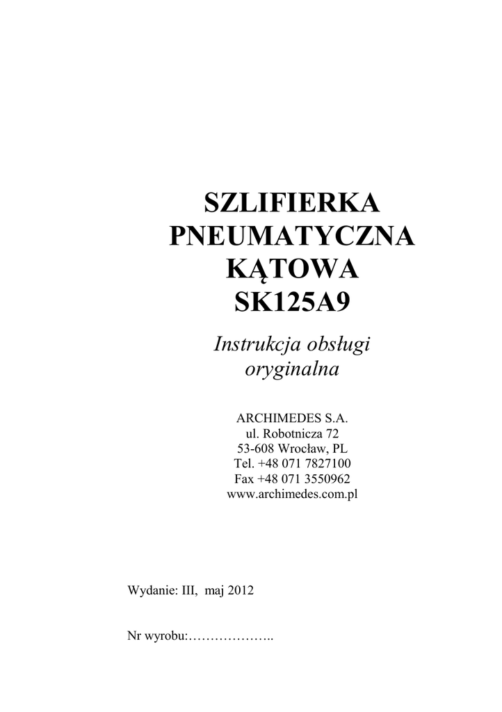 SZLIFIERKA PNEUMATYCZNA KĄTOWA SK125A9 Instrukcja obsługi oryginalna ARCHIMEDES S.A. ul. Robotnicza 72 53-608 Wrocław, PL Tel. +48 071 7827100 Fax +48 071 3550962 www.archimedes.com.pl Wydanie: III, maj 2012 Nr wyrobu:……………….. 1. WSTĘP Niniejsza instrukcja powinna być starannie przechowywana i zawsze dostępna dla operatora, zakładowej służby BHP i innych osób związanych z obsługą narzędzi pneumatycznych. Informacje tu zawarte są istotne z punktu widzenia bezpieczeństwa pracy, właściwej eksploatacji, konserwacji i utylizacji wyrobu, a ponadto ułatwiają zamawianie części zamiennych. Operator – przed przystąpieniem do pracy – powinien dokładnie zapoznać się z treścią niniejszego dokumentu i upewnić się, że informacje tu zawarte są dla niego zrozumiałe. W przypadku jakichkolwiek wątpliwości dotyczących użytkowania naszych wyrobów, prosimy o kontakt ze sprzedawcą lub bezpośrednio z firmą Archimedes we Wrocławiu. Identyfikacja czasu produkcji wyrobu Narzędzia pneumatyczne posiadają trwały, indywidualny numer fabryczny składający się z co najmniej pięciu cyfr. Dwie pierwsze cyfry odnoszą się do roku budowy wyrobu, a następne oznaczają kolejny egzemplarz wyrobu wyprodukowanego w danym roku. 2 CHARAKTERYSTYKA I PRZEZNACZENIE WYROBU Szlifierka pneumatyczna kątowa SK125A9 zaprojektowana jest do wykonywania ręcznych prac szlifierskich. Po wymianie ściernicy na szczotkę (zwykłą drucianą lub z nasypem ściernym) może być używana do czyszczenia elementów metalowych, usuwania rdzy, starych powłok lakierniczych i do innych podobnych prac. Przeznaczona jest do szlifowania czołową powierzchnią ściernicy i służy głównie do wyrównywania powierzchni zbiorników, odlewów, odkuwek, przygotowania złączy spawanych, szlifowania spoin itp. Po zainstalowaniu tarcz ściernych do cięcia, może służyć do obcinania niewielkich nadlewów, przecinania rur, prętów i innych kształtowników, których przekroje nie przekraczają więcej niż kilkadziesiąt mm grubości. Może być również wykorzystana do obróbki materiałów niemetalowych. Szlifierka SK125A9 wyposażona jest w przewód odprowadzający powietrze poza strefę pracy operatora, co poprawia warunki pracy tym narzędziem. Wyposażona jest w rękojeść, która może być zamontowana -1- z lewej lub prawej strony narzędzia, co umożliwia pracę, zarówno osobom prawo-, jak i leworęcznym. Posiada solidną i przestawną osłonę ściernicy, która chroni operatora przed obrażeniami i pozwala mu na zajęcie najbardziej dogodnej pozycji podczas pracy. Zaopatrzona jest w system dynamicznego wyważania tarcz szlifierskich, który minimalizuje drgania przenoszone na części chwytowe narzędzia. Szlifierki te znajdują szerokie zastosowanie w przemyśle stoczniowym, elektromaszynowym, odlewniczym, kuzienniczym, konstrukcji stalowych i innych zakładach branży metalowej. 3. PARAMETRY TECHNICZNO - EKSPLOATACYJNE Wymiary ściernicy ( DxUxH ) - 125x(28)x22,2 mm Rodzaj ściernicy (wg PN-ISO 525) - 27; 41 lub 42 Wymagana prędkość obwodowa ściernicy (min) - 80 m/s Prędkość obrotowa biegu luzem (max) - 12000 obr./min. Moc - 1,2 kW Zużycie powietrza (max) - 80 m3/h Długość (bez przewodów) - 223 mm Masa (bez ściernicy) - 2,0 kg Gniazdo końcówki powietrznej - G 3/8 Wewnętrzna średnica przewodu powietrznego - 12,5 mm Poziom ciśnienia akustycznego na stanowisku pracy - 85,8 1) ± 1,10 dB(A) Poziom mocy akustycznej - 93,7 1) ± 1,60 dB(A) Całkowita wartość drgań - 2,99 2) ± 0,11 m/s2 1) 2) mierzone zgodnie z PN-EN ISO 15744 mierzone zgodnie z PN-EN SO 28927-1 4. BEZPIECZEŃSTWO Operator przed przystąpieniem do pracy szlifierką powinien być dokładnie zapoznany z przepisami obowiązującymi na swoim stanowisku pracy oraz z treścią niniejszej instrukcji obsługi. Ściśle przestrzegać ogólnych przepisów dotyczących pracy zmechanizowanymi narzędziami ręcznymi. -2- Szlifierka nie posiada powłoki izolacyjnej. Zetknięcie się narzędzia ze źródłem energii elektrycznej grozi porażeniem operatora. Zawsze należy odłączyć narzędzie od sieci sprężonego powietrza przed wykonaniem jakichkolwiek czynności związanych z wymianą narzędzia roboczego (ściernicy, szczotki) lub przed przeprowadzeniem konserwacji czy naprawy narzędzia. Stosować tarcze szlifierskie o zalecanej wielkości, właściwego kształtu i wytrzymałości oraz bez uszkodzeń mechanicznych. Sprawdzać, czy tarcza szlifierska jest przystosowana do pracy z prędkością obrotową, jaką uzyskuje szlifierka (patrz punkt 3). Okresowo i po każdym demontażu sprawdzać obroty biegu luzem wrzeciona. Obroty zmierzone przy ciśnieniu 0,63 MPa nie mogą przekraczać obrotów nominalnych narzędzia. Nie wolno zwiększać ciśnienia powietrza powyżej 0,63 MPa. Nie wolno pracować szlifierką bez osłony tarczy ściernej. Unikać sytuacji, gdy podczas szlifowania nie ma możliwości obserwowania strefy pracy. Bezzwłocznie przerwać pracę, gdy nastąpi poluzowanie się tarczy szlifierskiej na wrzecionie. Nie usuwać blokady z dźwigni uruchamiającej narzędzie /poz. 28/, chroniącej przed przypadkowym uruchomieniem narzędzia. Nie blokować dźwigni uruchamiającej narzędzie w pozycji „praca”. Dźwignia ta po zwolnieniu nacisku ręki powinna wracać w położenie spoczynkowe, a narzędzie powinno się wyłączyć. Zadbać o to, by w miejscu pracy był łatwy dostęp do urządzeń odcinających dopływ powietrza. Nie stosować uszkodzonych węży powietrznych. Wąż taki może być przyczyną wypadku. Stosować węże obliczone na ciśnienie robocze wynoszące co najmniej 0,63 MPa. Unikać nadmiernego smarowania narzędzia, ponieważ olej wydostający się z narzędzia w postaci mgły jest szkodliwy dla środowiska naturalnego i dla operatora. Pomieszczenie pracy powinno być dobrze wentylowane. W przypadku przedostania się smaru lub oleju do oczu, należy bezwzględnie skorzystać 