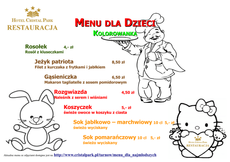 MENU DLA DZIECI KOLOROWANKA Rosołek 4,- zł Rosół z kluseczkami Jeżyk patriota 8,50 zł Filet z kurczaka z frytkami i jabłkiem Gąsieniczka 6,50 zł Makaron tagliatelle z sosem pomidorowym Rozgwiazda 4,50 zł Naleśnik z serem i wiśniami Koszyczek 5,- zł świeże owoce w koszyku z ciasta Sok jabłkowo – marchwiowy 10 cl świeżo wyciskany Sok pomarańczowy 10 cl 5,- zł świeżo wyciskany Aktualne menu ze zdjęciami dostępne jest na http://www.cristalpark.pl/tarnow/menu_dla_najmlodszych 5,- zł