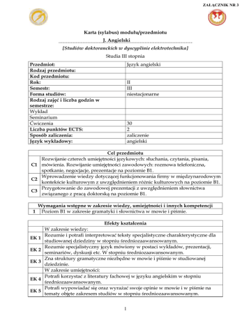 ZAŁĄCZNIK NR 3 Karta (sylabus) modułu/przedmiotu J. Angielski [Studiów doktoranckich w dyscyplinie elektrotechnika] Studia III stopnia Przedmiot: Rodzaj przedmiotu: Kod przedmiotu: Rok: Semestr: Forma studiów: Rodzaj zajęć i liczba godzin w semestrze: Wykład Seminarium Ćwiczenia Liczba punktów ECTS: Sposób zaliczenia: Język wykładowy: Język angielski II III niestacjonarne 30 2 zaliczenie angielski Cel przedmiotu Rozwijanie czterech umiejętności językowych: słuchania, czytania, pisania, C1 mówienia. Rozwijanie umiejętności zawodowych: rozmowa telefoniczna, spotkanie, negocjacje, prezentacje na poziomie B1. Wprowadzenie wiedzy dotyczącej funkcjonowania firmy w międzynarodowym C2 kontekście kulturowym z uwzględnieniem różnic kulturowych na poziomie B1. Przygotowanie do zawodowej prezentacji z uwzględnieniem słownictwa C3 związanego z pracą doktorską na poziomie B1. 1 Wymagania wstępne w zakresie wiedzy, umiejętności i innych kompetencji Poziom B1 w zakresie gramatyki i słownictwa w mowie i piśmie. Efekty kształcenia EK 1 EK 2 EK 3 EK 4 EK 5 W zakresie wiedzy: Rozumie i potrafi interpretować teksty specjalistyczne charakterystyczne dla studiowanej dziedziny w stopniu średniozaawansowanym. Rozumie specjalistyczny język mówiony w postaci wykładów, prezentacji, seminariów, dyskusji etc. W stopniu średniozaawansowanym. Zna struktury gramatyczne niezbędne w mowie i piśmie w studiowanej dziedzinie. W zakresie umiejętności: Potrafi korzystać z literatury fachowej w języku angielskim w stopniu średniozaawansowanym. Potrafi wypowiadać się oraz wyrażać swoje opinie w mowie i w piśmie na tematy objęte zakresem studiów w stopniu średniozaawansowanym. 1 W zakresie kompetencji społecznych: Potrafi samodzielnie posługiwać się językiem angielskim w obszarze EK 6 studiowanej dziedziny. Potrafi samodzielnie wyszukiwać informacje w literaturze specjalistycznej w EK 7 języku angielskim. Ćw1 Ćw2 Ćw3 Ćw 4 Ćw 5 Ćw 6 Ćw 7 Ćw 8 Ćw 9 Ćw 10 Ćw 11 Ćw 12 Ćw 13 Ćw 14 Ćw 15 Ćw 16 Ćw 17 Ćw 18 Ćw 19 Ćw 20 Ćw 21 Treści programowe przedmiotu Forma zajęć – Ćwiczenia Treści programowe Praca i studia; narodowości, przedstawienie siebie i innych, pisanie e – mail. Praca i wypoczynek; dnie, miesiące, daty, określanie czasu i częstotliwości, Simple Present; wprowadzenie. Rozmawiamy o pracy i wypoczynku; czas Simple Present. Zdania twierdzące; przysłówki częstotliwości. Problemy, Simple Present; pytania i przeczenia, rozwiązywanie problemów przez telefon. Podróż: alfabet, liczebniki, czasownik modalny can/can’t, konstrukcje there is/there are. Posiłki i rozrywka; potrawy, rzeczowniki policzalne i niepoliczalne, wyrażenia some/any; zwroty przydatne w restauracji. Kupno i sprzedaż; czas Simple Past – zd. twierdzące, prezentacja produktu. Utrwalenie i powtórka – test 1 Ludzie: cechy charakteru; czas Past Simple – pytania i przeczenia; negocjacje. Rynek; stopniowanie przymiotników much/a lot, a little/a bit; przedstawienie nowego produktu. Firma; czas Present Continuous w kontraście z Present Simple; przygotowanie do prezentacji. Internet; plany na przyszłość; wyrażanie przyszłości; Present Continuous, struktura going to, czas Future Simple, umawianie się na spotkania. Relacje inter – kulturalne; czasowniki modalne should/shouldn’t, could/would; identyfikacja problemu. Praca; prezentacja umiejętności(CV), czas: Present Perfect versus Simple Past. Utrwalenie i powtórka – test 2 Praca zawodowa; czasowniki modalne(1) do wyrażania umiejętności próśb, propozycji; nawiązywanie kontaktu przez telefon. Zakupy online; czasowniki modalne(2) must/need to/have to/should; negocjacje – osiąganie porozumienia. Firmy; czas Present Simple i Past Continuous; prezentacja firmy – wprowadzenie. Genialne pomysły; czas Past Simple i Past Continuous; przygotowanie zebrania biznesowego. Stres; czas Past Simple i Present Perfect, partycypacja – jak brać udział w dyskusji. Rozrywka; posiłki, czasowniki złożone, rozmowy towarzyskie. 2 Ćw 22 Ćw 23 Pisanie CV, list motywacyjny, raport, ulotka reklamowa. Utrwalenie i powtórka – test 1 Metody dydaktyczne 1 2 3 Ćwiczenia audytoryjne Konwersatoria Translatoria Obciążenie pracą doktoranta Średnia liczba godzin na zrealizowanie Forma aktywności aktywności Godziny kontaktowe z wykładowcą, w 33 tym: Udział w ćwiczeniach 30 Konsultacje 3 Praca własna doktoranta, w tym: 67 Przygotowanie do ćwiczeń 67 Łączny czas pracy doktoranta 100 Sumaryczna liczba punktów ECTS dla 2 przedmiotu, w tym: Liczba punktów ECTS uzyskiwana podczas zajęć wymagających bezpośredniego udziału wykładowcy Liczba punktów ECTS w ramach zajęć o charakterze praktycznym (seminaria, 2 warsztaty, itp.) 1 2 1 2 3 Literatura podstawowa B1: Market Leader pre-intermediate, David Cotton, David Favley, Simon Kent (Longman) Essential Grammar in Use, Reymond Murphy (Cambridge University Press) Literatura uzupełniająca seria Test Your Business English (Longman) video: Vicki Hollett – Oxford Meeting Objectives Rick Baldwin, Dawid Heitley Creating Opportunities Macierz efektów kształcenia Odniesienie danego efektu kształcenia do Metody/ Efekt efektów Cele Treści Narzędzia kształcenia zdefiniowanych przedmiotu programowe dydaktyczne dla całego programu (PEK) IM1A_U01(+) 1,2,3 ĆW1, ĆW2, EK 1 C1, C2, C3, IM1A_U02(+) ĆW3, ĆW4, 3 Sposób oceny O1, O2, O3 EK 2 EK 3 EK 4 EK 5 EK 6 EK 7 IM1A_U05(++) IM1A_U06(+) IM1A_U01(+) IM1A_U02(+) IM1A_U05(++) IM1A_U06(+) IM1A_U01(+) IM1A_U02(+) IM1A_U05(++) IM1A_U06(+) IM1A_U01(+) IM1A_U02(+) IM1A_U05(++) IM1A_U06(+) IM1A_U01(+) IM1A_U02(+) IM1A_U05(++) IM1A_U06(+) IM1A_K01(+) IM1A_K05(+) IM1A_K01(+) IM1A_K05(+) C1, C2, C3 C1, C2, C3 C1, C2, C3 ĆW5, ĆW6, ĆW7, ĆW9, ĆW10, ĆW11, ĆW12, ĆW13, ĆW14, ĆW16, CW17, ĆW18, ĆW19, ĆW20, ĆW21, ĆW22 1,2,3 O1, O2, O3 1,2,3 O1, O2, O3 1,2,3 O1, O2, O3 1,2,3 O1, O3 1,2,3 O1, O2, O3 O1, O2