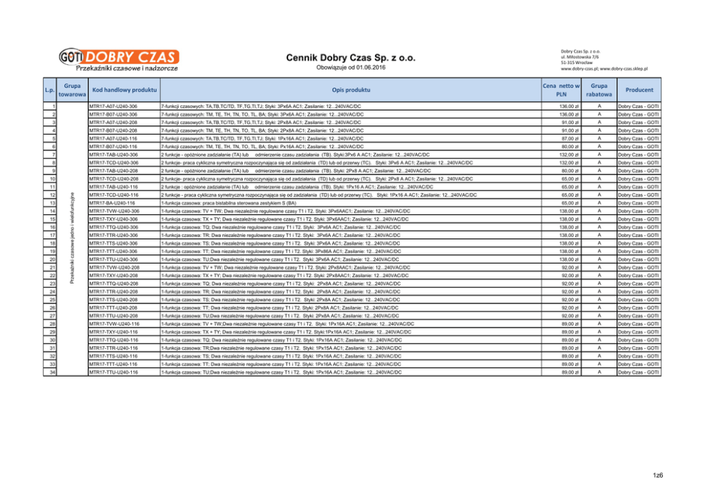 Cennik Dobry Czas Sp. z o.o. Obowiązuje od 01.06.2016 L.p. Grupa Kod handlowy produktu towarowa Opis produktu Dobry Czas Sp. z o.o. ul. Miłostowska 7/6 51-315 Wrocław www.dobry-czas.pl; www.dobry-czas.sklep.pl Cena netto w PLN Grupa rabatowa Producent Dobry Czas - GOTI 1 MTR17-A07-U240-306 7-funkcji czasowych: TA,TB,TC/TD, TF,TG,TI,TJ; Styki: 3Px6A AC1; Zasilanie: 12...240VAC/DC 136,00 zł A 2 MTR17-B07-U240-306 7-funkcji czasowych: TM, TE, TH, TN, TO, TL, BA; Styki: 3Px6A AC1; Zasilanie: 12...240VAC/DC 136,00 zł A Dobry Czas - GOTI 3 MTR17-A07-U240-208 7-funkcji czasowych: TA,TB,TC/TD, TF,TG,TI,TJ; Styki: 2Px8A AC1; Zasilanie: 12...240VAC/DC 91,00 zł A Dobry Czas - GOTI 4 MTR17-B07-U240-208 7-funkcji czasowych: TM, TE, TH, TN, TO, TL, BA; Styki: 2Px8A AC1; Zasilanie: 12...240VAC/DC 91,00 zł A Dobry Czas - GOTI 5 MTR17-A07-U240-116 7-funkcji czasowych: TA,TB,TC/TD, TF,TG,TI,TJ; Styki: 1Px16A AC1; Zasilanie: 12...240VAC/DC 87,00 zł A Dobry Czas - GOTI 6 MTR17-B07-U240-116 7-funkcji czasowych: TM, TE, TH, TN, TO, TL, BA; Styki: Px16A AC1; Zasilanie: 12...240VAC/DC 7 MTR17-TAB-U240-306 2 funkcje - opóżnione zadziałanie (TA) lub 8 MTR17-TCD-U240-306 2 funkcje- praca cykliczna symetryczna rozpoczynająca się od zadziałania (TD) lub od przerwy (TC). Styki: 3Px6 A AC1; Zasilanie: 12...240VAC/DC 9 MTR17-TAB-U240-208 2 funkcje - opóżnione zadziałanie (TA) lub odmierzenie czasu zadziałania (TB). Styki:3Px6 A AC1; Zasilanie: 12...240VAC/DC odmierzenie czasu zadziałania (TB). Styki: 2Px8 A AC1; Zasilanie: 12...240VAC/DC 80,00 zł A Dobry Czas - GOTI 132,00 zł A Dobry Czas - GOTI 132,00 zł A Dobry Czas - GOTI 80,00 zł A Dobry Czas - GOTI MTR17-TCD-U240-208 2 funkcje- praca cykliczna symetryczna rozpoczynająca się od zadziałania (TD) lub od przerwy (TC). Styki: 2Px8 A AC1; Zasilanie: 12...240VAC/DC 65,00 zł A Dobry Czas - GOTI MTR17-TAB-U240-116 2 funkcje : opóżnione zadziałanie (TA) lub 65,00 zł A Dobry Czas - GOTI 12 13 14 15 16 17 18 19 20 21 22 23 Przekaźniki czasowe jedno i wielofunkcyjne 10 11 odmierzenie czasu zadziałania (TB). Styki: 1Px16 A AC1; Zasilanie: 12...240VAC/DC MTR17-TCD-U240-116 2 funkcje - praca cykliczna symetryczna rozpoczynająca się od zadziałania (TD) lub od przerwy (TC). Styki: 1Px16 A AC1; Zasilanie: 12...240VAC/DC 65,00 zł A Dobry Czas - GOTI MTR17-BA-U240-116 1-funkcja czasowa: praca bistabilna sterowana zestykiem S (BA) 65,00 zł A Dobry Czas - GOTI MTR17-TVW-U240-306 1-funkcja czasowa: TV + TW; Dwa niezależnie regulowane czasy T1 i T2. Styki: 3Px6AAC1; Zasilanie: 12...240VAC/DC 138,00 zł A Dobry Czas - GOTI MTR17-TXY-U240-306 1-funkcja czasowa: TX + TY; Dwa niezależnie regulowane czasy T1 i T2. Styki: 3Px6AAC1; Zasilanie: 12...240VAC/DC 138,00 zł A Dobry Czas - GOTI MTR17-TTQ-U240-306 1-funkcja czasowa: TQ; Dwa niezależnie regulowane czasy T1 i T2. Styki: 3Px6A AC1; Zasilanie: 12...240VAC/DC 138,00 zł A Dobry Czas - GOTI MTR17-TTR-U240-306 1-funkcja czasowa: TR; Dwa niezależnie regulowane czasy T1 i T2. Styki: 3Px6A AC1; Zasilanie: 12...240VAC/DC 138,00 zł A Dobry Czas - GOTI MTR17-TTS-U240-306 1-funkcja czasowa: TS; Dwa niezależnie regulowane czasy T1 i T2. Styki: 3Px6A AC1; Zasilanie: 12...240VAC/DC 138,00 zł A Dobry Czas - GOTI MTR17-TTT-U240-306 1-funkcja czasowa: TT; Dwa niezależnie regulowane czasy T1 i T2. Styki: 3Px86A AC1; Zasilanie: 12...240VAC/DC 138,00 zł A Dobry Czas - GOTI MTR17-TTU-U240-306 1-funkcja czasowa: TU;Dwa niezależnie regulowane czasy T1 i T2. Styki: 3Px6A AC1; Zasilanie: 12...240VAC/DC 138,00 zł A Dobry Czas - GOTI MTR17-TVW-U240-208 1-funkcja czasowa: TV + TW; Dwa niezależnie regulowane czasy T1 i T2. Styki: 2Px8AAC1; Zasilanie: 12...240VAC/DC 92,00 zł A Dobry Czas - GOTI MTR17-TXY-U240-208 1-funkcja czasowa: TX + TY; Dwa niezależnie regulowane czasy T1 i T2. Styki: 2Px8AAC1; Zasilanie: 12...240VAC/DC 92,00 zł A Dobry Czas - GOTI MTR17-TTQ-U240-208 1-funkcja czasowa: TQ; Dwa niezależnie regulowane czasy T1 i T2. Styki: 2Px8A AC1; Zasilanie: 12...240VAC/DC 92,00 zł A Dobry Czas - GOTI 24 MTR17-TTR-U240-208 1-funkcja czasowa: TR; Dwa niezależnie regulowane czasy T1 i T2. Styki: 2Px8A AC1; Zasilanie: 12...240VAC/DC 92,00 zł A Dobry Czas - GOTI 25 MTR17-TTS-U240-208 1-funkcja czasowa: TS; Dwa niezależnie regulowane czasy T1 i T2. Styki: 2Px8A AC1; Zasilanie: 12...240VAC/DC 92,00 zł A Dobry Czas - GOTI 26 MTR17-TTT-U240-208 1-funkcja czasowa: TT; Dwa niezależnie regulowane czasy T1 i T2. Styki: 2Px8A AC1; Zasilanie: 12...240VAC/DC 92,00 zł A Dobry Czas - GOTI 27 MTR17-TTU-U240-208 1-funkcja czasowa: TU;Dwa niezależnie regulowane czasy T1 i T2. Styki: 2Px8A AC1; Zasilanie: 12...240VAC/DC 92,00 zł A Dobry Czas - GOTI 28 MTR17-TVW-U240-116 1-funkcja czasowa: TV + TW;Dwa niezależnie regulowane czasy T1 i T2. Styki: 1Px16A AC1; Zasilanie: 12...240VAC/DC 89,00 zł A Dobry Czas - GOTI 29 MTR17-TXY-U240-116 1-funkcja czasowa: TX + TY; Dwa niezależnie regulowane czasy T1 i T2. Styki:1Px16A AC1; Zasilanie: 12...240VAC/DC 89,00 zł A Dobry Czas - GOTI 30 MTR17-TTQ-U240-116 1-funkcja czasowa: TQ; Dwa niezależnie regulowane czasy T1 i T2. Styki: 1Px16A AC1; Zasilanie: 12...240VAC/DC 89,00 zł A Dobry Czas - GOTI 31 MTR17-TTR-U240-116 1-funkcja czasowa: TR;Dwa niezależnie regulowane czasy T1 i T2. Styki: 1Px15A AC1; Zasilanie: 12...240VAC/DC 89,00 zł A Dobry Czas - GOTI 32 MTR17-TTS-U240-116 1-funkcja czasowa: TS; Dwa niezależnie regulowane czasy T1 i T2. Styki: 1Px16A AC1; Zasilanie: 12...240VAC/DC 89,00 zł A Dobry Czas - GOTI 33 MTR17-TTT-U240-116 1-funkcja czasowa: TT; Dwa niezależnie regulowane czasy T1 i T2. Styki: 1Px16A AC1; Zasilanie: 12...240VAC/DC 89,00 zł A Dobry Czas - GOTI 34 MTR17-TTU-U240-116 1-funkcja czasowa: TU;Dwa niezależnie regulowane czasy T1 i T2. Styki: 1Px16A AC1; Zasilanie: 12...240VAC/DC 89,00 zł A Dobry Czas - GOTI 1z6 L.p. Grupa Kod handlowy produktu towarowa Opis produktu Cena netto w PLN Grupa rabatowa Producent MTR17-TTZ-U240-216 Sterownik do przełącznika gw