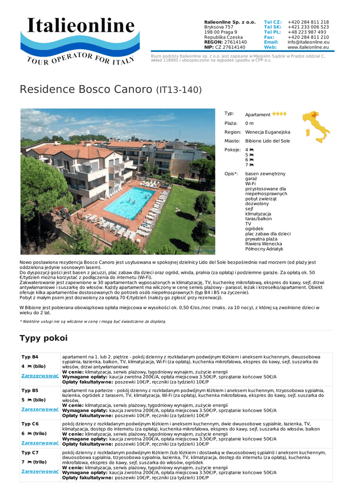 Italieonline Sp. z o.o. Bryksova 757 198 00 Praga 9 Republika Czeska REGON: 27614140 NIP: CZ 27614140 Tel CZ: Tel SK: Tel PL: Fax: Email: Web: +420 284 811 218 +421 233 006 523 +48 223 987 493 +420 284 811 210 [email protected] www.italieonline.eu Biuro podróży Italieonline sp. z o.o. jest zapisane w Miejskim Sądzie w Pradze oddział C, wkład 118991 i ubezpieczone na wypadek upadku w ČPP a.s. Residence Bosco Canoro (IT13-140) Typ: Apartament Plaża: 0m Region: Wenecja Euganejska Miasto: Bibione Lido del Sole Pokoje: 4 5 6 7 Opis*: basen zewnętrzny garaż Wi-Fi przystosowane dla niepełnosprawnych pobyt zwierząt dozwolony sejf klimatyzacja taras/balkon TV ogródek plac zabaw dla dzieci prywatna plaża Riwiera Wenecka Północny Adriatyk Nowo postawiona rezydencja Bosco Canoro jest usytuowana w spokojnej dzielnicy Lido del Sole bezpośrednio nad morzem (od plaży jest oddzielona jedynie sosnowym lasem). Do dyspozycji gości jest basen z jacuzzi, plac zabaw dla dzieci oraz ogród, winda, pralnia (za opłatą) i podziemne garaże. Za opłatą ok. 50 €/tydzień można korzystać z podłączenia do internetu (Wi-Fi). Zakwaterowanie jest zapewnione w 30 apartamentach wyposażonych w klimatyzację, TV, kuchenkę mikrofalową, ekspres do kawy, sejf, drzwi antywłamaniowe i suszarkę do włosów. Każdy apartament ma wliczony w cenę serwis plażowy - parasol, leżak i krzesełko/apartament. Obiekt oferuje kilka apartamentów dostosowanych do potrzeb osób niepełnosprawnych (typ B4 i B5 na życzenie). Pobyt z małym psem jest dozwolony za opłatą 70 €/tydzień (należy go zgłosić przy rezerwacji). W Bibione jest pobierana obowiązkowa opłata miejscowa w wysokości ok. 0,50 €/os./noc (maks. za 10 nocy), z której są zwolnione dzieci w wieku do 2 lat. * Niektóre usługi nie są wliczone w cenę i mogą być świadczone za dopłatą. Typy pokoi Typ B4 apartament na 1. lub 2. piętrze - pokój dzienny z rozkładanym podwójnym łóżkiem i aneksem kuchennym, dwuosobowa sypialnia, łazienka, balkon, TV, klimatyzacja, Wi-Fi (za opłatą), kuchenka mikrofalowa, ekspres do kawy, sejf, suszarka do 4 (bilo) włosów, drzwi antywłamaniowe W cenie: klimatyzacja, serwis plażowy, tygodniowy wynajem, zużycie energii Zarezerwować Wymagane opłaty: kaucja zwrotna 200€/A, opłata miejscowa 3.50€/P, sprzątanie końcowe 50€/A Opłaty fakultatywne: poszewki 10€/P, ręczniki (za tydzień) 10€/P Typ B5 apartament na parterze - pokój dzienny z rozkładanym podwójnym łóżkiem i aneksem kuchennym, trzyosobowa sypialnia, łazienka, ogródek z tarasem, TV, klimatyzacja, Wi-Fi (za opłatą), kuchenka mikrofalowa, ekspres do kawy, sejf, suszarka do 5 (bilo) włosów, W cenie: klimatyzacja, serwis plażowy, tygodniowy wynajem, zużycie energii Zarezerwować Wymagane opłaty: kaucja zwrotna 200€/A, opłata miejscowa 3.50€/P, sprzątanie końcowe 50€/A Opłaty fakultatywne: poszewki 10€/P, ręczniki (za tydzień) 10€/P Typ C6 pokój dzienny z rozkładanym podwójnym łóżkiem i aneksem kuchennym, dwie dwuosobowe sypialnie, łazienka, TV, klimatyzacja, dostęp do internetu (za opłatą), kuchenka mikrofalowa, ekspres do kawy, sejf, suszarka do włosów, balkon 6 (trilo) W cenie: klimatyzacja, serwis plażowy, tygodniowy wynajem, zużycie energii Wymagane opłaty: kaucja zwrotna 200€/A, opłata miejscowa 3.50€/P, sprzątanie końcowe 50€/A Zarezerwować Opłaty fakultatywne: poszewki 10€/P, ręczniki (za tydzień) 10€/P Typ C7 pokój dzienny z rozkładanym podwójnym łóżkiem (lub łóżkiem i dostawką w dwuosobowej sypialni) i aneksem kuchennym, dwuosobowa sypialnia, trzyosobowa sypialnia, łazienka, TV, klimatyzacja, dostęp do internetu (za opłatą), kuchenka 7 (trilo) mikrofalowa, ekspres do kawy, sejf, suszarka do włosów, ogródek W cenie: klimatyzacja, serwis plażowy, tygodniowy wynajem, zużycie energii Zarezerwować Wymagane opłaty: kaucja zwrotna 200€/A, opłata miejscowa 3.50€/P, sprzątanie końcowe 50€/A Opłaty fakultatywne: poszewki 10€/P, ręczniki (za tydzień) 10€/P P - cena na osobę, A - cena za apartament/pokój Prezentowane zdjęcia są przykładowe. https://www.italieonline.eu/pl/bibione/residence-bosco-canoro-140.html www.ITALIEONLINE.eu TOUR OPERATOR FOR ITALY