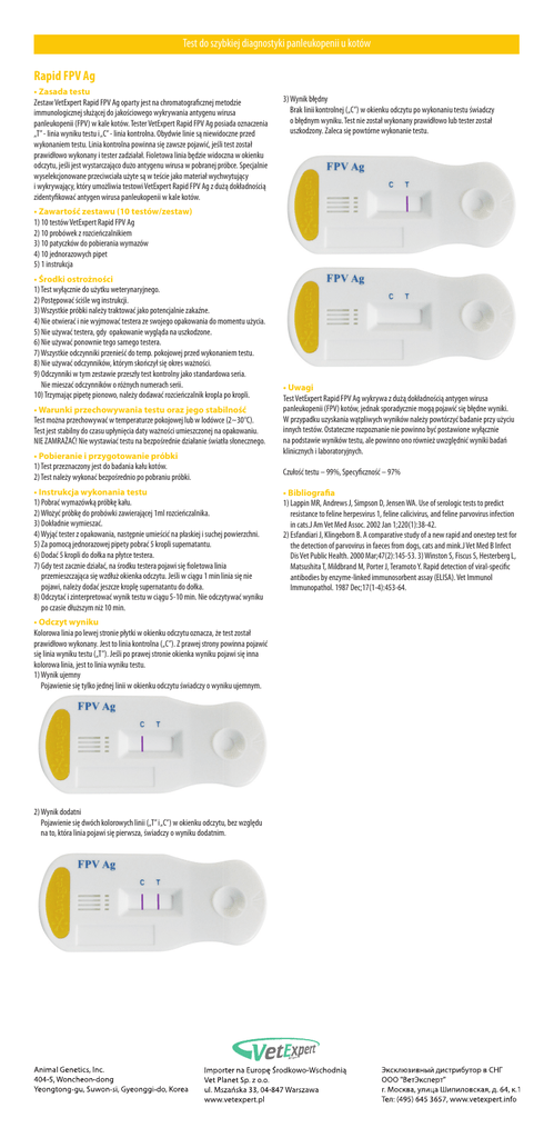 Test do szybkiej diagnostyki panleukopenii u kotów Rapid FPV Ag • Zasada testu Zestaw VetExpert Rapid FPV Ag oparty jest na chromatograficznej metodzie immunologicznej służącej do jakościowego wykrywania antygenu wirusa panleukopenii (FPV) w kale kotów. Tester VetExpert Rapid FPV Ag posiada oznaczenia „T” - linia wyniku testu i „C” - linia kontrolna. Obydwie linie są niewidoczne przed wykonaniem testu. Linia kontrolna powinna się zawsze pojawić, jeśli test został prawidłowo wykonany i tester zadziałał. Fioletowa linia będzie widoczna w okienku odczytu, jeśli jest wystarczająco dużo antygenu wirusa w pobranej próbce. Specjalnie wyselekcjonowane przeciwciała użyte są w teście jako materiał wychwytujący i wykrywający, który umożliwia testowi VetExpert Rapid FPV Ag z dużą dokładnością zidentyfikować antygen wirusa panleukopenii w kale kotów. 3) Wynik błędny Brak linii kontrolnej („C”) w okienku odczytu po wykonaniu testu świadczy o błędnym wyniku. Test nie został wykonany prawidłowo lub tester został uszkodzony. Zaleca się powtórne wykonanie testu. • Zawartość zestawu (10 testów/zestaw) 1) 10 testów VetExpert Rapid FPV Ag 2) 10 probówek z rozcieńczalnikiem 3) 10 patyczków do pobierania wymazów 4) 10 jednorazowych pipet 5) 1 instrukcja • Środki ostrożności 1) Test wyłącznie do użytku weterynaryjnego. 2) Postępować ściśle wg instrukcji. 3) Wszystkie próbki należy traktować jako potencjalnie zakaźne. 4) Nie otwierać i nie wyjmować testera ze swojego opakowania do momentu użycia. 5) Nie używać testera, gdy opakowanie wygląda na uszkodzone. 6) Nie używać ponownie tego samego testera. 7) Wszystkie odczynniki przenieść do temp. pokojowej przed wykonaniem testu. 8) Nie używać odczynników, którym skończył się okres ważności. 9) Odczynniki w tym zestawie przeszły test kontrolny jako standardowa seria. Nie mieszać odczynników o różnych numerach serii. 10) Trzymając pipetę pionowo, należy dodawać rozcieńczalnik kropla po kropli. • Warunki przechowywania testu oraz jego stabilność Test można przechowywać w temperaturze pokojowej lub w lodówce (2~30°C). Test jest stabilny do czasu upłynięcia daty ważności umieszczonej na opakowaniu. NIE ZAMRAŻAĆ! Nie wystawiać testu na bezpośrednie działanie światła słonecznego. • Pobieranie i przygotowanie próbki 1) Test przeznaczony jest do badania kału kotów. 2) Test należy wykonać bezpośrednio po pobraniu próbki. • Instrukcja wykonania testu 1) Pobrać wymazówką próbkę kału. 2) Włożyć próbkę do probówki zawierającej 1ml rozcieńczalnika. 3) Dokładnie wymieszać. 4) Wyjąć tester z opakowania, następnie umieścić na płaskiej i suchej powierzchni. 5) Za pomocą jednorazowej pipety pobrać 5 kropli supernatantu. 6) Dodać 5 kropli do dołka na płytce testera. 7) Gdy test zacznie działać, na środku testera pojawi się fioletowa linia przemieszczająca się wzdłuż okienka odczytu. Jeśli w ciągu 1 min linia się nie pojawi, należy dodać jeszcze kroplę supernatantu do dołka. 8) Odczytać i zinterpretować wynik testu w ciągu 5-10 min. Nie odczytywać wyniku po czasie dłuższym niż 10 min. • Odczyt wyniku Kolorowa linia po lewej stronie płytki w okienku odczytu oznacza, że test został prawidłowo wykonany. Jest to linia kontrolna („C”). Z prawej strony powinna pojawić się linia wyniku testu („T”). Jeśli po prawej stronie okienka wyniku pojawi się inna kolorowa linia, jest to linia wyniku testu. 1) Wynik ujemny Pojawienie się tylko jednej linii w okienku odczytu świadczy o wyniku ujemnym. 2) Wynik dodatni Pojawienie się dwóch kolorowych linii („T” i „C”) w okienku odczytu, bez względu na to, która linia pojawi się pierwsza, świadczy o wyniku dodatnim. • Uwagi Test VetExpert Rapid FPV Ag wykrywa z dużą dokładnością antygen wirusa panleukopenii (FPV) kotów, jednak sporadycznie mogą pojawić się błędne wyniki. W przypadku uzyskania wątpliwych wyników należy powtórzyć badanie przy użyciu innych testów. Ostateczne rozpoznanie nie powinno być postawione wyłącznie na podstawie wyników testu, ale powinno ono również uwzględnić wyniki badań klinicznych i laboratoryjnych. Czułość testu – 99%, Specyficzność – 97% • Bibliografia 1) Lappin MR, Andrews J, Simpson D, Jensen WA. Use of serologic tests to predict resistance to feline herpesvirus 1, feline calicivirus, and feline parvovirus infection in cats.J Am Vet Med Assoc. 2002 Jan 1;220(1):38-42. 2) Esfandiari J, Klingeborn B. A comparative study of a new rapid and onestep test for the detection of parvovirus in faeces from dogs, cats and mink.J Vet Med B Infect Dis Vet Public Health. 2000 Mar;47(2):145-53. 3) Winston S, Fiscus S, Hesterberg L, Matsushita T, Mildbrand M, Porter J, Teramoto Y. Rapid detection of viral-specific antibodies by enzyme-linked immunosorbent assay (ELISA). Vet Immunol Immunopathol. 1987 Dec;17(1-4):453-64.