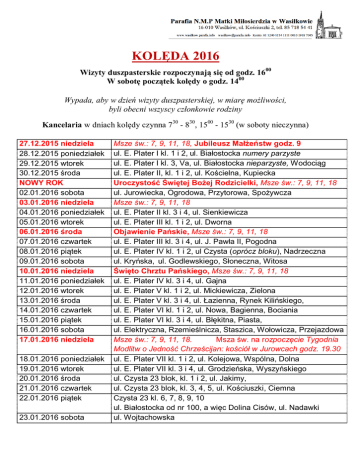 KOLĘDA 2016 Wizyty duszpasterskie rozpoczynają się od godz. 1600 W sobotę początek kolędy o godz. 1400 Wypada, aby w dzień wizyty duszpasterskiej, w miarę możliwości, byli obecni wszyscy członkowie rodziny Kancelaria w dniach kolędy czynna 730 - 830, 1500 - 1530 (w soboty nieczynna) 27.12.2015 niedziela 28.12.2015 poniedziałek 29.12.2015 wtorek 30.12.2015 środa NOWY ROK 02.01.2016 sobota 03.01.2016 niedziela 04.01.2016 poniedziałek 05.01.2016 wtorek 06.01.2016 środa 07.01.2016 czwartek 08.01.2016 piątek 09.01.2016 sobota 10.01.2016 niedziela 11.01.2016 poniedziałek 12.01.2016 wtorek 13.01.2016 środa 14.01.2016 czwartek 15.01.2016 piątek 16.01.2016 sobota 17.01.2016 niedziela 18.01.2016 poniedziałek 19.01.2016 wtorek 20.01.2016 środa 21.01.2016 czwartek 22.01.2016 piątek 23.01.2016 sobota Msze św.: 7, 9, 11, 18, Jubileusz Małżeństw godz. 9 ul. E. Plater I kl. 1 i 2, ul. Białostocka numery parzyste ul. E. Plater I kl. 3, Va, ul. Białostocka nieparzyste, Wodociąg ul. E. Plater II, kl. 1 i 2, ul. Kościelna, Kupiecka Uroczystość Świętej Bożej Rodzicielki, Msze św.: 7, 9, 11, 18 ul. Jurowiecka, Ogrodowa, Przytorowa, Spożywcza Msze św.: 7, 9, 11, 18 ul. E. Plater II kl. 3 i 4, ul. Sienkiewicza ul. E. Plater III kl. 1 i 2, ul. Dworna Objawienie Pańskie, Msze św.: 7, 9, 11, 18 ul. E. Plater III kl. 3 i 4, ul. J. Pawła II, Pogodna ul. E. Plater IV kl. 1 i 2, ul Czysta (oprócz bloku), Nadrzeczna ul. Kryńska, ul. Godlewskiego, Słoneczna, Witosa Święto Chrztu Pańskiego, Msze św.: 7, 9, 11, 18 ul. E. Plater IV kl. 3 i 4, ul. Gajna ul. E. Plater V kl. 1 i 2, ul. Mickiewicza, Zielona ul. E. Plater V kl. 3 i 4, ul. Łazienna, Rynek Kilińskiego, ul. E. Plater VI kl. 1 i 2, ul. Nowa, Bagienna, Bociania ul. E. Plater VI kl. 3 i 4, ul. Błękitna, Piasta, ul. Elektryczna, Rzemieślnicza, Staszica, Wołowicza, Przejazdowa Msze św.: 7, 9, 11, 18. Msza św. na rozpoczęcie Tygodnia Modlitw o Jedność Chrześcijan: kościół w Jurowcach godz. 19.30 ul. E. Plater VII kl. 1 i 2, ul. Kolejowa, Wspólna, Dolna ul. E. Plater VII kl. 3 i 4, ul. Grodzieńska, Wyszyńskiego ul. Czysta 23 blok, kl. 1 i 2, ul. Jakimy, ul. Czysta 23 blok, kl. 3, 4, 5, ul. Kościuszki, Ciemna Czysta 23 kl. 6, 7, 8, 9, 10 ul. Białostocka od nr 100, a więc Dolina Cisów, ul. Nadawki ul. Wojtachowska Niech będzie pochwalony Jezus Chrystus Drodzy Parafianie! Święta Bożego Narodzenia przypominają, że Jezus Chrystus, jedyny Zbawiciel ludzi, żyje pośród nas. Jego przyjście jest najwyższym aktem miłosierdzia Bożego, bo dzięki temu stało się możliwe odkupienie człowieka. Rozpoczął się w Kościele Rok Miłosierdzia. Został ogłoszony przez Ojca Świętego Franciszka jako nadzwyczajny jubileusz. Zatem to coś wyjątkowego, kiedy nie tylko mamy w sposób szczególny doświadczyć miłości Boga, ale także samemu stać się bardziej człowiekiem z wyobraźnią miłosierdzia. Otwarto Drzwi Święte. To symbol szczególnych łaski, których możemy doświadczyć tego roku. Trzeba się więc udać z pielgrzymką, aby przejść przez takie drzwi święte, bo wiąże się to z odpustem Roku Miłosierdzia. Najbliżej mamy do Świętej Wody. Potrzeba też aby otworzyły się bardziej drzwi naszego serca: bardziej jeszcze na Boga i drugiego człowieka. Może trzeba sobie uświadomić: być może jestem zamknięty na kogoś, kto jest bardzo blisko: na męża czy żonę, albo kogoś z bliskich czy dalszych. Po to jest Rok Święty aby otworzyć to co zamknięte! Codzienna Adoracja Najświętszego Sakramentu w naszej świątyni jest szczególną szansą aby otworzyć się bardziej na przyjście Zbawiciela. Jest tak blisko. Zostawił specjalny sposób swojej obecności wśród ludzi. Wykorzystajmy taką szansę aby w tym roku świętym zbliżyć się w cichej modlitwie do Niego. Może trzeba postanowienia: przynajmniej raz w tygodniu zajdę na adorację do kościoła. Jeśli ja otworzę drzwi swego serca, On nie odmówi swego Miłosierdzia. Kolęda to czas modlitwy za rodzinę i dom. To także szczególna łaska, która dokonuje się w Roku Miłosierdzia. Przyjęcie kapłana to znak, że w tych czasach, kiedy Kościół jest niesłusznie oczerniany, mamy otwarte serca na Chrystusa i Kościół, który On ustanowił. Boże Narodzenie, to czas radości z powodu dobroci Boga i człowieka. Serdeczne Bóg zapłać za wszystkie Wasze ofiary całego roku. Kończy się właśnie remont i modernizacja kaplicy pogrzebowej. Planujemy remont kaplicy św. Trójcy w kościele, gdzie od nie ma jeszcze ułożonej posadzki. Chcemy to zrobić aby uświetnić niezwykły jubileusz: 50-lecie konsekracji naszego kościoła. Niech Jezus, który narodził się w rodzinie pobłogosławi radością mieszkaniom, które odwiedzą kapłani z wizytą duszpasterską oraz wszystkim mieszkańcom naszego miasta. ks. Zdzisław Karabowicz proboszcz Wasilków, KOLĘDA 2016 ks. Krzysztof Rutkowski wikariusz ks. Konrad Węcławski wikariusz