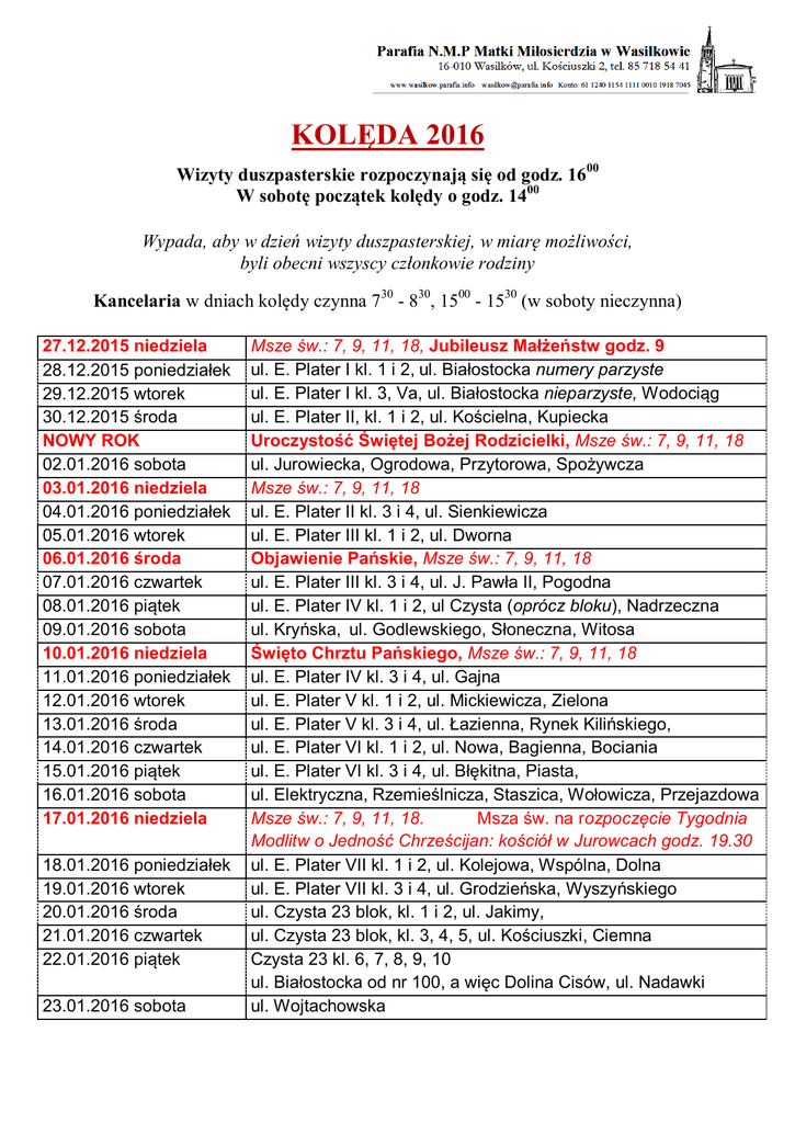 TERMINARZ KOLĘDY 2016r