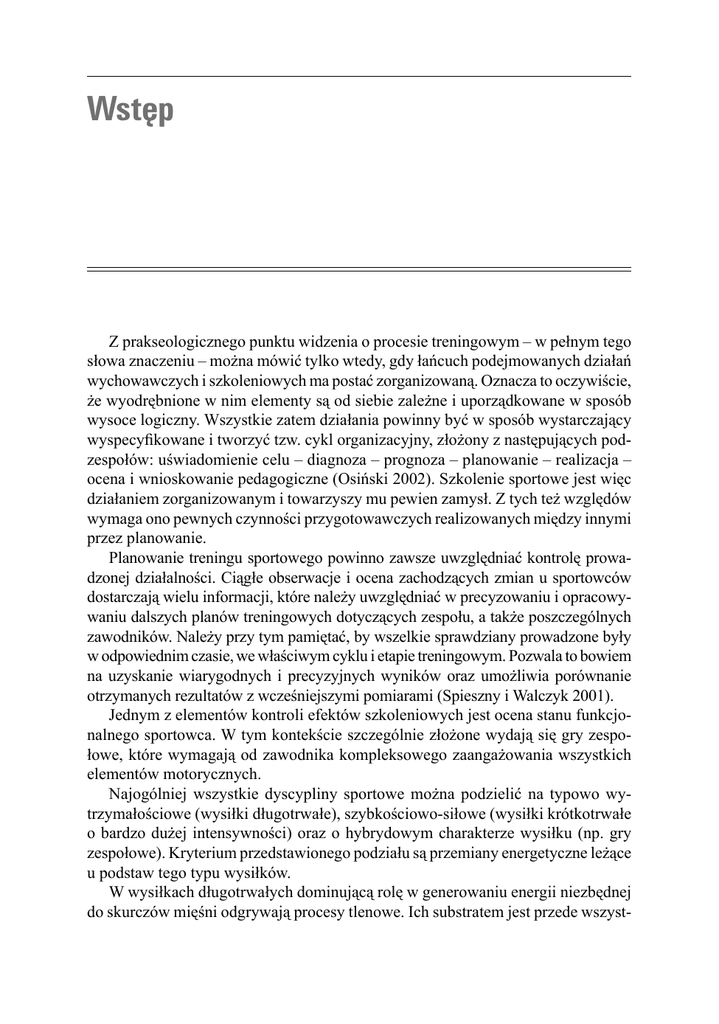 Wstęp Z prakseologicznego punktu widzenia o procesie treningowym – w pełnym tego słowa znaczeniu – można mówić tylko wtedy, gdy łańcuch podejmowanych działań wychowawczych i szkoleniowych ma postać zorganizowaną. Oznacza to oczywiście, że wyodrębnione w nim elementy są od siebie zależne i uporządkowane w sposób wysoce logiczny. Wszystkie zatem działania powinny być w sposób wystarczający wyspecyfikowane i tworzyć tzw. cykl organizacyjny, złożony z następujących podzespołów: uświadomienie celu – diagnoza – prognoza – planowanie – realizacja – ocena i wnioskowanie pedagogiczne (Osiński 2002). Szkolenie sportowe jest więc działaniem zorganizowanym i towarzyszy mu pewien zamysł. Z tych też względów wymaga ono pewnych czynności przygotowawczych realizowanych między innymi przez planowanie. Planowanie treningu sportowego powinno zawsze uwzględniać kontrolę prowadzonej działalności. Ciągłe obserwacje i ocena zachodzących zmian u sportowców dostarczają wielu informacji, które należy uwzględniać w precyzowaniu i opracowywaniu dalszych planów treningowych dotyczących zespołu, a także poszczególnych zawodników. Należy przy tym pamiętać, by wszelkie sprawdziany prowadzone były w odpowiednim czasie, we właściwym cyklu i etapie treningowym. Pozwala to bowiem na uzyskanie wiarygodnych i precyzyjnych wyników oraz umożliwia porównanie otrzymanych rezultatów z wcześniejszymi pomiarami (Spieszny i Walczyk 2001). Jednym z elementów kontroli efektów szkoleniowych jest ocena stanu funkcjonalnego sportowca. W tym kontekście szczególnie złożone wydają się gry zespołowe, które wymagają od zawodnika kompleksowego zaangażowania wszystkich elementów motorycznych. Najogólniej wszystkie dyscypliny sportowe można podzielić na typowo wytrzymałościowe (wysiłki długotrwałe), szybkościowo-siłowe (wysiłki krótkotrwałe o bardzo dużej intensywności) oraz o hybrydowym charakterze wysiłku (np. gry zespołowe). Kryterium przedstawionego podziału są przemiany energetyczne leżące u podstaw tego typu wysiłków. W wysiłkach długotrwałych dominującą rolę w generowaniu energii niezbędnej do skurczów mięśni odgrywają procesy tlenowe. Ich substratem jest przede wszyst- 6 Test zdolności szybkościowo-siłowych dla gier zespołowych... kim glukoza, która ulega przemianom w procesie glikolizy tlenowej, cyklu Krebsa i finalnie – w łańcuchu oddechowym. Końcowym produktem procesów tlenowych jest, oprócz energii w postaci ATP, woda i dwutlenek węgla. Zdolność organizmu do wykonywania wysiłków długotrwałych (wytrzymałościowych) określa się jako wydolność tlenową (aerobową). Miarą wydolności tlenowej jest maksymalny minutowy pobór tlenu (VO2max), popularnie określany jako „pułap tlenowy”. Wielkość tę definiuje się jako maksymalną ilość tlenu pochłanianą przez organizm w ciągu jednej minuty w trakcie wykonywania maksymalnego wysiłku (Żołądź 2001, Jaskólski i Jaskólska 2006). Za pomocą terminu „wydolność beztlenowa (anaerobowa)” określa się natomiast zdolność do wykonywania wysiłków krótkotrwałych o bardzo dużej intensywności. Wysiłki te najczęściej określa się jako supramaksymalne. W sporcie są to wszelkiego rodzaju starty, sprinty, skoki, rzuty itd. Podłoże energetyczne wysiłków tego typu jest beztlenowe – procesy te umożliwiają rozwijanie bardzo dużej mocy, jednak na bardzo krótki okres. Przemiany energetyczne anaerobowe można podzielić na alaktyczne i laktyczne. W procesach alaktycznych (niekwasomlekowych) dochodzi do uwalniania energii z ATP, a następnie do – odbudowy ATP z fosfokreatyny. Źródło to bardzo często określa się jako fosfagenowe. Jego pojemność jest niewielka i wystarcza zaledwie na kilka sekund wysiłku o supramaksymalnej intensywności. Rozpad fosfagenu dostarcza jednak dużej ilości energii. W kolejnych sekundach dominują przemiany laktyczne (glikoliza beztlenowa), których produktem jest mleczan, wywołujący zakwaszenie mięśni. Proces ten pozwala przedłużyć wysiłek do kilkudziesięciu sekund, jednakże moc rozwijana jest niższa niż w przypadku potencjału fosfagenowego. W trakcie tych przemian powstają duże ilości kwasu mlekowego. Wywołują one kwasicę metaboliczną, która uważana jest za jedną z przyczyn zmęczenia (Kubica 1999, Żołądź 2001, Jaskólski i Jaskólska 2006). Wysiłki supramaksymalne trwające kilka sekund (np. bieg na 100 m) oparte są na przemianach anaerobowych alaktycznych (fosfagenowych), podczas gdy wysiłki o dłuższym czasie trwania (do około 40–50 sekund) opierają się głównie na potencjale beztlenowym laktycznym (glikolitycznym). Niemal każda dyscyplina sportu wymaga od zawodnika kompleksowego zaangażowania wszystkich wymienionych wyżej źródeł energii. Wysoka wydolność fizyczna odgrywa szczególną rolę u zawodników uprawiających gry zespołowe. Podczas gry istotne znaczenie ma bowiem sprawne funkcjonowanie organizmu zawodnika często w warunkach długotrwałego wysiłku o bardzo zmiennym charakterze (częste przyspieszenia, starty, skoki, mocowanie itp.) i z zastosowaniem specyficznej techniki ruchu (Ignatiewa 1981, Delamarche i wsp. 1987, Ryguła 1995, Bangsbo i wsp. 2007, Deutsch i wsp. 2007). Poszukiwanie czynników determinujących sukces sportowy – to jedno z ważniejszych zadań teorii sportu. Im bardziej złożona konkurencja lub dyscyplina, tym trudniej czynniki te wyodrębnić. Dowiedziono, że w wielu dyscyplinach sportu (takich jak np. gry sportowe czy sporty walki) odpowiednio wysoki poziom wydolności Wstęp 7 anaerobowej warunkuje efektywność działań zawodników w trakcie rywalizacji sportowej (Zeman i wsp. 1988, Rannou i wsp. 2001, Gabryś 2005, Lech i wsp. 2007, Spieszny i wsp. 2008 i inni). Jak wynika z przeglądu literatury dotyczącej teorii treningu sportowego, podstawową metodą w kształtowaniu oraz utrzymywani