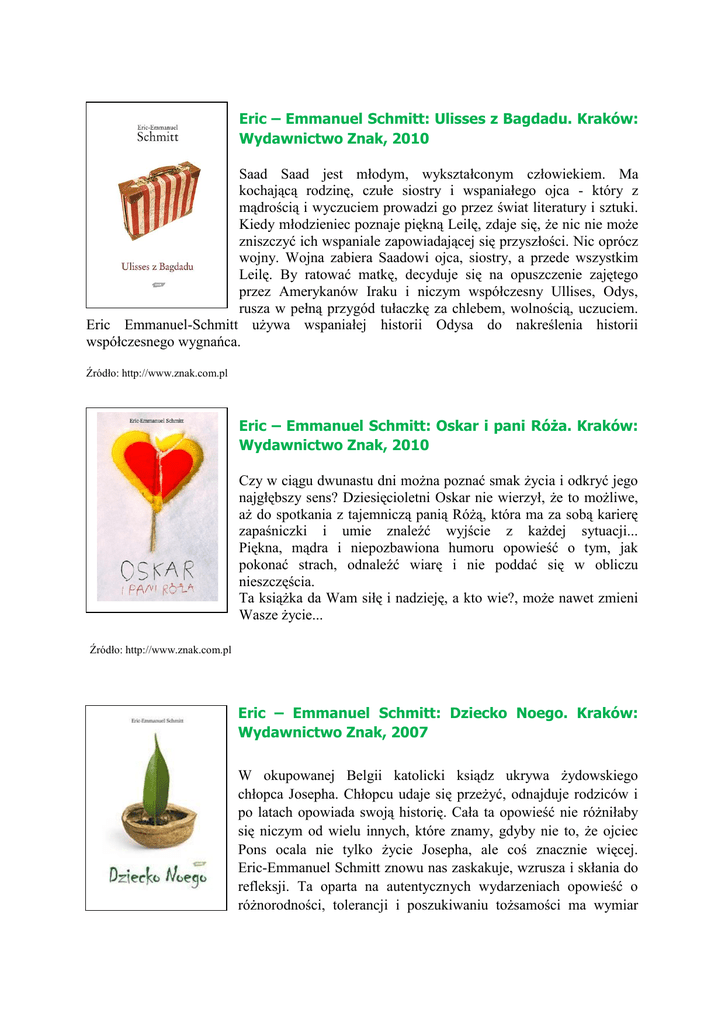 Eric – Emmanuel Schmitt: Ulisses z Bagdadu. Kraków: Wydawnictwo Znak, 2010 Saad Saad jest młodym, wykształconym człowiekiem. Ma kochającą rodzinę, czułe siostry i wspaniałego ojca - który z mądrością i wyczuciem prowadzi go przez świat literatury i sztuki. Kiedy młodzieniec poznaje piękną Leilę, zdaje się, że nic nie może zniszczyć ich wspaniale zapowiadającej się przyszłości. Nic oprócz wojny. Wojna zabiera Saadowi ojca, siostry, a przede wszystkim Leilę. By ratować matkę, decyduje się na opuszczenie zajętego przez Amerykanów Iraku i niczym współczesny Ullises, Odys, rusza w pełną przygód tułaczkę za chlebem, wolnością, uczuciem. Eric Emmanuel-Schmitt używa wspaniałej historii Odysa do nakreślenia historii współczesnego wygnańca. Źródło: http://www.znak.com.pl Eric – Emmanuel Schmitt: Oskar i pani Róża. Kraków: Wydawnictwo Znak, 2010 Czy w ciągu dwunastu dni można poznać smak życia i odkryć jego najgłębszy sens? Dziesięcioletni Oskar nie wierzył, że to możliwe, aż do spotkania z tajemniczą panią Różą, która ma za sobą karierę zapaśniczki i umie znaleźć wyjście z każdej sytuacji... Piękna, mądra i niepozbawiona humoru opowieść o tym, jak pokonać strach, odnaleźć wiarę i nie poddać się w obliczu nieszczęścia. Ta książka da Wam siłę i nadzieję, a kto wie?, może nawet zmieni Wasze życie... Źródło: http://www.znak.com.pl Eric – Emmanuel Schmitt: Dziecko Noego. Kraków: Wydawnictwo Znak, 2007 W okupowanej Belgii katolicki ksiądz ukrywa żydowskiego chłopca Josepha. Chłopcu udaje się przeżyć, odnajduje rodziców i po latach opowiada swoją historię. Cała ta opowieść nie różniłaby się niczym od wielu innych, które znamy, gdyby nie to, że ojciec Pons ocala nie tylko życie Josepha, ale coś znacznie więcej. Eric-Emmanuel Schmitt znowu nas zaskakuje, wzrusza i skłania do refleksji. Ta oparta na autentycznych wydarzeniach opowieść o różnorodności, tolerancji i poszukiwaniu tożsamości ma wymiar uniwersalny. Łączy humor z powagą i udowadnia, że o dobru można mówić w sposób prosty, piękny, a zarazem pozbawiony sentymentalizmu. Źródło: http://www.znak.com.pl Eric – Emmanuel Schmitt: Moje Ewangelie. Kraków: Wydawnictwo Znak, 2008 Eric-Emmanuel Schmitt powraca do wątków poruszonych w Ewangelii według Piłata. Przedstawia swoją wizję dramatu dwóch bohaterów: Chrystusa i Poncjusza Piłata. Pierwszy na kilka dni przed śmiercią przeżywa moment zwątpienia. Drugi szuka racjonalnych wyjaśnień cudu. Obaj stają wobec tajemnicy. W swojej nowej książce Schmitt zadaje pytanie o sens i celowość ludzkiego życia. Czy są nam one dane z góry, czy też powinniśmy je odnaleźć sami? Źródło: http://www.znak.com.pl Eric – Emmanuel Schmitt: Kiedy byłem dziełem sztuki. Kraków: Wydawnictwo Znak, 2008 Zdesperowany bohater na skraju samobójstwa podpisuje iście faustowski pakt ze spotkanym przypadkowo artystą. Odda się w jego ręce, w zamian za co odzyska sens życia. Jako żywa rzeźba staje się sławny i podziwiany. Traci tylko jedno - wolność. Gdzie kończy się sztuka, a zaczyna manipulacja? Co stanowi o naszej wyjątkowości? Jak zwykle u Schmitta, ważne pytania podane lekko i z przymrużeniem oka. Źródło: http://www.znak.com.pl Eric – Emmanuel Schmitt: Odett i inne historie miłosne. Kraków: Wydawnictwo Znak, 2009 Osiem historii miłosnych, osiem narracji, osiem kobiet - od sprzedawczyni po milionerkę, od zawiedzionej trzydziestolatki po tajemniczą bosonogą księżniczkę. Po drodze kochankowie i stęsknione matki... Wanda, Helena, Isabelle, Donatella, Odette - oto galeria nowych postaci odmalowanych przez Erica-Emmanuela Schmitta. Baśniowa opowieść o miłości, a zarazem przypowieść i filozoficzna komedia, w której Schmitt z czułością kreśli portrety kobiet poszukujących szczęścia. Źródło: http://www.znak.com.pl Eric – Emmanuel Schmitt: Marzycielka z Ostendy. Kraków: Wydawnictwo Znak, 2009 naszych Kim jest marzycielka z Ostendy? Starą, samotną kobietą czy osobą, która odrzuciła lęk i zagrała z losem o najwyższą stawkę? Położywszy na szali własne szczęście, zaryzykowała i zrealizowała swe największe pragnienie. Nagrodą była miłość. Pięć opowiadań. Pięć marzeń. Pięć historii. Potęga pamięci, miłości, a może dotyku? Uczucie silniejsze niż upływający czas. Piękno odkryte w słowach, małżeństwo scalone przez śmierć, książka obarczona fatum, a wreszcie pamięć, jedyny strażnik wspomnień. Literatura, która przywraca wiarę w marzenia. Źródło: http://www.znak.com.pl