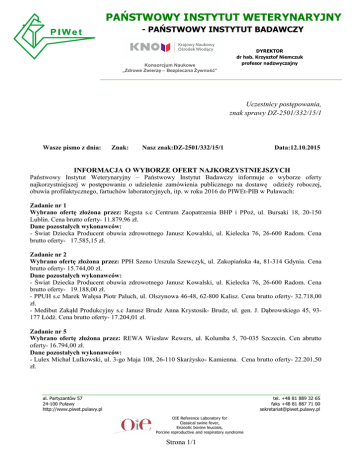 PAŃSTWOWY INSTYTUT WETERYNARYJNY - PAŃSTWOWY INSTYTUT BADAWCZY Konsorcjum Naukowe „Zdrowe Zwierzę – Bezpieczna Żywność” DYREKTOR dr hab. Krzysztof Niemczuk profesor nadzwyczajny Uczestnicy postępowania, znak sprawy DZ-2501/332/15/1 Wasze pismo z dnia: Znak: Nasz znak:DZ-2501/332/15/1 Data:12.10.2015 INFORMACJA O WYBORZE OFERT NAJKORZYSTNIEJSZYCH Państwowy Instytut Weterynaryjny – Państwowy Instytut Badawczy informuje o wyborze oferty najkorzystniejszej w postępowaniu o udzielenie zamówienia publicznego na dostawę odzieży roboczej, obuwia profilaktycznego, fartuchów laboratoryjnych, itp. w roku 2016 do PIWEt-PIB w Puławach: Zadanie nr 1 Wybrano ofertę złożona przez: Regsta s.c Centrum Zaopatrzenia BHP i PPoż, ul. Bursaki 18, 20-150 Lublin. Cena brutto oferty- 11.879,96 zł. Dane pozostałych wykonawców: - Świat Dziecka Producent obuwia zdrowotnego Janusz Kowalski, ul. Kielecka 76, 26-600 Radom. Cena brutto oferty- 17.585,15 zł. Zadanie nr 2 Wybrano ofertę złożona przez: PPH Szeno Urszula Szewczyk, ul. Zakopiańska 4a, 81-314 Gdynia. Cena brutto oferty- 15.744,00 zł. Dane pozostałych wykonawców: - Świat Dziecka Producent obuwia zdrowotnego Janusz Kowalski, ul. Kielecka 76, 26-600 Radom. Cena brutto oferty- 19.188,00 zł. - PPUH s.c Marek Wałęsa Piotr Paluch, ul. Olszynowa 46-48, 62-800 Kalisz. Cena brutto oferty- 32.718,00 zł. - Medibut Zakąłd Produkcyjny s.c Janusz Brudz Anna Krystosik- Brudz, ul. gen. J. Dąbrowskiego 45, 93177 Łódź. Cena brutto oferty- 17.204,01 zł. Zadanie nr 5 Wybrano ofertę złożona przez: REWA Wiesław Rewers, ul. Kolumba 5, 70-035 Szczecin. Cen abrutto oferty- 16.794,00 zł. Dane pozostałych wykonawców: - Lulex Michał Lulkowski, ul. 3-go Maja 108, 26-110 Skarżysko- Kamienna. Cena brutto oferty- 22.201,50 zł. al. Partyzantów 57 24-100 Puławy http://www.piwet.pulawy.pl tel. +48 81 889 32 65 faks +48 81 887 71 00 [email protected] OIE Reference Laboratory for Classical swine fever, Enzootic bovine leucosis, Porcine reproductive and respiratory syndrome Strona 1/1