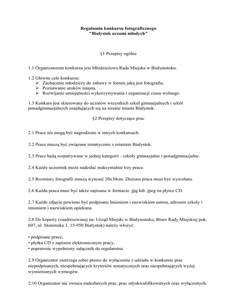 Regulamin konkursu fotograficznego "Białystok oczami młodych" §1 Przepisy ogólne 1.1 Organizatorem konkursu jest Młodzieżowa Rada Miejska w Białymstoku. 1.2 Główne cele konkursu: Zachęcenie młodzieży do zabawy w formie jaką jest fotografia, Poznawanie uroków miasta, Rozwijanie umiejętności wykorzystywania i organizacji czasu wolnego. 1.3 Konkurs jest skierowany do uczniów wszystkich szkół gimnazjalnych i szkół ponadgimnazjalnych znajdujących się na terenie miasta Białystok. §2 Przepisy dotyczące prac 2.1 Prace nie mogą być nagrodzone w innych konkursach. 2.2 Prace muszą być związane tematycznie z miastem Białystok. 2.3 Prace będą rozpatrywane w jednej kategorii - szkoły gimnazjalne i ponadgimnazjalne. 2.4 Każdy uczestnik może nadesłać maksymalnie trzy prace. 2.5 Rozmiary fotografii muszą wynosić 20x30cm. Złożona praca musi być wywołana. 2.6 Każda praca musi być także zapisana w formacie .jpg lub .jpeg na płytce CD. 2.7 Każde zdjęcie powinno być podpisane Imieniem i nazwiskiem autora, adresem szkoły i imieniem i nazwiskiem opiekuna. 2.8 Do koperty (zaadresowanej na: Urząd Miejski w Białymstoku, Biuro Rady Miejskiej pok. 607, ul. Słonimska 1, 15-950 Białystok) należy włożyć: • podpisane prace, • płytka CD z zapisem elektronicznym pracy, • poprawnie wypełniony załącznik do regulaminu 2.9 Organizator zastrzega sobie prawo do wyłączenia z udziału w konkursie prac niepodpisanych, niespełniających kryteriów tematycznych oraz niespełniających wyżej wymienionych wymogów. 2.10 Organizator nie zwraca nadesłanych prac, prac zdyskwalifikowanych oraz wyłączonych. §3 Terminarz 3.1 Termin nadsyłania prac mija 18 maja 2012 roku. 3.2 Fotografie nadesłane po terminie nie będą brane pod uwagę. 3.3 Prace oceniać będzie Jury powołane przez organizatorów. 3.4 Zwycięzcy konkursu zostaną powiadomieni przez organizatorów telefonicznie. 3.5 Wręczenie nagród odbędzie się 25 maja 2012 r, o godzinie i miejscu poinformujemy telefonicznie. §4 Nagrody 4.1 Przewidywane nagrody to: Warsztaty fotograficzne dla zwycięzcy Upominki rzeczowe dla laureatów 4.2 Nagrody nie podlegają wymianie na równowartość pieniężną. 4.3 Nagrody mogą ulec zmianie. § 5 Wykorzystanie prac 5.1 Organizator uzyskuje prawo do zamieszczenia podpisanych fotografii na stronach Młodzieżowej Rady Miejskiej w Białymstoku. 5.2 Organizator uzyskuje prawo do prezentowania zdjęć na okolicznościowych wystawach, materiałach promujących konkurs oraz w artykułach pokonkursowych. 5.3. Nadesłanie prac na konkurs jest równoznaczne z oświadczeniem posiadania praw autorskich do zdjęć i akceptację niniejszego regulaminu oraz zgody na publikacje materiałów multimedialnych z przebiegu konkursu (w tym wizerunku fotografowanych osób). §6 Organizatorzy 6.1 Organizatorem konkursu jest Młodzieżowa Rada Miejska w Białymstoku 6.2 W razie pytań prosimy o kontakt e-mailem: [email protected] Załącznik do Regulaminu Konkursu fotograficznego „Białystok oczami młodych” Formularz Konkursowy (wzór) Konkurs: „Białystok oczami młodych” 1.UCZESTNIK: Imię i nazwisko: …………………………………………………………………………………………………………… ………………………….. Data urodzenia: …………………………………………………………………………………………………………… ….……………………….. 2.PRACA : Tytuł pracy: …………………………………………………………………………………………………………… ……………..………………….. 3.OPIEKUN PRAWNY UCZESTNIKA: Imię i nazwisko: …………………………………………………………………………………………………….…… Adres zamieszkania: ………………………………………………………………………………………………………… Adres do korespondencji* …………………………………………………………………………………………………………… …………………………………………………….. Telefon kontaktowy oraz adres e-mail** …………………………………………………………………………………………………………… …………………………………………………….. 4. SZKOŁA: Nazwa i adres: …………………………………………………………………………………………………………… ……………………………………………………. OŚWIADCZENIA OPIEKUNA PRAWNEGO UCZESTNIKA: 1. Oświadczam, że załączona praca została wykonana przez zgłaszanego przeze mnie uczestnika samodzielnie i jest on jej jedynym autorem. 2. Oświadczam, że zapoznałem/-am się z Regulaminem konkursu i wyrażam zgodę na udział w konkursie zgodnie z określonymi w nim warunkami. 4. Wyrażam zgodę na przetwarzanie przez Młodzieżową Radę Miejską w Białymstoku moich danych osobowych oraz danych osobowych zgłaszanego przeze mnie uczestnika, zgodnie z zasadami określonymi w ustawie z dnia 29 sierpnia 1997 r. o ochronie danych osobowych (Dz. U. z 2002 r. Nr 101, poz. 926 z późn. zm.). 5. Wyrażam zgodę na nieodpłatne przeniesienie majątkowych praw autorskich do nadesłanej pracy, w zakresie określonym w Regulaminie konkursu. ______________________________ Data i podpis opiekuna prawnego uczestnika …. * oraz ** - można wpisać adres szkoły i numer kontaktowy do szkoły/nauczyciela jeżeli z jednej placówki jest wysyłane kilka prac, a szkoła/nauczyciel wyraża na to zgodę.