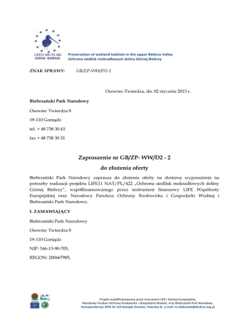 Preservation of wetland habitats in the upper Biebrza Valley Ochrona siedlisk mokradłowych doliny Górnej Biebrzy ZNAK SPRAWY: GB/ZP-WW/D2-2 Osowiec-Twierdza, dn. 02 stycznia 2013 r. Biebrzański Park Narodowy Osowiec Twierdza 8 19-110 Goniądz tel. + 48 738 30 43 fax + 48 738 30 21 Zaproszenie nr GB/ZP- WW/D2 - 2 do złożenia oferty Biebrzański Park Narodowy zaprasza do złożenia oferty na dostawę wyposażenia na potrzeby realizacji projektu LIFE11 NAT/PL/422 „Ochrona siedlisk mokradłowych doliny Górnej Biebrzy”, współfinansowanego przez instrument finansowy LIFE Wspólnoty Europejskiej oraz Narodowy Fundusz Ochrony Środowiska i Gospodarki Wodnej i Biebrzański Park Narodowy. I. ZAMAWIAJĄCY Biebrzański Park Narodowy Osowiec Twierdza 8 19-110 Goniądz NIP: 546-13-90-705, REGON: 200667985, Projekt współfinansowany przez Instrument LIFE+ Komisji Europejskiej, Narodowy Fundusz Ochrony Środowiska i Gospodarki Wodnej oraz Biebrzański Park Narodowy. Korespondencja: BPN 19-110 Goniądz Osowiec Twierdza 8; e-mail: [email protected] II. OPIS PRZEDMIOTU ZAMÓWIENIA Zamówienie zostało podzielone na części. Szczegółowy opis poszczególnych części przedmiotu zamówienia (zakres rzeczowy, specyfikacja techniczna) poniżej: Część 1. Lornetka obserwacyjna, w szczególności przeznaczona do monitoringu przyrodniczego w trudnych warunkach terenowych i atmosferycznych – kpl. 2 Lornetka musi charakteryzować się doskonałą ostrością w całym polu widzenia, płaskim obrazem, bez zniekształceń. Soczewki dachopryzmatyczne, powinny zawierać fluorek i być zbudowane w systemie HD zdecydowanie minimalizującym aberracje chromatyczne, powinny zapewnić doskonałą rozdzielczość i kontrast obrazu oraz jego ostry kontur i oddanie kolorów najbardziej zbliżonych do rzeczywistych/naturalnych. Lornetka musi posiadać dużą odległość źrenicy wyjściowej by użytkownicy noszący okulary dysponowały całym, szerokokątnym polem widzenia i ostrością na krawędziach obrazu. Zdejmowane muszle oczne powinny się indywidualnie ustawiać w trzech położeniach. Oprócz ustawienia maksymalnego (całkowicie wykręcone) i ustawienia dla osób noszących okulary (całkowicie wkręcone), muszle oczne posiadają jeszcze jedną pozycję pośrednią z możliwością blokady. Lornetka powinna się charakteryzować również doskonałym kontrastem w trakcie używania jej o świcie i zmierzchu. Powłoka na zewnętrznej powierzchni soczewki powinna posiadać właściwości antyadhezyjne, ułatwiające usuwanie zanieczyszczeń, takich jak plamy z wody, środki ochronne przeciw owadom i żywicą z drzew itp. Lornetka powinna posiadać system korekcji dioptrii z blokadą, najlepiej wbudowany w pokrętło ostrości. Lornetka powinna posiadać magnezową obudowę oraz być hermetyczna, odporna na kurz i wodoszczelna. Specyfikacja techniczna: - optyka o wysokiej dyspersji (zawierające fluorek soczewki HD) - lornetka wypełniona azotem/argonem - wodoodporna do głębokości minimum 4m. - konstrukcja z pryzmatami dachowymi - średnica obiektywu: 42 - 50 mm - powiększenie: 10x - jasność względna: nie mniej niż 27.6 - pole widzenia: nie mniej niż 115/1000m Projekt współfinansowany przez Instrument LIFE+ Komisji Europejskiej, Narodowy Fundusz Ochrony Środowiska i Gospodarki Wodnej oraz Biebrzański Park Narodowy. Korespondencja: BPN 19-110 Goniądz Osowiec Twierdza 8; e-mail: [email protected] - kąt widzenia (rzeczywisty): nie mniej niż 6,5° - minimalna odległość ostrego widzenia: od 1.5m do 3,5m - korekcja dioptryczna: +/- 4 dioptrie - ciężar: nie więcej niż 1000g - nie mniej niż 10 lat gwarancji producenta - wyposażenie dodatkowe każdej lornetki: pasek na szyję, futerał, osłony okularów i obiektywów, zestaw czyszczący optykę. Gwarancja dla każdej lornetki - nie krótsza niż 10 lat, dostarczone karty gwarancyjne (lub dokumenty równoważne), ostemplowane, ważne. Część 2. Obiektywy uzupełniające posiadane aparaty fotograficzne: 1. Teleobiektyw z ogniskową 100-400mm ze stabilizacją obrazu, automatycznym nastawianiem ostrości, przesłoną f/4,5-5,6mm, filtr UV, bagnetem umożliwiającym zamontowanie i korzystanie z posiadanych aparatów fotograficznych Canon. Do teleobiektywów powinny być dołączone futerały ochronne lub inne opakowania ochronne oraz zestaw czyszczący optykę. Ilość teleobiektywów - kpl.2. Specyfikacja techniczna: - z silnikiem AF - wyposażony w stabilizator obrazu, elementy fluorytowe oraz wykonane ze szkła Super UD. - stabilizator obrazu może pracować w dwóch trybach i jest zgodny z konwerterami Extender 1.4x oraz 2x. - ogniskowa [mm]: 100-400 - kąt widzenia [stopnie] : 20-5 - przysłona [f/]: 4.5-5.6 - minimalna wartość przysłony - szeroki kąt [f/]: 4.5 - minimalna wartość przysłony - wąski kąt [f/] : 5.6 - maksymalna wartość przysłony - szeroki kąt [f/]: 32 - maksymalna wartość przysłony - wąski kąt [f/]: 36 - minimalna odległość ostrzenia AF/MF [cm]: 180 - osłona przeciwsłoneczna: ET-83C Projekt współfinansowany przez Instrument LIFE+ Komisji Europejskiej, Narodowy Fundusz Ochrony Środowiska i Gospodarki Wodnej oraz Biebrzański Park Narodowy. Korespondencja: BPN 19-110 Goniądz Osowiec Twierdza 8; e-mail: [email protected] - średnica filtra [mm]: 77 - waga [g]: nie więcej niż 1500 - pole widzenia : 20° - 5°10', 14° - 3°30', 24° - 6°10' stopnie pion, poziom, przekątna - powiększenie maksymalne: 0.20 - mocowanie (bagnet) – umożliwiające zamontowanie i korzystanie z posiadanych aparatów fotograficznych Canon. Gwarancja dla każdego teleobiektywu - nie mniej niż 12 miesięcy. Dostarczone karty gwarancyjne (lub dokumenty równoważne), ostemplowane, ważne. 2. Obiektyw szerokokątny do makrofotografii, ze stałą ogniskową 50mm, przesłoną f/2,5mm, filtrem UV, bagnetem umożliwiającym zamontowanie i korzystanie z posiadanych aparatów fotograficznych Canon. Do obiektywów powinny być 
