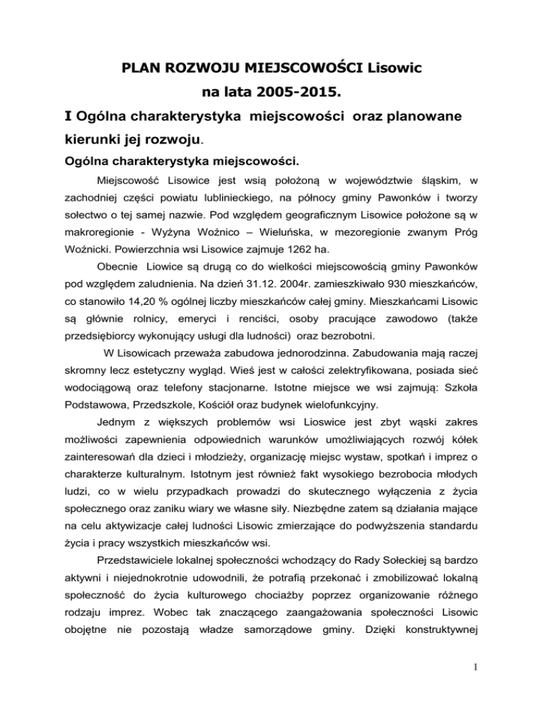 PLAN ROZWOJU MIEJSCOWOŚCI Lisowic na lata 2005-2015. I Ogólna charakterystyka miejscowości oraz planowane kierunki jej rozwoju. Ogólna charakterystyka miejscowości. Miejscowość Lisowice jest wsią położoną w województwie śląskim, w zachodniej części powiatu lublinieckiego, na północy gminy Pawonków i tworzy sołectwo o tej samej nazwie. Pod względem geograficznym Lisowice położone są w makroregionie - Wyżyna Woźnico – Wieluńska, w mezoregionie zwanym Próg Woźnicki. Powierzchnia wsi Lisowice zajmuje 1262 ha. Obecnie Liowice są drugą co do wielkości miejscowością gminy Pawonków pod względem zaludnienia. Na dzień 31.12. 2004r. zamieszkiwało 930 mieszkańców, co stanowiło 14,20 % ogólnej liczby mieszkańców całej gminy. Mieszkańcami Lisowic są głównie rolnicy, emeryci i renciści, osoby pracujące zawodowo (także przedsiębiorcy wykonujący usługi dla ludności) oraz bezrobotni. W Lisowicach przeważa zabudowa jednorodzinna. Zabudowania mają raczej skromny lecz estetyczny wygląd. Wieś jest w całości zelektryfikowana, posiada sieć wodociągową oraz telefony stacjonarne. Istotne miejsce we wsi zajmują: Szkoła Podstawowa, Przedszkole, Kościół oraz budynek wielofunkcyjny. Jednym z większych problemów wsi Lioswice jest zbyt wąski zakres możliwości zapewnienia odpowiednich warunków umożliwiających rozwój kółek zainteresowań dla dzieci i młodzieży, organizację miejsc wystaw, spotkań i imprez o charakterze kulturalnym. Istotnym jest również fakt wysokiego bezrobocia młodych ludzi, co w wielu przypadkach prowadzi do skutecznego wyłączenia z życia społecznego oraz zaniku wiary we własne siły. Niezbędne zatem są działania mające na celu aktywizacje całej ludności Lisowic zmierzające do podwyższenia standardu życia i pracy wszystkich mieszkańców wsi. Przedstawiciele lokalnej społeczności wchodzący do Rady Sołeckiej są bardzo aktywni i niejednokrotnie udowodnili, że potrafią przekonać i zmobilizować lokalną społeczność do życia kulturowego chociażby poprzez organizowanie różnego rodzaju imprez. Wobec tak znaczącego zaangażowania społeczności Lisowic obojętne nie pozostają władze samorządowe gminy. Dzięki konstruktywnej 1 współpracy udało się w ostatnich latach zrealizować szereg zadań. Ważnym wydarzeniem w życiu Lisowic było wykonanie przy współudziale i dużym zaangażowaniu mieszkańców przedsięwzięcia w postaci budowy przystanku PKP, kościoła parafialnego pw. Św. Jana Nepomucena, adaptacja starego budynku szkoły z przeznaczeniem na przedszkole. Wybudowano również budynek wielofunkcyjny oraz częściowo go zagospodarowano dla potrzeb organizacji działających we wsi. Budynek ten po adaptacji będzie stanowił atrakcyjne miejsce o wielofunkcyjnym działaniu. 2 Planowane Kierunki Rozwoju (2005- 2015) Wizję rozwoju wsi sformułowano następująco: MOŻESZ LISKA UPOLOWAĆ I SIĘ ZREGENEROWAĆ. I. Plan rozwoju 1. Cele Co trzeba osiągnąć by urzeczywistnić wizję wsi ? II. Program odnowy wsi na lata 2005-2015 2. Co pomoże osiągnąć cele ? 3. Co może przeszkodzić Zasoby Czego użyjemy? Bariery Słabe strony Co wyeliminujemy? Zagrożenia Czego unikniemy? ATUTY Silne strony i szanse Co wykorzystamy? Projekty Co wykonamy? A. TOŻSAMOŚĆ WSI I WARTOŚCI ŻYCIA WIEJSKIEGO 1. Kultywowanie tradycji - budynek świetlicy wiejskiej, - teren wokół budynku, -eksponaty -zaangażowanie społeczeństwa, -brak środków finansowych, - zmniejszenie zjawiska emigracji młodzieży 1. Stworzenie Izby Pamięci 2. Trasa rowerowa szlakiem naszej tożsamości „Lisi szlak” - w dobrym stanie drogi - piękny krajobraz - dobre warunki terenowe - brak środków finansowych, - mała skala rozpropagowania 1. I etap - przystanek od strony ulicy Andrzejkowej (tablica inf. – temat lis jako gatunek) 2. II etap – przystanek koło kapliczki (tablica informacyjna – historia miejscowości) 3. Przystanek koło budynku wielofunkcyjnego. - 3 3. Stworzenie nowej tradycji - podania historyczne, - świetlica, - teren wokół budynku. - aktywność mieszkańców 1. Organizowanie cyklicznej imprezy „Dzień Lisa”, 2. Promocja miejscowości. -prężnie działające -niedostatki kapitału organizacje własnego - pozyskiwanie funduszy, - dobre stosunki z Urzędem Gminy. 1. Świetlica wiejska wraz z zapleczem socjalnym, 2. Pracownia komputerowa, 3. Biblioteka, 4. Sala bilardowa. 2. Zagospodarowanie - nieużytki – teren terenu wokół budynku. wokół budynku wielofunkcyjnego, prężnie działające organizacje - pozyskiwanie funduszy, - dobre stosunki z Urzędem Gminy - brak środków finansowych. 1. Kort tenisowy, 2. Boisko do piłki plażowej, 3. Górka do zjazdu na sankach, nartach dla dzieci, 4. Plac zabaw dla dzieci 5. Parking. 6. Scena – estrada. 3. Zagospodarowanie centrum wsi - zaangażowanie OSP - brak środków. 1. Rekonstrukcja wieży strażackiej, 2. Rekonstrukcja wozu strażackiego. 3. Odrestaurowanie zabytkowej kapliczki B. STANDARD ŻYCIA 1. Adaptacja i modernizacja budynku wielofunkcyjnego. -obiekt częściowo w stanie surowym. - projekt wieży strażackiej, - stary wóz strażacki, - zabytkowa kapliczka. 4 C. JAKOŚĆ ŻYCIA Integracja środowiska wsi oraz zaspokojenie potrzeb społeczno kulturalnych mieszkańców wsi. - budynek wielofunkcyjny - teren - boisko, - siłownia - strażnica - aktywni mieszkańcy, - umiejętność samorealizowania się. - brak zagospodarowanego terenu wokół budynku.. 1. Organizowanie spotkań międzypokoleniowych. 2. Dzień Seniora, 3. Dożynki. 4. Piknik rodzinny. - sala budynku wielofunkcyjnego. - umiejętności organizacyjne, - aktywni zdecydowani mieszkańcy - brak statutu, - brak środków. 1. Organizowanie spotkań chętnych członków, 2. Opracowanie statutu stowarzyszenia. 3. Rejestracja Stowarzyszenia. C. Byt 1. Powołanie stowarzyszenia. 5 II Inwentaryzacja zasobów służących ujęciu stanu rzeczywistego . Zasoby przyrodnicze Lisow