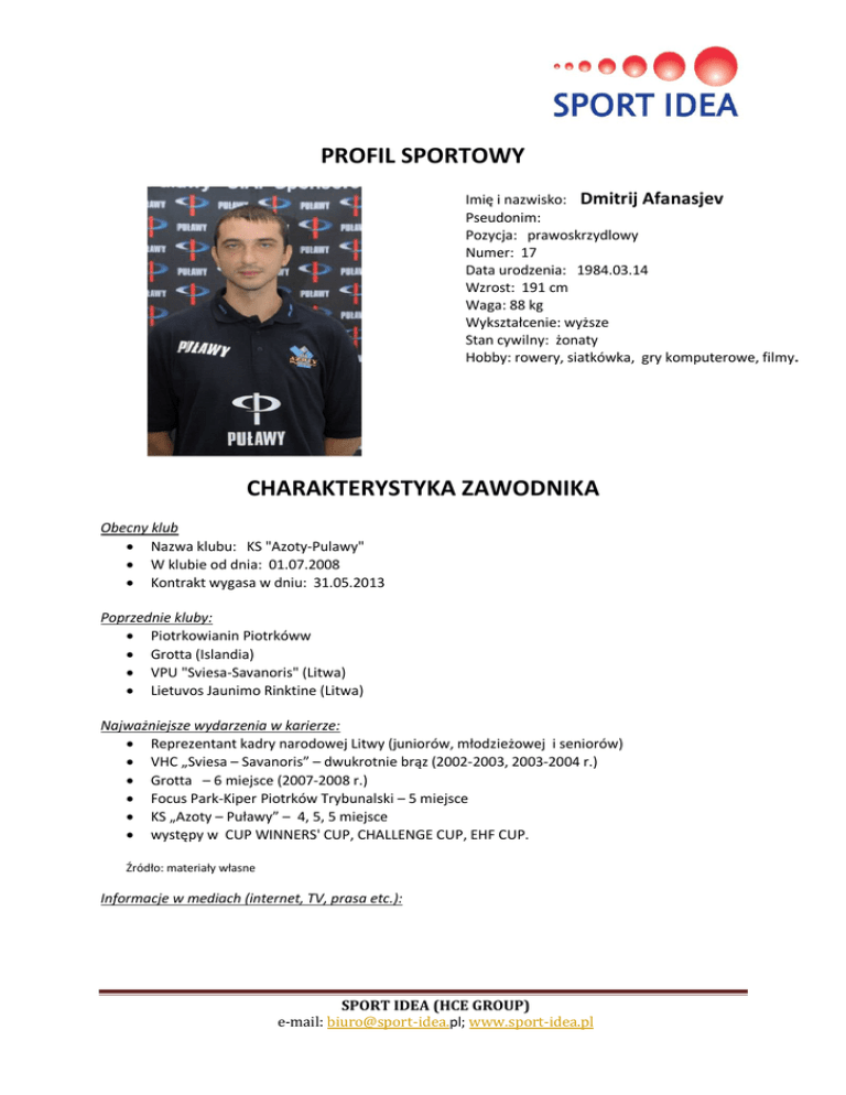 PROFIL SPORTOWY Imię i nazwisko: Dmitrij Afanasjev Pseudonim: Pozycja: prawoskrzydlowy Numer: 17 Data urodzenia: 1984.03.14 Wzrost: 191 cm Waga: 88 kg Wykształcenie: wyższe Stan cywilny: żonaty Hobby: rowery, siatkówka, gry komputerowe, filmy. CHARAKTERYSTYKA ZAWODNIKA Obecny klub Nazwa klubu: KS "Azoty-Pulawy" W klubie od dnia: 01.07.2008 Kontrakt wygasa w dniu: 31.05.2013 Poprzednie kluby: Piotrkowianin Piotrkóww Grotta (Islandia) VPU "Sviesa-Savanoris" (Litwa) Lietuvos Jaunimo Rinktine (Litwa) Najważniejsze wydarzenia w karierze: Reprezentant kadry narodowej Litwy (juniorów, młodzieżowej i seniorów) VHC „Sviesa – Savanoris” – dwukrotnie brąz (2002-2003, 2003-2004 r.) Grotta – 6 miejsce (2007-2008 r.) Focus Park-Kiper Piotrków Trybunalski – 5 miejsce KS „Azoty – Puławy” – 4, 5, 5 miejsce występy w CUP WINNERS' CUP, CHALLENGE CUP, EHF CUP. Źródło: materiały własne Informacje w mediach (internet, TV, prasa etc.): SPORT IDEA (HCE GROUP) e-mail: [email protected]; www.sport-idea.pl