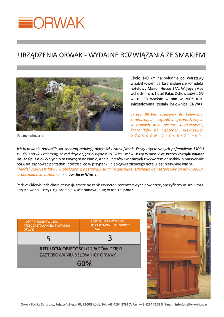URZĄDZENIA ORWAK - WYDAJNE ROZWIĄZANIA ZE SMAKIEM Około 140 km na południe od Warszawy w zabytkowym parku znajduje się kompleks hotelowy Manor House SPA. W jego skład wchodzi m.in. hotel Pałac Odrowążów z XV wieku. To właśnie w nim w 2008 roku zainstalowana została belownica ORWAK. „Prasy ORWAK używamy do belowania zmieszanych odpadów gromadzonych w workach, m.in. puszek aluminiowych, kartoników po napojach, niewielkich o d p a d ó w d r e w n i a n y c h . Fot. manorhouse.pl Ich belowanie pozwoliło na znaczną redukcję objętości i zmniejszenie liczby użytkowanych pojemników 1100 l z 5 do 3 sztuk. Oceniamy, że redukcja objętości wynosi 50-70%” - mówi Jerzy Wrona V-ce Prezes Zarządu Manor House Sp. z o.o. Wpłynęło to znacząco na zmniejszenie kosztów związanych z wywozem odpadów, a prasowanie pozwala zachować porządek i czystość, co w przypadku pięciogwiazdkowego hotelu jest niezwykle ważne. “Model 3100 jest łatwy w obsłudze, a dostawa, usługi instalacyjne, szkoleniowe i serwisowe są na wysokim, profesjonalnym poziomie” - mówi Jerzy Wrona. Park w Chlewiskach charakteryzują czyste od zanieczyszczeń przemysłowych powietrze, specyficzny mikroklimat i czysta woda. Recykling idealnie wkomponowuje się w ten krajobraz. ILOŚĆ POJEMNIKÓW 1100L PRZED ZASTOWANIEM BELOWNICY ORWAK ILOŚĆ POJEMNIKÓW 1100L PO ZASTOWANIU BELOWNICY ORWAK 3 3 5 REDUKCJA OBJĘTOŚCI ODPADÓW DZIĘKI ZASTOSOWANIU BELOWNICY ORWAK 60% Orwak Polska Sp. z o.o., Felsztyńskiego 50, 93-582 Łódź, Tel: +48 4264 8791 7, Fax: +48 4264 8218 5, E-mail: [email protected]