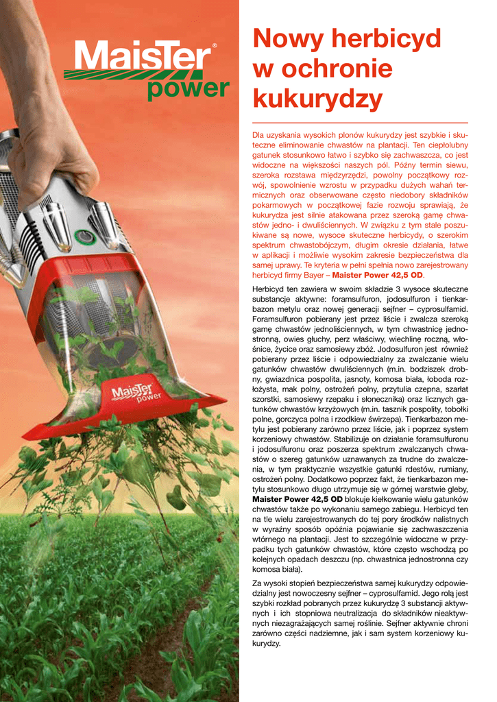Nowy herbicyd w ochronie kukurydzy Dla uzyskania wysokich plonów kukurydzy jest szybkie i skuteczne eliminowanie chwastów na plantacji. Ten ciepłolubny gatunek stosunkowo łatwo i szybko się zachwaszcza, co jest widoczne na większości naszych pól. Późny termin siewu, szeroka rozstawa międzyrzędzi, powolny początkowy rozwój, spowolnienie wzrostu w przypadku dużych wahań termicznych oraz obserwowane często niedobory składników pokarmowych w początkowej fazie rozwoju sprawiają, że kukurydza jest silnie atakowana przez szeroką gamę chwastów jedno- i dwuliściennych. W związku z tym stale poszukiwane są nowe, wysoce skuteczne herbicydy, o szerokim spektrum chwastobójczym, długim okresie działania, łatwe w aplikacji i możliwie wysokim zakresie bezpieczeństwa dla samej uprawy. Te kryteria w pełni spełnia nowo zarejestrowany herbicyd firmy Bayer – Maister Power 42,5 OD. Herbicyd ten zawiera w swoim składzie 3 wysoce skuteczne substancje aktywne: foramsulfuron, jodosulfuron i tienkarbazon metylu oraz nowej generacji sejfner – cyprosulfamid. Foramsulfuron pobierany jest przez liście i zwalcza szeroką gamę chwastów jednoliściennych, w tym chwastnicę jednostronną, owies głuchy, perz właściwy, wiechlinę roczną, włośnice, życice oraz samosiewy zbóż. Jodosulfuron jest również pobierany przez liście i odpowiedzialny za zwalczanie wielu gatunków chwastów dwuliściennych (m.in. bodziszek drobny, gwiazdnica pospolita, jasnoty, komosa biała, łoboda rozłożysta, mak polny, ostrożeń polny, przytulia czepna, szarłat szorstki, samosiewy rzepaku i słonecznika) oraz licznych gatunków chwastów krzyżowych (m.in. tasznik pospolity, tobołki polne, gorczyca polna i rzodkiew świrzepa). Tienkarbazon metylu jest pobierany zarówno przez liście, jak i poprzez system korzeniowy chwastów. Stabilizuje on działanie foramsulfuronu i jodosulfuronu oraz poszerza spektrum zwalczanych chwastów o szereg gatunków uznawanych za trudne do zwalczenia, w tym praktycznie wszystkie gatunki rdestów, rumiany, ostrożeń polny. Dodatkowo poprzez fakt, że tienkarbazon metylu stosunkowo długo utrzymuje się w górnej warstwie gleby, Maister Power 42,5 OD blokuje kiełkowanie wielu gatunków chwastów także po wykonaniu samego zabiegu. Herbicyd ten na tle wielu zarejestrowanych do tej pory środków nalistnych w wyraźny sposób opóźnia pojawianie się zachwaszczenia wtórnego na plantacji. Jest to szczególnie widoczne w przypadku tych gatunków chwastów, które często wschodzą po kolejnych opadach deszczu (np. chwastnica jednostronna czy komosa biała). Za wysoki stopień bezpieczeństwa samej kukurydzy odpowiedzialny jest nowoczesny sejfner – cyprosulfamid. Jego rolą jest szybki rozkład pobranych przez kukurydzę 3 substancji aktywnych i ich stopniowa neutralizacja do składników nieaktywnych niezagrażających samej roślinie. Sejfner aktywnie chroni zarówno części nadziemne, jak i sam system korzeniowy kukurydzy. Maister Power posiada bardzo nowoczesną formulację olejową. Dzięki niej ciecz robocza gwarantuje wysoki stopień pokrycia i przylegania do powierzchni blaszek liściowych chwastów. Utrudnione i spowolnione jest także zmywanie cieczy użytkowej poprzez możliwe opady deszczu po wykonaniu zabiegu. Z kolei system adiuwantów obecnych w formulacji pozwala na aktywne rozpuszczanie powłok woskowych oraz szybką penetrację substancji czynnych do wnętrza blaszek liściowych chwastów. Maister Power został zarejestrowany do odchwaszczania kukurydzy w dawce 1,25-1,50 l/ha w 200-300 l wody. Zabieg należy wykonać w fazie 4-6 liści kukurydzy, gdy widoczne na plantacji chwasty znajdują się w fazie siewek do fazy 2-4 liści. Maister Power skutecznie zwalcza ponad 130 gatunków chwastów jakie występują w uprawie kukurydzy w wielu krajach europejskich. Na podstawie złożonej w Polsce dokumentacji do grona chwastów wrażliwych zostały zakwalifikowane 23 gatunki, w tym m.in. perz właściwy, ostrożeń polny, rdesty, przytulia czepna, psianka czarna oraz włośnice. Wysoką aktywność chwastobójczą i szerokie spektrum powyższego herbicydu potwierdzają licznie przeprowadzone w Polsce doświadczenia. W 2013 roku oceniono ponad 20 gatunków chwastów. Ważniejsze z nich zamieszczono w poniższej tabeli. Wariant ochronny Dawka na 1 ha szarłat, psianka rzepak, tasznik komosa chaber przytulia jasnota maruna mak rdest pow. rdest kol. przetacznik bratek chwastnica Procentowa ocena skuteczności działania herbicydu Maister Power 42,5 OD na tle konkurencji – wyniki firmy Bayer (średnia z 4 lokalizacji na terenie Polski w 2013 r.) Maister Power 42,5 OD 1,00 l 100 100 99 100 100 95 100 100 98 100 91 99 99 Maister Power 42,5 OD 1,25 l 100 100 99 100 100 97 100 100 99 100 94 100 99 Maister Power 42,5 OD 1,50 l 100 100 99 100 100 99 100 100 99 100 94 100 100 Stand. 1 1,25 l 100 100 99 100 97 98 91 92 77 100 96 98 99 Stand. 2 + wspomagacz 400 g 0,1% 100 100 100 97 94 48 100 92 99 100 0 96 99 Stand. 3 + wspomagacz 330 g + 0,1% 100 100 78 100 91 99 99 65 74 100 98 97 99 W badaniach tych oceniano herbicyd Maister Power w zakresie dawek od 1,0 do 1,5 l/ha na tle 3 najnowszych konkurencyjnych herbicydów nalistnych. Doświadczenie, lokalizacja Krowiarki KONTROLA Badania potwierdziły wysoką aktywność chwastobójczą herbicydu również w stosunku do gatunków chwastów nie objętych zapisem etykietowym, takich jak mak polny, czy chaber bławatek Maister Power w ciągu okresu wegetacji rozkłada się w glebie i nie ogranicza doboru roślin w zmianowaniu. Fakt ten potwierdziły m.in. badania wykonane w IOR PIB w Winnej Górze. Herbicyd ten stosowano w kukurydzy w dawce 2-krotnie wyższej niż zalecana (tj. 3 l/ha). Po zbiorze kukurydzy wykonano orkę i wysiewano jesienią tego samego roku pszenicę ozimą (odmiany Muszelka), a wiosną jęczmień jary, rzepak jary i buraki cukrowe. Ten sam zestaw roślin był wysiewany na poletkach tuż obok, gdz