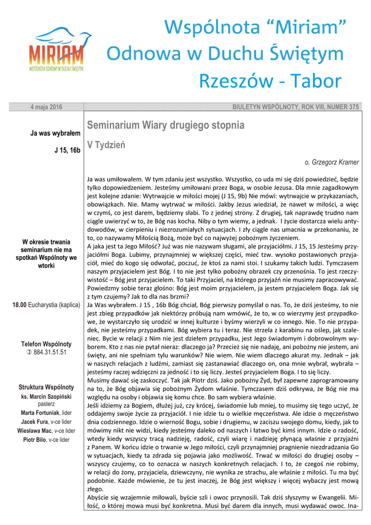 4 maja 2016 Ja was wybrałem J 15, 16b BIULETYN WSPÓLNOTY, ROK VIII, NUMER 375 Seminarium Wiary drugiego stopnia V Tydzień o. Grzegorz Kramer W okresie trwania seminarium nie ma spotkań Wspólnoty we wtorki 18.00 Eucharystia (kaplica) Telefon Wspólnoty 884.31.51.51 Struktura Wspólnoty ks. Marcin Szopiński pasterz Marta Fortuniak, lider Jacek Fura, v-ce lider Wiesława Mac, v-ce lider Piotr Bilo, v-ce lider Ja was umiłowałem. W tym zdaniu jest wszystko. Wszystko, co uda mi się dziś powiedzieć, będzie tylko dopowiedzeniem. Jesteśmy umiłowani przez Boga, w osobie Jezusa. Dla mnie zagadkowym jest kolejne zdanie: Wytrwajcie w miłości mojej (J 15, 9b) Nie mówi: wytrwajcie w przykazaniach, obowiązkach. Nie. Mamy wytrwać w miłości. Jakby Jezus wiedział, że nawet w miłości, a więc w czymś, co jest darem, będziemy słabi. To z jednej strony. Z drugiej, tak naprawdę trudno nam ciągle uwierzyć w to, że Bóg nas kocha. Niby o tym wiemy, a jednak. I życie dostarcza wielu antydowodów, w cierpieniu i niezrozumiałych sytuacjach. I zły ciągle nas umacnia w przekonaniu, że to, co nazywamy Miłością Bożą, może być co najwyżej pobożnym życzeniem. A jaka jest ta Jego Miłość? Już was nie nazywam sługami, ale przyjaciółmi. J 15, 15 Jesteśmy przyjaciółmi Boga. Lubimy, przynajmniej w większej części, mieć tzw. wysoko postawionych przyjaciół, mieć do kogo się odwołać, poczuć, że ktoś za nami stoi. I szukamy takich ludzi. Tymczasem naszym przyjacielem jest Bóg. I to nie jest tylko pobożny obrazek czy przenośnia. To jest rzeczywistość – Bóg jest przyjacielem. To taki Przyjaciel, na którego przyjaźń nie musimy zapracowywać. Powiedzmy sobie teraz głośno: Bóg jest moim przyjacielem, ja jestem przyjacielem Boga. Jak się z tym czujemy? Jak to dla nas brzmi? Ja Was wybrałem. J 15 , 16b Bóg chciał, Bóg pierwszy pomyślał o nas. To, że dziś jesteśmy, to nie jest zbieg przypadków jak niektórzy próbują nam wmówić, że to, w co wierzymy jest przypadkowe, że wystarczyło się urodzić w innej kulturze i byśmy wierzyli w co innego. Nie. To nie przypadek, nie jesteśmy przypadkami. Bóg wybiera tu i teraz. Nie strzela z karabinu na oślep, jak szaleniec. Bycie w relacji z Nim nie jest dziełem przypadku, jest Jego świadomym i dobrowolnym wyborem. Kto z nas nie pytał nieraz: dlaczego ja? Przecież się nie nadaję, ani pobożny nie jestem, ani święty, ani nie spełniam tylu warunków? Nie wiem. Nie wiem dlaczego akurat my. Jednak – jak w naszych relacjach z ludźmi, zamiast się zastanawiać dlaczego on, ona mnie wybrał, wybrała – jesteśmy raczej wdzięczni za jedność i to się liczy. Jesteś przyjacielem Boga. I to się liczy. Musimy dawać się zaskoczyć. Tak jak Piotr dziś. Jako pobożny Żyd, był zapewne zaprogramowany na to, że Bóg objawia się pobożnym Żydom właśnie. Tymczasem dziś odkrywa, że Bóg nie ma względu na osoby i objawia się komu chce. Bo sam wybiera właśnie. Jeśli idziemy za Bogiem, dłużej już, czy krócej, świadomie lub mniej, to musimy się tego uczyć, że oddajemy swoje życie za przyjaciół. I nie idzie tu o wielkie męczeństwa. Ale idzie o męczeństwo dnia codziennego. Idzie o wierność Bogu, sobie i drugiemu, w zaciszu swojego domu, kiedy, jak to mówimy nikt nie widzi, kiedy jesteśmy daleko od naszych i łatwo być kimś innym. Idzie o radość, wtedy kiedy wszyscy tracą nadzieję, radość, czyli wiarę i nadzieję płynącą właśnie z przyjaźni z Panem. W końcu idzie o trwanie w Jego miłości, czyli przynajmniej pragnienie niezdradzania Go w sytuacjach, kiedy ta zdrada się pojawia jako możliwość. Trwać w miłości do drugiej osoby – wszyscy czujemy, co to oznacza w naszych konkretnych relacjach. I to, że czegoś nie robimy, w relacji do żony, przyjaciela, dziewczyny, nie wynika ze strachu, ale właśnie z miłości. Tu ma być podobnie. Każde mówienie, że tu jest inaczej, że Bóg jest większy i więcej wybaczy jest mową złego. Abyście się wzajemnie miłowali, byście szli i owoc przynosili. Tak dziś słyszymy w Ewangelii. Miłość, o której mowa musi być konkretna. Musi być darem dla innych, musi wydawać owoc. Ina- Animatorzy diakonii Alicja Smalarz diakonia adoracyjna Marta Fortuniak diakonia prorocka Jacek Fura diakonia modlitwy wstawienniczej i uwolnienia Marta Fortuniak diakonia nauczania Jolanta Skotnicka diakonia uwielbienia Ewa Kruczek diakonia miłosierdzia Wiesława Mac diakonia organizacyjna Paweł Wiśniowski diakonia technicznoporządkowa Klaudia Winiarska diakonia medialna Maria Bassara diakonia modlitwy osłonowej Paweł Kobosz diakonia modlitwy w nagłych potrzebach Maria Hubert diakonia modlitwy za kapłanów Marek Wiśniewski diakonia liturgiczna Piotr Bilo diakonia ewangelizacyjna Maciej Mierzejewski diakonia prowadzenia spotkań czej jest tylko produktem medialnym, jaki widzimy choćby w reklamach, filmach, gdzie pojawia się szybko i dość szybko przemija. Choć trzeba przyznać, że nawet filmy mają dobra intuicję, równając miłość z namiętnością. W miłości musi być namiętność, pasja. Tylko, że nie dla samej siebie, nie dla przyjemności. Jezus mówi jak Ja was umiłowałem. On miał pasję miłości do nas. Aż do końca, aż do wydania owocu. Nie bój się zaszaleć dla tej miłości. Nie wiemy gdzie nas ona zaprowadzi. Wejść w miłość, wejść z przekonaniem, że nie jest to przypadek, a Jego wybór – to jest dość niebezpieczne. Bóg zaprasza do przyjaźni i miłości, ale to nie jest brazylijski serial, to życie, które wymaga od nas radykalizmu, wymaga od nas konkretnego sprzeciwiania się złu i bylejakości. Na każdym odcinku naszego życia. Na niebawieniu się drugim człowiekiem, jego emocjami. Wejście w przyjaźń z takim przyjacielem jest życiem – cały czas – na wysokich obrotach. Do końca. Na dziś, takim polem do radykalnej miłości mogą być wybory. Nie chodzi mi o 