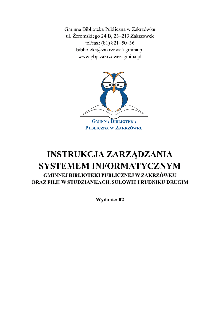 Gminna Biblioteka Publiczna w Zakrzówku ul. Żeromskiego 24 B, 23–213 Zakrzówek tel/fax: (81) 821–50–36 [email protected] www.gbp.zakrzowek.gmina.pl INSTRUKCJA ZARZĄDZANIA SYSTEMEM INFORMATYCZNYM GMINNEJ BIBLIOTEKI PUBLICZNEJ W ZAKRZÓWKU ORAZ FILII W STUDZIANKACH, SULOWIE I RUDNIKU DRUGIM Wydanie: 02 INSTRUKCJA ZARZĄDZANIA SYSTEMEM INFORMATYCZNYM GMINNEJ BIBLIOTEKI PUBLICZNEJ W ZAKRZÓWKU ORAZ FILII W STUDZIANKACH, SULOWIE I RUDNIKU DRUGIM Obowiązuje od: 01 lutego 2015 r. Wydanie: 02 Strona 2 z 5 INSTRUKCJA ZARZĄDZANIA SYSTEMEM INFORMATYCZNYM Administrator Danych: Teresa Stankiewicz, Dyrektor Gminnej Biblioteki Publicznej w Zakrzówku dnia 01 lutego 2015 r. zgodnie z Rozporządzeniem Ministra Spraw Wewnętrznych i Administracji z dnia 29 kwietnia 2004 r. w sprawie dokumentacji przetwarzania danych osobowych oraz warunków technicznych i organizacyjnych, jakim powinny odpowiadać urządzenia i systemy informatyczne służące do przetwarzania danych osobowych wdraża dokument o nazwie „Instrukcja zarządzania systemem informatycznym” zwany dalej „Instrukcją”. Zapisy tego dokumentu wchodzą w życie z dniem wdrożenia. Ilekroć w „Instrukcji” jest mowa o: 1) ustawie – rozumie się przez to ustawę z dnia 29 sierpnia 1997 r. o ochronie danych osobowych, zwaną dalej „ustawą"; 2) identyfikatorze użytkownika – rozumie się przez to ciąg znaków literowych, cyfrowych lub innych jednoznacznie identyfikujący osobę upoważnioną do przetwarzania danych osobowych w systemie informatycznym; 3) haśle – rozumie się przez to ciąg znaków literowych, cyfrowych lub innych, znany jedynie osobie uprawnionej do pracy w systemie informatycznym; 4) sieci telekomunikacyjnej – rozumie się przez to sieć telekomunikacyjną w rozumieniu art. 2 pkt 23 ustawy z dnia 21 lipca 2000 r. – Prawo telekomunikacyjne (Dz. U. Nr 73, poz. 852, z późn. zm.) 5) sieci publicznej – rozumie się przez to sieć publiczną w rozumieniu art. 2 pkt 22 ustawy z dnia 21 lipca 2000 r. – Prawo telekomunikacyjne; 6) teletransmisji – rozumie się przez to przesyłanie informacji za pośrednictwem sieci telekomunikacyjnej 7) rozliczalności – rozumie się przez to właściwość zapewniającą, że działania podmiotu mogą być przypisane w sposób jednoznaczny tylko temu podmiotowi; 8) integralności danych – rozumie się przez to właściwość zapewniającą, że dane osobowe nie zostały zmienione lub zniszczone w sposób nieautoryzowany; 9) raporcie – rozumie się przez to przygotowane przez system informatyczny zestawienia zakresu i treści przetwarzanych danych; 10) poufności danych – rozumie się przez to właściwość zapewniającą, że dane nie są udostępniane nieupoważnionym podmiotom; 11) uwierzytelnianiu – rozumie się przez to działanie, którego celem jest weryfikacja deklarowanej tożsamości podmiotu. § 1. Za przestrzeganie w Gminnej Bibliotece Publicznej w Zakrzówku zapisów „Instrukcji” odpowiedzialny jest Administrator Danych lub zgodnie z zapisem §2 „Polityki Bezpieczeństwa” wyznaczony Administrator Bezpieczeństwa Informacji. § 2. W związku z tym, że w Gminnej Bibliotece Publicznej w Zakrzówku przynajmniej jedno urządzenie systemu informatycznego, służącego do przetwarzania danych osobowych, połączone jest z siecią publiczną, oraz uwzględniając kategorie przetwarzanych danych Niniejszy dokument zatwierdzono do stosowania w Gminnej Bibliotece Publicznej w Zakrzówku. INSTRUKCJA ZARZĄDZANIA SYSTEMEM INFORMATYCZNYM GMINNEJ BIBLIOTEKI PUBLICZNEJ W ZAKRZÓWKU ORAZ FILII W STUDZIANKACH, SULOWIE I RUDNIKU DRUGIM Obowiązuje od: 01 lutego 2015 r. Wydanie: 02 Strona 3 z 5 i zagrożenia wprowadza się poziom bezpieczeństwa przetwarzania danych osobowych w systemie informatycznym na poziomie wysokim, a w związku z tym wprowadza się poniższe postanowienia: I Obszar, w który są przetwarzane dane, zabezpiecza się przed dostępem osób nieuprawnionych na czas nieobecności w nim osób upoważnionych do przetwarzania danych osobowych. Przebywanie osób nieuprawnionych w obszarze, w którym są przetwarzane dane, jest dopuszczalne za zgodą Administratora Danych, Administratora Bezpieczeństwa Informacji lub w obecności osoby upoważnionej do przetwarzania danych osobowych. II 1) W systemie informatycznym służącym do przetwarzania danych osobowych, przetwarzać dane mogą wyłącznie osoby posiadające aktualne upoważnienie nadane przez Administratora Bezpieczeństwa Informacji. Użytkownik przetwarzający dane po otrzymaniu upoważnienia oraz identyfikatora użytkownika i hasła jest zobowiązany niezwłocznie dokonać zmiany hasła oraz zachować je w tajemnicy. 2) Użytkownik jest zobowiązany do zmiany hasła nie rzadziej niż co 30 dni. Hasło nadane przez użytkownika musi składać się z co najmniej z 8 znaków, zawierać małe i wielkie litery oraz cyfry lub znaki specjalne. 3) Jeżeli dostęp do danych przetwarzanych w systemie informatycznym posiadają co najmniej dwie osoby, wówczas zapewnia się, aby w systemie tym rejestrowany był dla każdego użytkownika odrębny identyfikator oraz aby dostęp do danych był możliwy wyłącznie po wprowadzeniu identyfikatora i dokonaniu uwierzytelnienia. III System informatyczny służący do przetwarzania danych osobowych zabezpiecza się, w szczególności przed: 1) działaniem oprogramowania, którego celem jest uzyskanie nieuprawnionego dostępu do systemu informatycznego poprzez zainstalowanie programu antywirusowego o nazwie COMODO Antivirus, poprzez zainstalowanie firewalla (zapory sieciowej), poprzez zabezpieczenie sieci radiowej odpowiedniej mocy uwierzytelnieniem. 2) utratą danych spowodowaną awarią zasilania lub zakłóceniami w sieci zasilającej poprzez zastosowanie zasilacza awaryjnego UPS. 1) 2) 3) 4) IV Identyfikator użytkownika, który utracił uprawnienia do przetwarzania danych, nie może być przydzielony innej osobie. W przypadku gdy do uwierzytelni