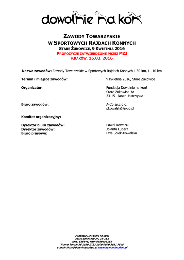 ZAWODY TOWARZYSKIE W SPORTOWYCH RAJDACH KONNYCH STARE ŻUKOWICE, 9 KWIETNIA 2016 PROPOZYCJE ZATWIERDZONE PRZEZ MZJ KRAKÓW, 16.03. 2016 Nazwa zawodów: Zawody Towarzyskie w Sportowych Rajdach Konnych L 30 km, LL 10 km Termin i miejsce zawodów: 9 kwietnia 2016, Stare Żukowice Organizator: Fundacja Dowolnie na koń! Stare Żukowice 3A 33-151 Nowa Jastrząbka Biuro zawodów: A-Co sp.z.o.o. [email protected] Komitet organizacyjny: Dyrektor biura zawodów: Dyrektor zawodów: Biuro prasowe: Paweł Kowalski Jolanta Lubera Ewa Sołek-Kowalska Fundacja Dowolnie na koń! Stare Żukowice 3A, 33-151 KRS: 536846; NIP: 9930656165 Numer konta: 56 1050 1722 1000 0090 3051 7545 e-mail: [email protected] www.dowolnienakon.pl PRZEPISY OGÓLNE Zawody odbywają się w oparciu o obowiązujące przepisy i regulaminy PZJ oraz według niniejszych propozycji. OSOBY OFICJALNE - Zawody Towarzyskie Komisja sędziowska Sędzia Główny Gospodarz toru Grażyna Kańka Eulalia Michalik Anna Hadała Paweł Kowalski Komisja weterynaryjna Przewodniczący lek. wet. Jacek Kańka POL Komisja sędziowska Marek Tischner Paulina Zdrojewska Lekarz weterynarii zawodów Marek Tischner Zabezpieczenie medyczne zawodów i lekarz dla Kolumna Transportu zawodników Tarnowie Serwis kowalski Tomasz Kowal Fundacja Dowolnie na koń! Stare Żukowice 3A, 33-151 KRS: 536846; NIP: 9930656165 Numer konta: 56 1050 1722 1000 0090 3051 7545 e-mail: [email protected] www.dowolnienakon.pl Sanitarnego w PROGRAM ZAWODÓW Sobota 9.04.2016 Godzina 10.00 – przegląd weterynaryjny Godzina 10.30 – odprawa techniczna Konkurs Dzień startu Przewidywana Godzina Startu Miejsce zawodów ZT L 30 km 9.04.2016 11.15 Stare Żukowice ZT LL 10 km 9.04.2016 11.30 Stare Żukowice Godziny rozpoczęcia konkursów mogą zostać zmienione na odprawie technicznej. Zakończenie zawodów i uroczyste ogłoszenie wyników godz. 16:30 INFORMACJA O TRASIE Opis trasy: zawody rozgrywane będą na terenach Płaskowyżu Tarnowskiego. Start i meta: Stare Żukowice, obok ośrodka Ranczo Palomino. Trasa przebiega terenem nizinnym, częściowo zalesionym Podłoże - drogi leśne, polne, piaszczyste, dłuższe odcinki dróg bitych, utwardzonych, szutrowych, odcinki asfaltu. Różnica wzniesień: 5-30 metrów. Dwie pętle o długości 10 km i 20 km. Mapa dostępna będzie na stronie internetowej www.dowolnienakon.pl ŚWIADCZENIA Zakwaterowanie: zakwaterowania: Noclegi proszę rezerwować indywidualnie. Możliwe miejsca Gospodarstwo Agroturystyczne " Jaś i Małgosia" Stare Żukowice 3, 33 - 151 Nowa Jastrząbka, tel. +48 14 678 68 24 Ranczo Palomino, Stare Żukowice 3A, 33-151 Nowa Jastrząbka, tel. +48 602491343 Roleski Ranch, Stare Żukowice 1A, 33-151 Nowa Jastrząbka, tel. +48 14 678 67 00 Hotel „Tarnovia”, ul. Kościuszki, Tarnów tel. 14 630 03 50 Hotel Wesoła, Nowa Jastrząbka 92A, 33-151 Nowa Jastrząbka, tel. 14 678 62 14 Organizator zapewnia drobny poczęstunek. Możliwe wyżywienie we własnym zakresie na terenie ośrodka Roleski Ranch. Możliwość przyjazdu 8 kwietnia 2016. Boksy dostępnie w ośrodku Roleski Ranch. W zgłoszeniu proszę wpisać informację o rezerwacji boksów. Opłata za boks: 100 zł/doba Fundacja Dowolnie na koń! Stare Żukowice 3A, 33-151 KRS: 536846; NIP: 9930656165 Numer konta: 56 1050 1722 1000 0090 3051 7545 e-mail: [email protected] www.dowolnienakon.pl Ilość boksów ograniczona. Decyduje kolejność zgłoszeń. ZGŁOSZENIA WAŻNE!!! Zgłoszenia przyjmowane są wyłącznie drogą elektroniczną. Formularz zgłoszeniowy dostępny jest na stronie www.dowolnienakon.pl Zgłoszenia muszą zawierać komplet informacji dotyczących zawodnika, konia i niezbędnych kwalifikacji do danych konkursów. Zgłoszenia niekompletne lub zgłoszone inną drogą nie będą przyjmowane. Elektroniczne formularze zgłoszeń zostaną uruchomione 22.03.2016. Zgłoszenia przyjmowane wyłącznie do 7.04.2016 Opłaty: Opłata startowa: 100 zł Po każdych zawodach (na podstawie list startowych) organizator przekazuje uzbieraną kwotę do 2 tygodni na konto MZJ. Za potwierdzone Organizator uznaje wyłącznie zgłoszenie wraz z wpłatą na konto Fundacji w wysokości 50 zł (50% całości opłaty startowej) w terminie do 7.04.2016. Fundacja Dowolnie na koń! Stare Żukowice 3A, 33-151 KRS: 536846; NIP: 9930656165 Numer konta: 56 1050 1722 1000 0090 3051 7545 Potwierdzenie wpłaty zawodnik musi posiadać podczas rejestracji na zawodach odbierając numer startowy. Telefon kontaktowy: 602 491 343, 601 822 454 WARUNKI TECHNICZNE Obowiązuje dokumentacja dla zawodników i koni zgodna z przepisami PZJ w dyscyplinie sportowe rajdy konne oraz przepisami ogólnymi PZJ. W przypadku braku dokumentacji jeźdźca lub konia para ta może zostać niedopuszczona do zawodów. WAŻNE !!!: Niezwłocznie po przybyciu na miejsce zawodów zawodnicy zobowiązani są do zarejestrowania się w Biurze Zawodów, mieszczącym się przy bramce weterynaryjnej, dopełniając wszystkich niezbędnych formalności (przekazanie dokumentów, dokonanie płatności pozostałych 50 zł wpisowego za udział w zawodach). Po dokonaniu ostatecznej rejestracji w Biurze Zawodów zawodnicy otrzymają numery startowe. Osoby, które nie dopełnią ww. formalności nie zostaną dopuszczone do przeglądu weterynaryjnego. W czasie rajdu i treningów przed zawodami zawodnika obowiązuje twarde nakrycie głowy. Fundacja Dowolnie na koń! Stare Żukowice 3A, 33-151 KRS: 536846; NIP: 9930656165 Numer konta: 56 1050 1722 1000 0090 3051 7545 e-mail: [email protected] www.dowolnienakon.pl Zawodnicy startujący w zawodach krajowych muszą posiadać dokumenty zgodne z przepisami PZJ lub WZJ. Szczepienia ochronne przeciwko grypie koni. Obowiązuje następujący schemat szczepień: a. szczepienie podstawowe: pierwsze szczepienie – w dniu rozpoczęcia szczepień drugie szczepienie – nie wcześniej niż 21-go dnia i nie później niż 92 dnia od pierwszego szczepienia. b. szczepienie przypominające: co 6 miesięcy od ostatni