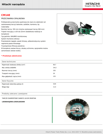 Hitachi narzędzia CM14E PRZECINARKA SPALINOWA Profesjonalna przecinarka spalinowa do cięcia (w zależności od zastosowanej tarczy) betonów, asfaltów, kamienia, itp. materiałów Rozmiar tarczy: 355 mm (można zastosować tarczę 300 mm) Trzpień mocujący: ø 20 lub 22mm (dodatkowa redukcja w komplecie) Typ gaźnika: WALBRO membranowy System tłumienia wibracji Przeniesienie napędu: pasek klinowy, półautomatyczny system napinania paska klinowego Trzystopniowa filtracja powietrza W komplecie zastaw kluczy, okulary ochronne, opcjonalnie można zamontować zestaw wodny * Produkcja zakończona Dane techniczne Pojemność skokowa silnika (cm3) 66,7 Moc silnika (kW/KM) 3/4,2 Rozmiar tarczy (mm) 355 Trzepień mocujący (mm) 20 Max głębokość cięcia (mm) 125 Dane fizyczne Pojemność zbiornika paliwa (l) 0,64 Waga (kg) 11,5 Produkty zalecane / powiązane TARCZE DIAMENTOWE SANKYO LW-SR SPARTAN LWSR045J998-LWSR160S999 Hitachi Power Tools Polska Sp. z o.o. 2013-2017 © Wszelkie prawa zastrzeżone.
